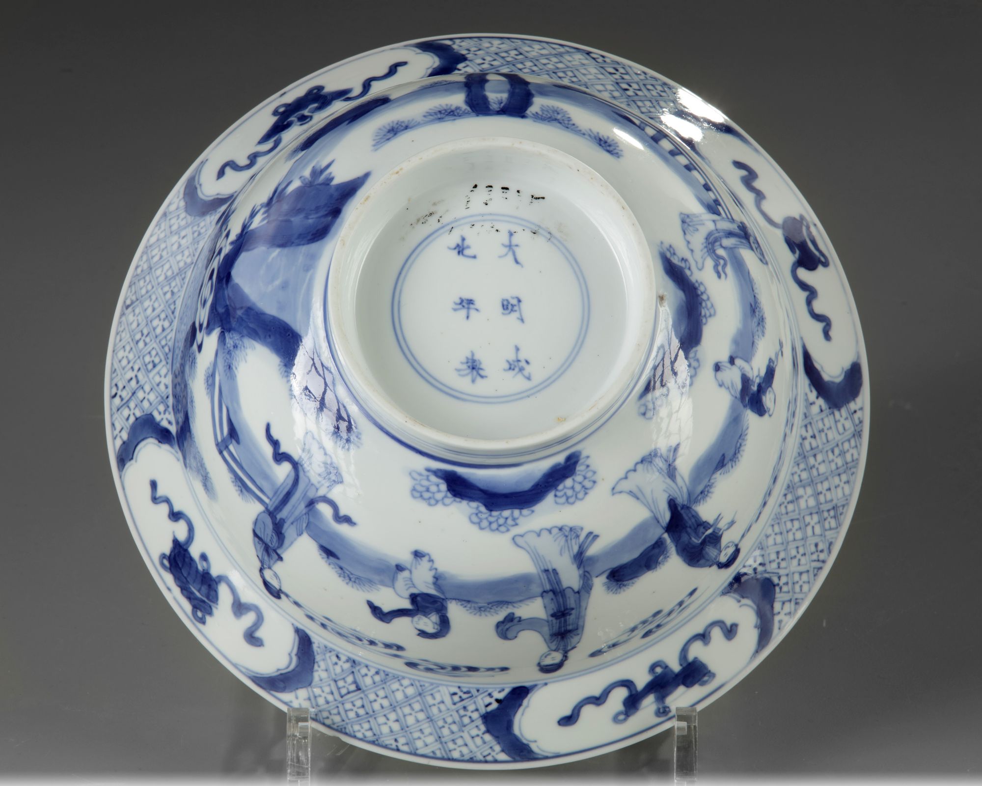 The bowl is decorated with a continuous scene of ladies and boys, below a diaper band with cartouches enclosing beribonned precious objects. The interior is decorated with boys at play in a fenced garden surrounded by a further diaper band with cartouches. The base has an apocryphal Chenghua mark in underglaze blue.