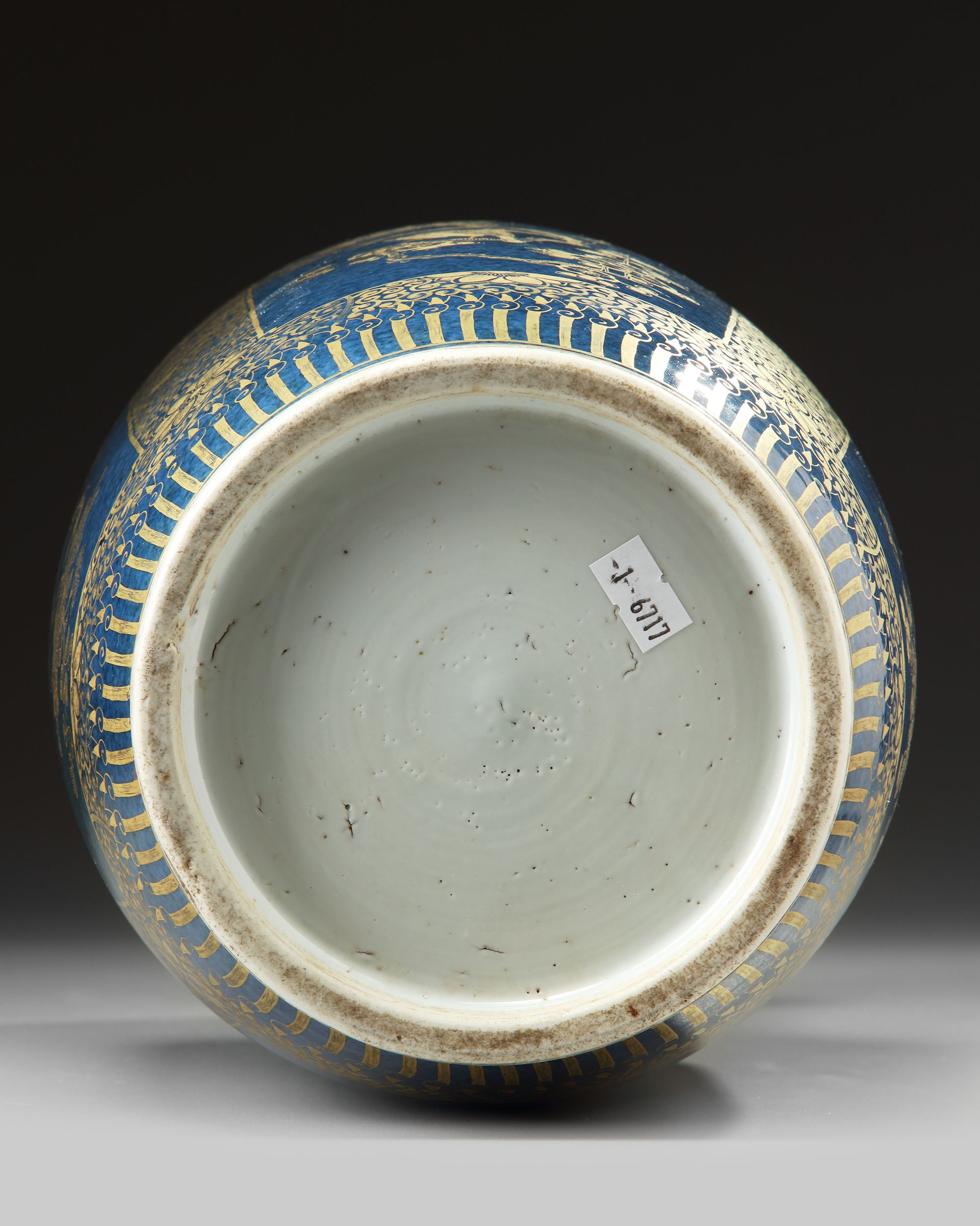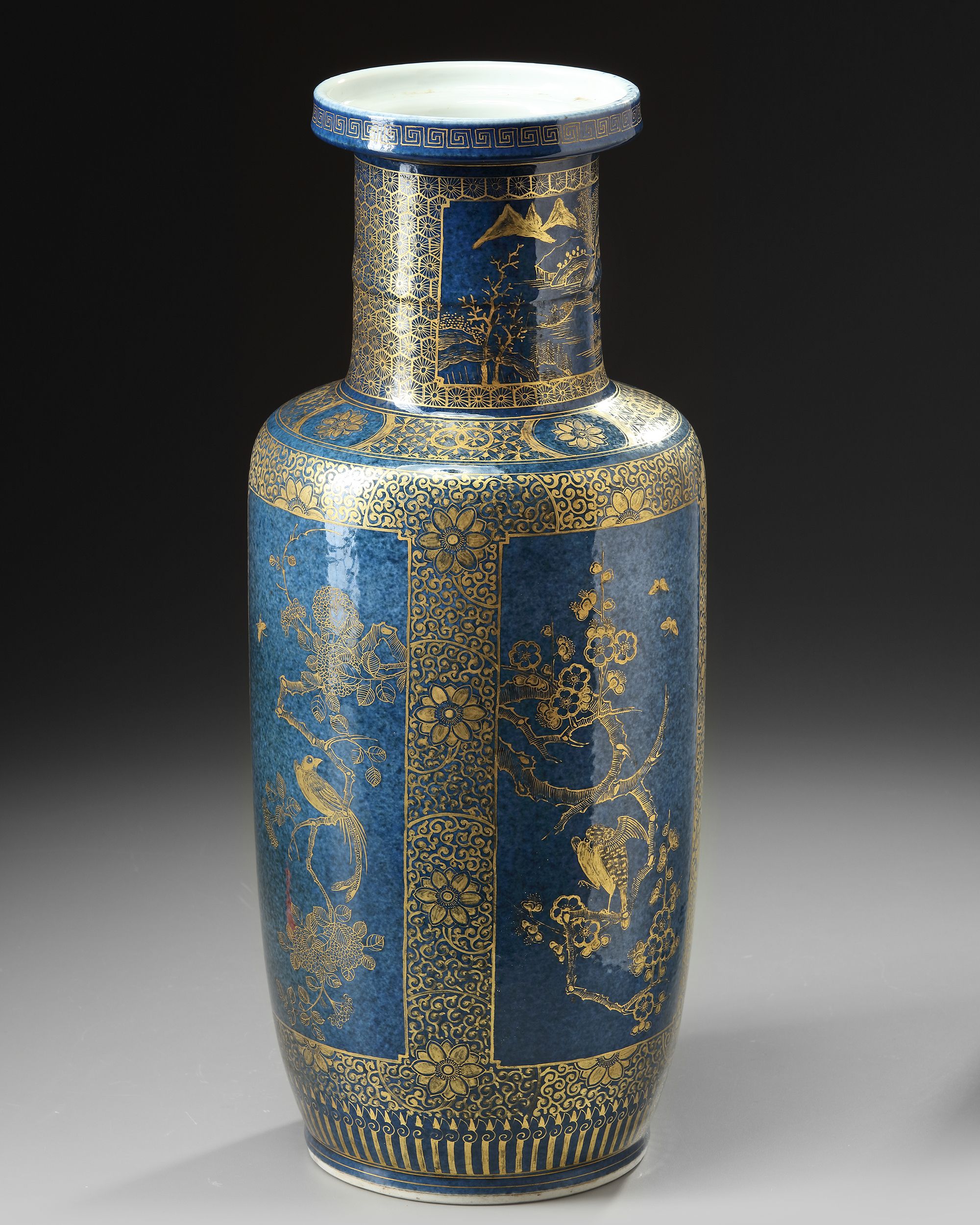 A Chinese powder blue rouleau vase, gilt with panels enclosing a bird perched on a flower branch, interspersed with flowers and scrolls.