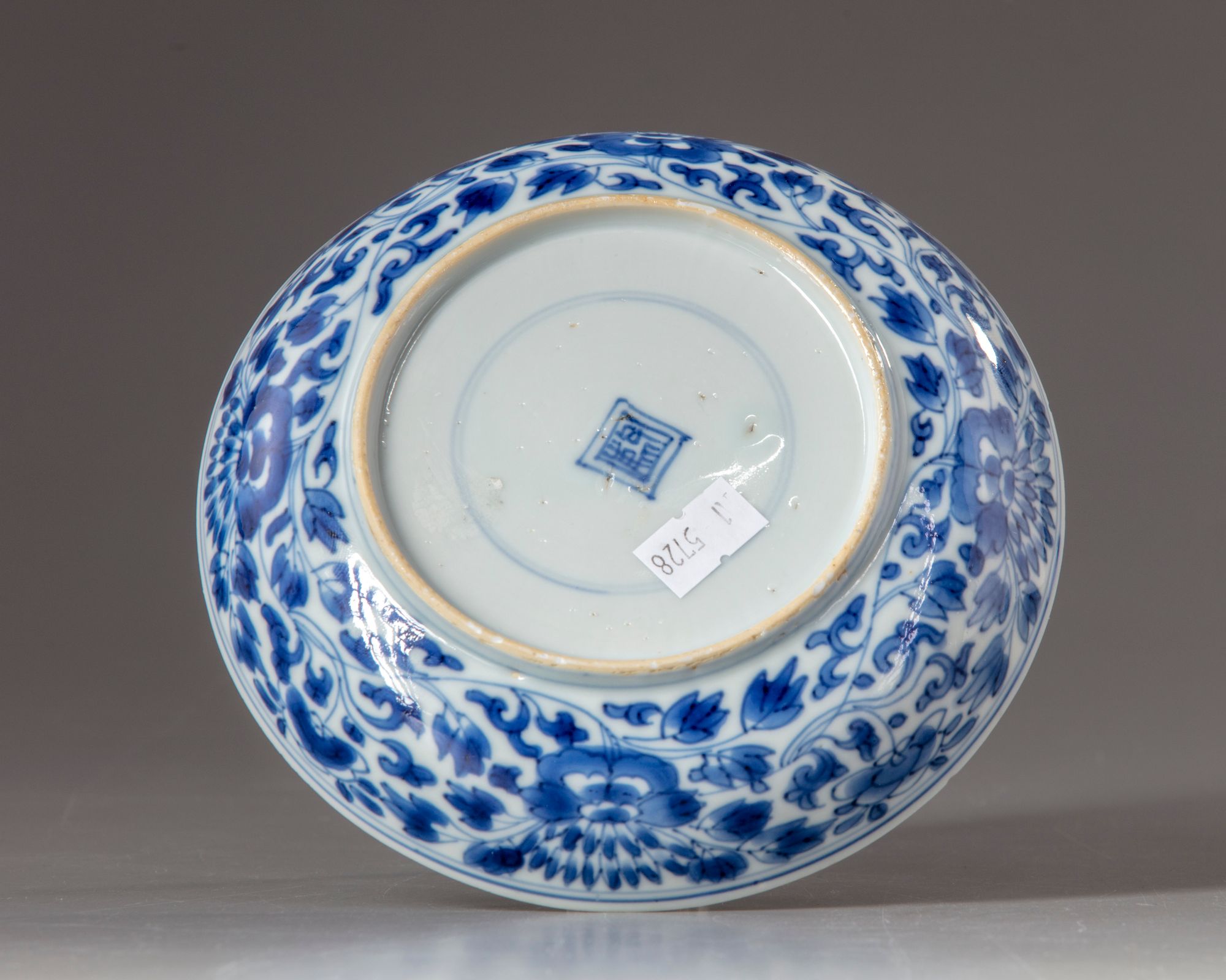 A Chinese porcelain dish, decorated in cobalt-blue with a dense design of lotus scrolls and foliage.