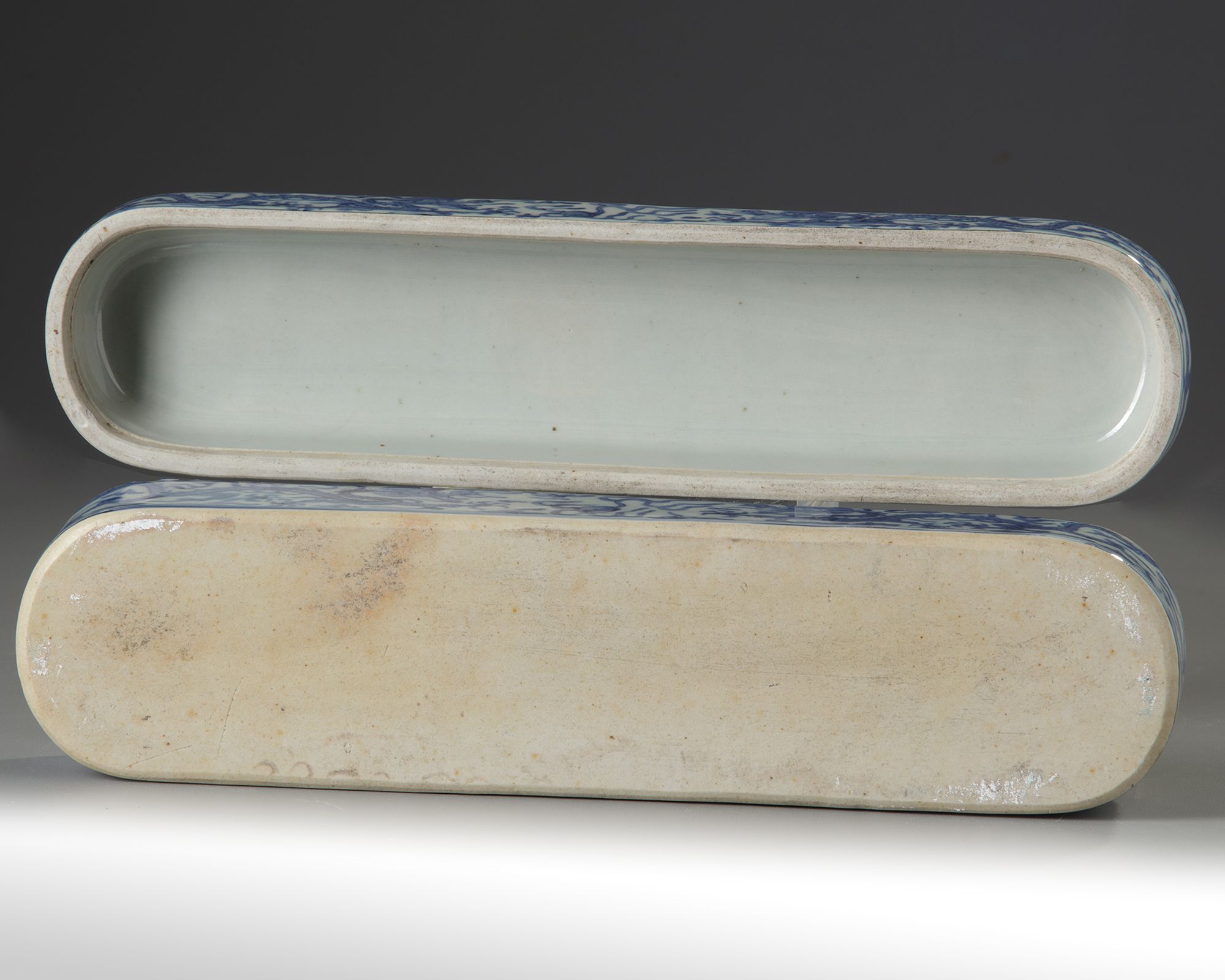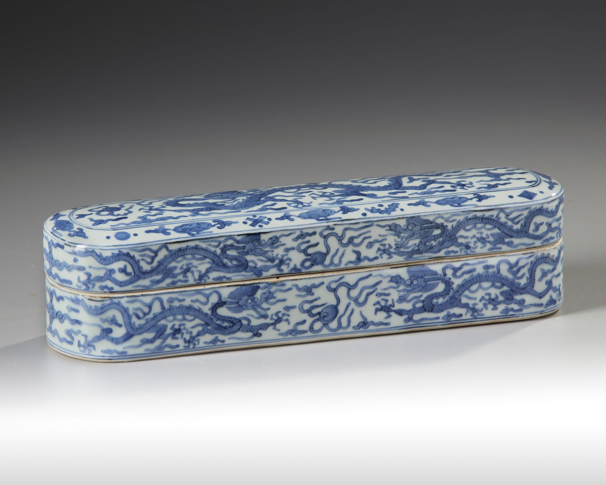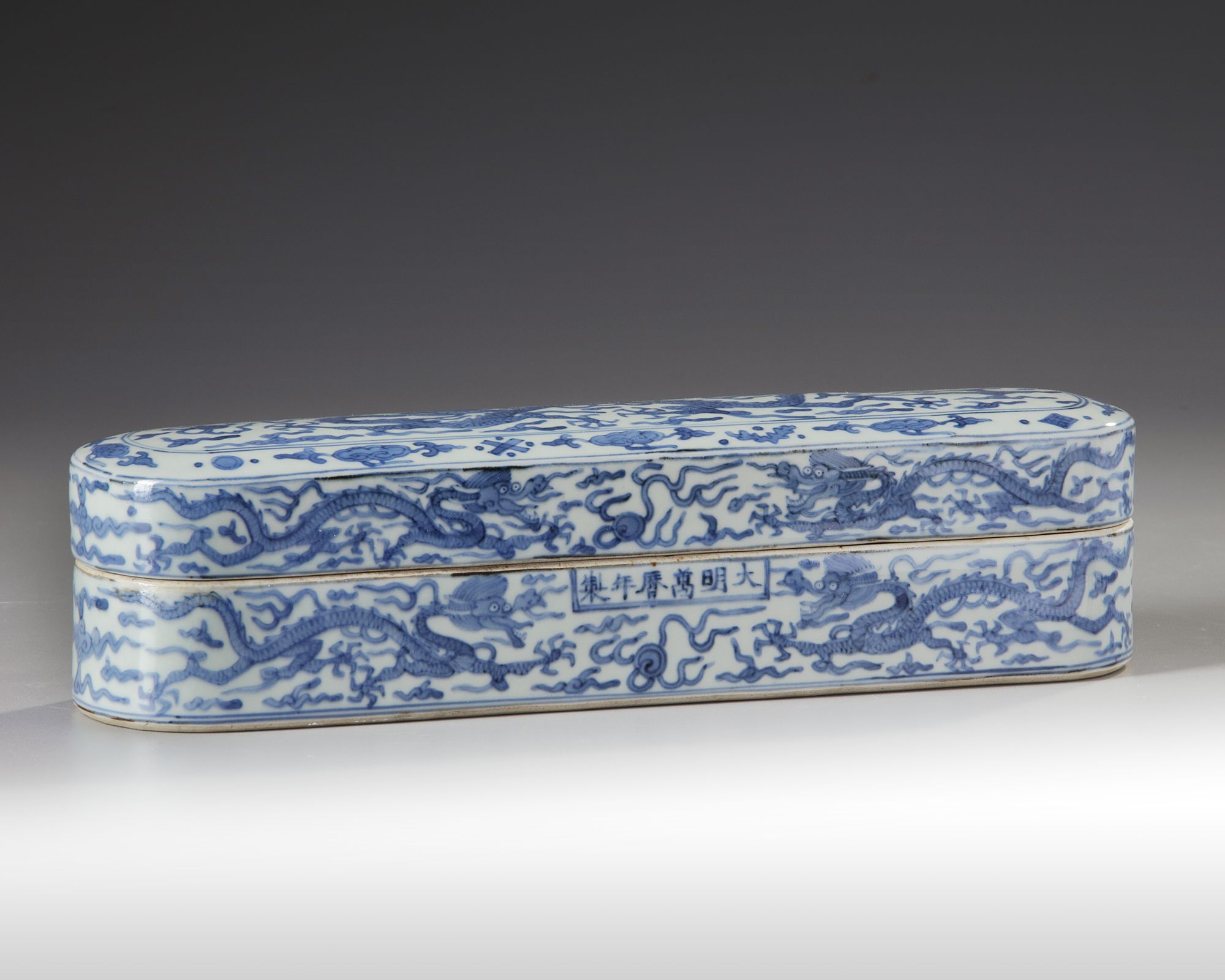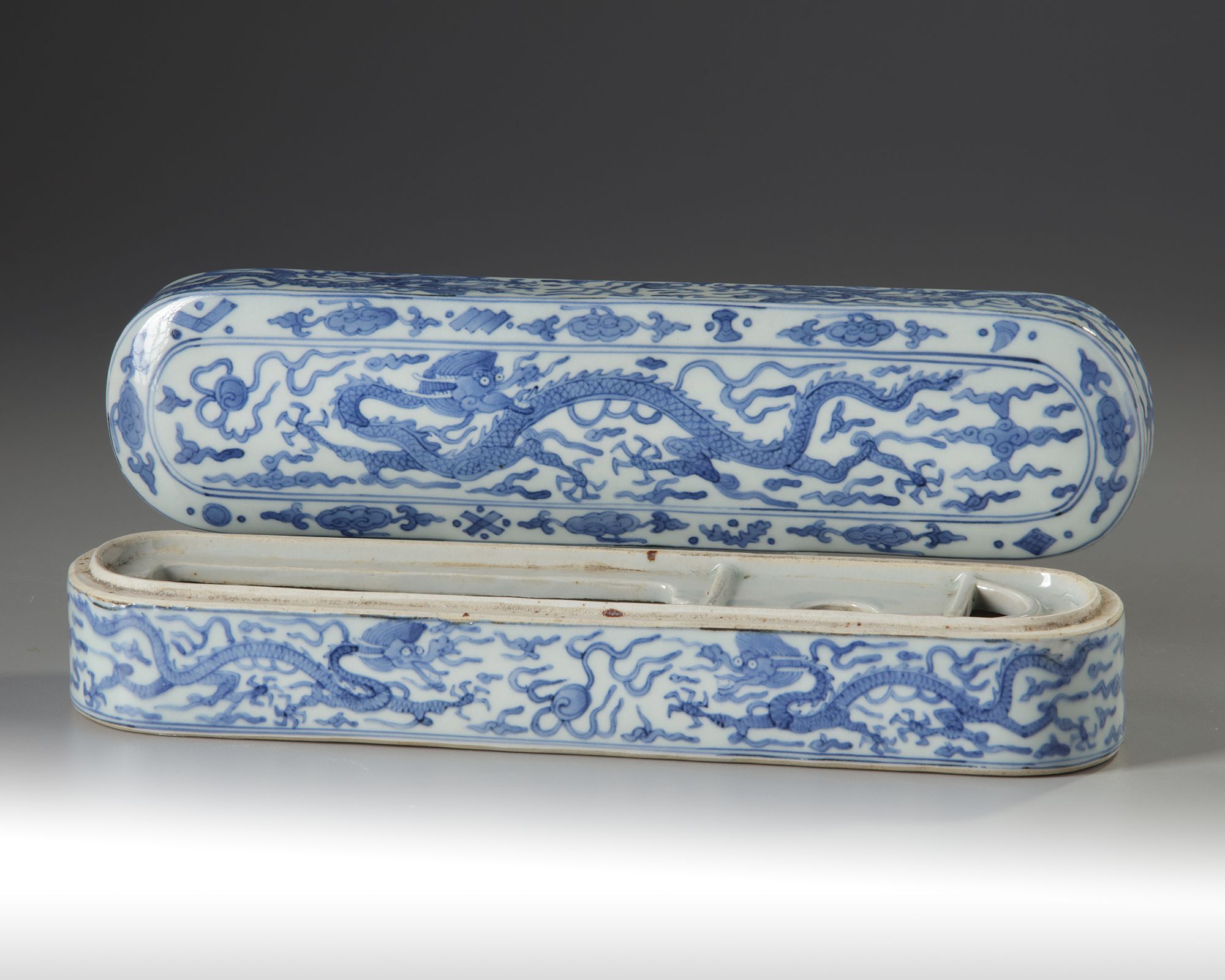 The elongated box cover and sides are decorated with dragons striding amongst cloud and flame scrolls chasing the flaming pearl. An apocryphal Wanli mark is placed just at the rim. The interior of the box base is separated into separate compartments for writing materials. 33 by 8 cm.