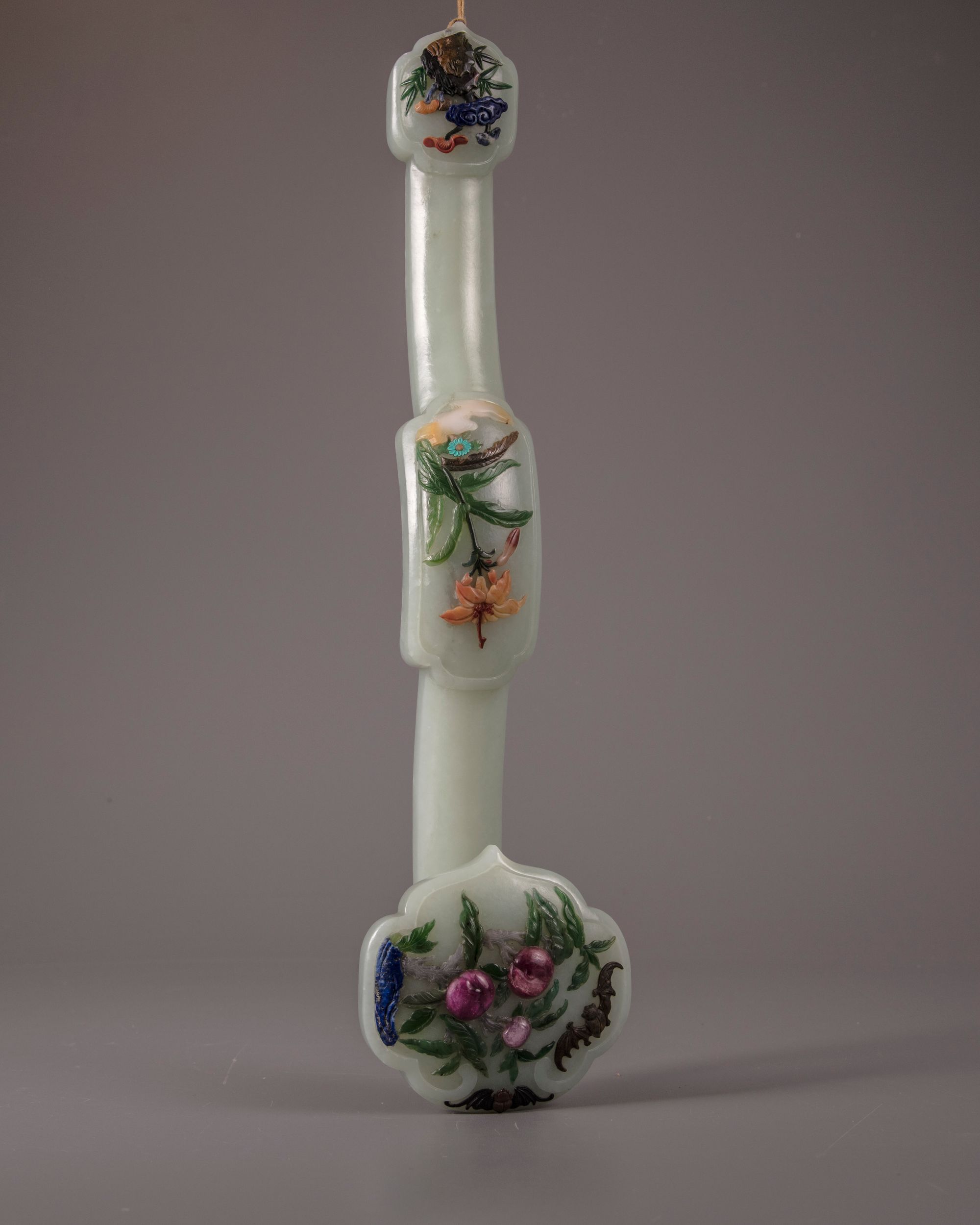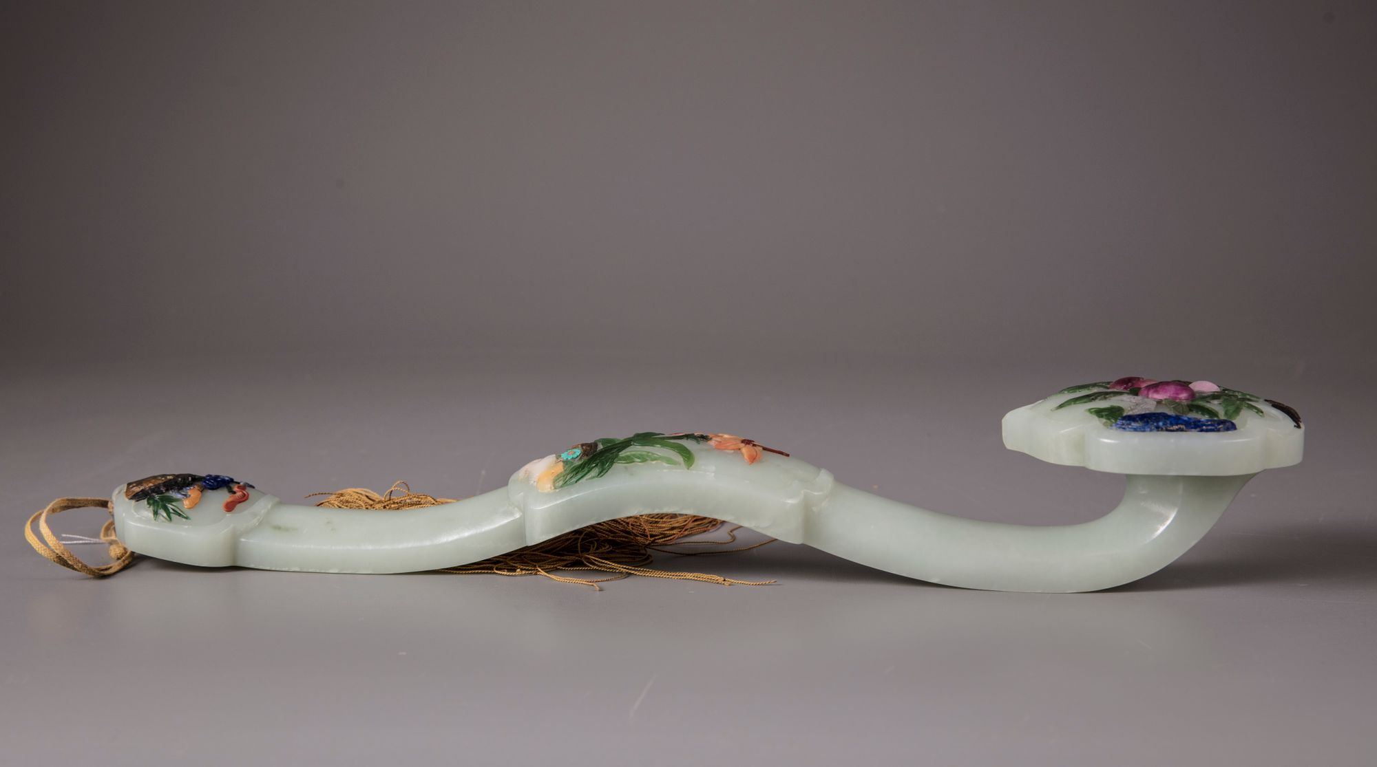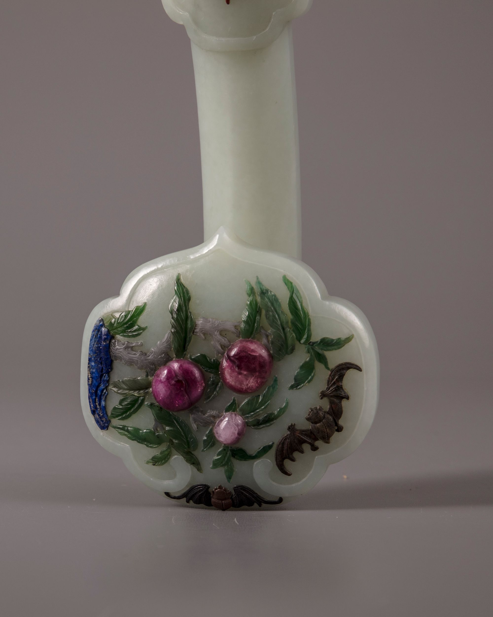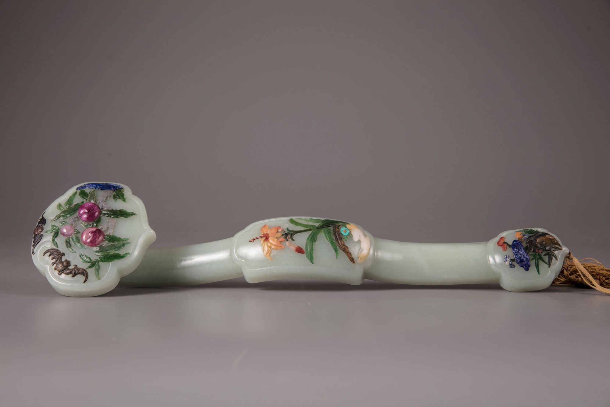The thickly carved sceptre is decorated to the ruyi-shaped head with tourmaline, lapis lazuli, and soapstone inlay depicting two bats in flight above peaches on the branch. The elongated quatrefoil middle section is decorated with a leafy lily in agate and a turquoise aster, and the shaped end section of the sceptre is decorated with lingzhi fungus growing from a rocky base crafted from various hardstones. The reverse with an incised and gilt apocryphal Qianlong seal mark. The stone is of an even pale celadon tone with light veins and inclusions.