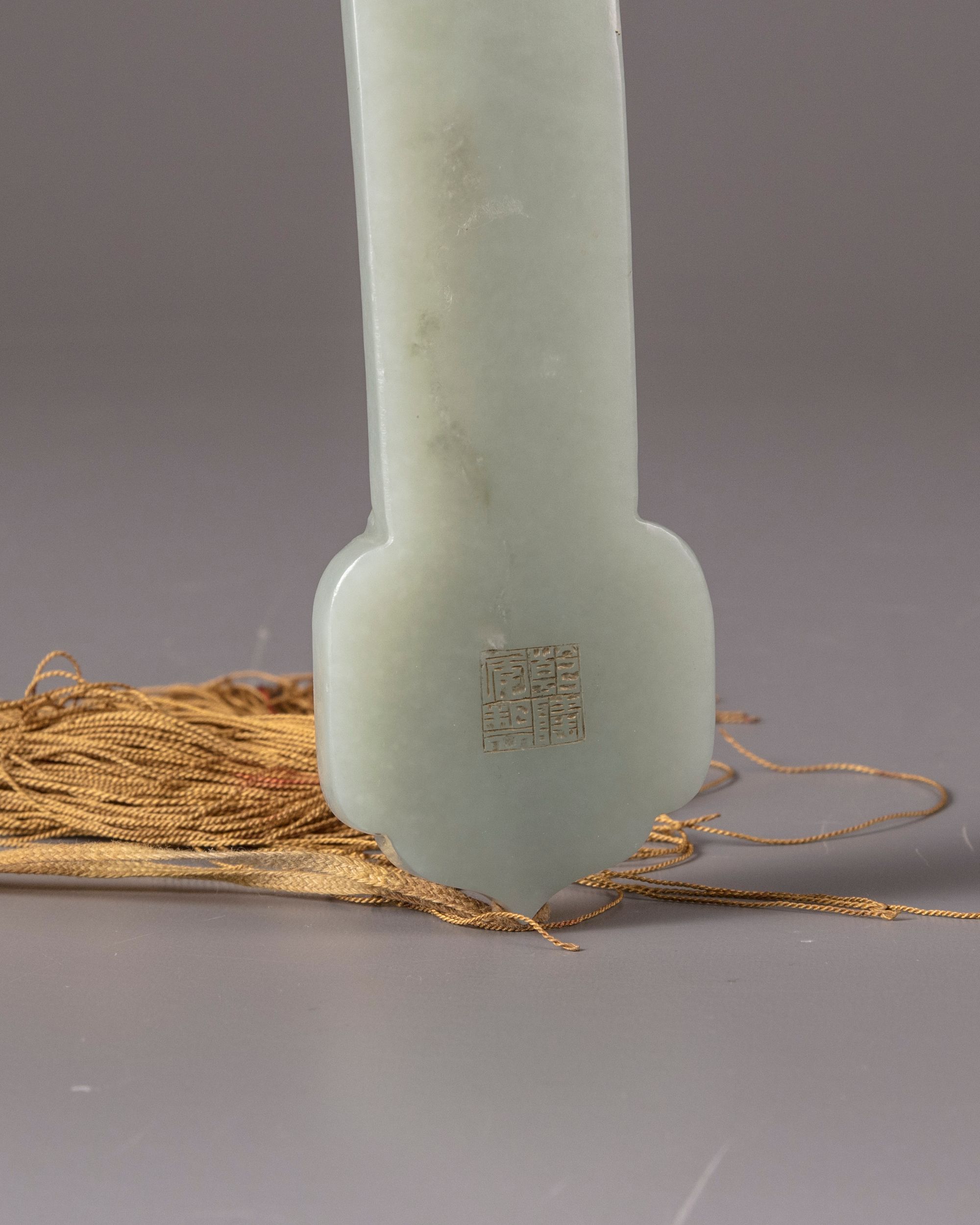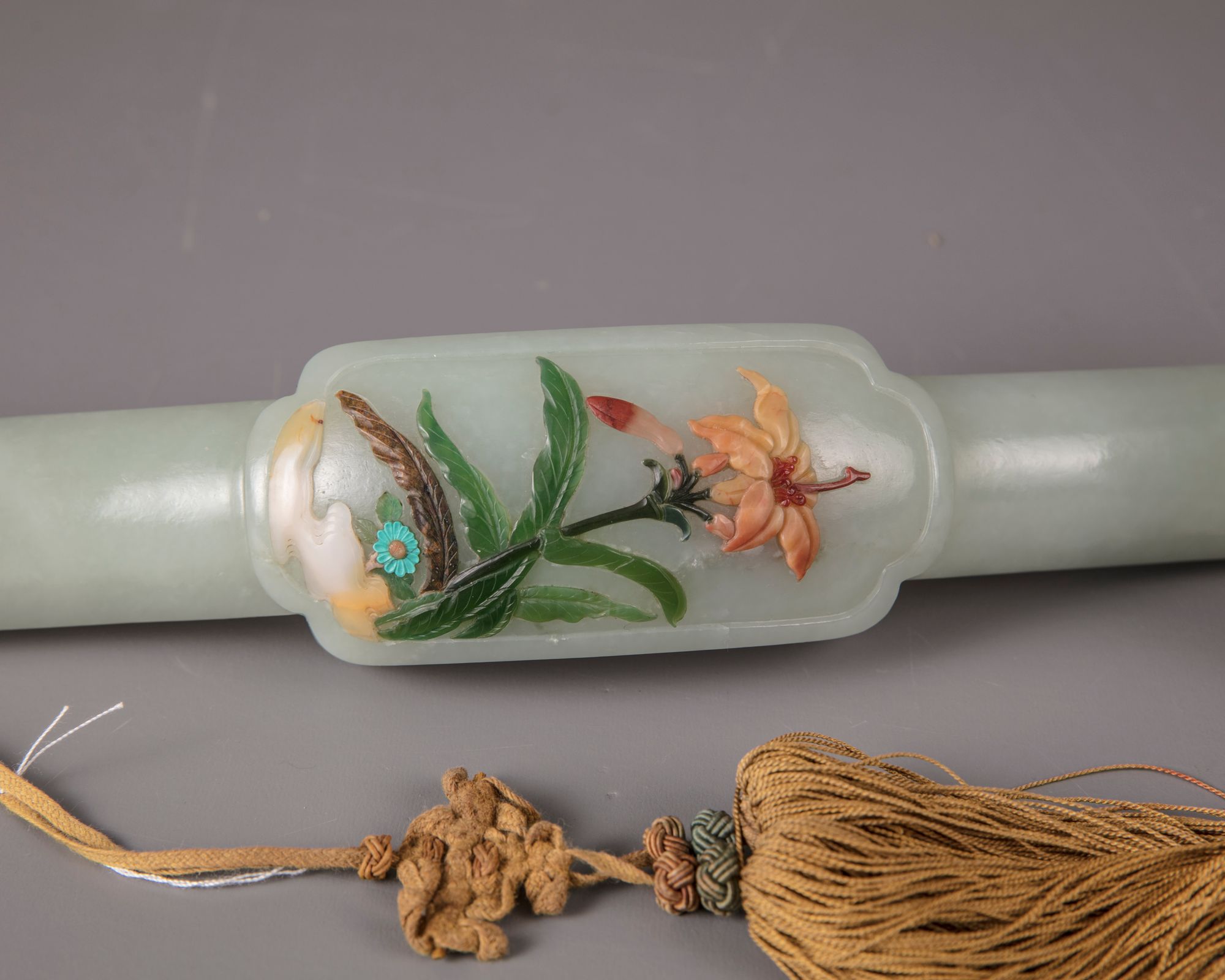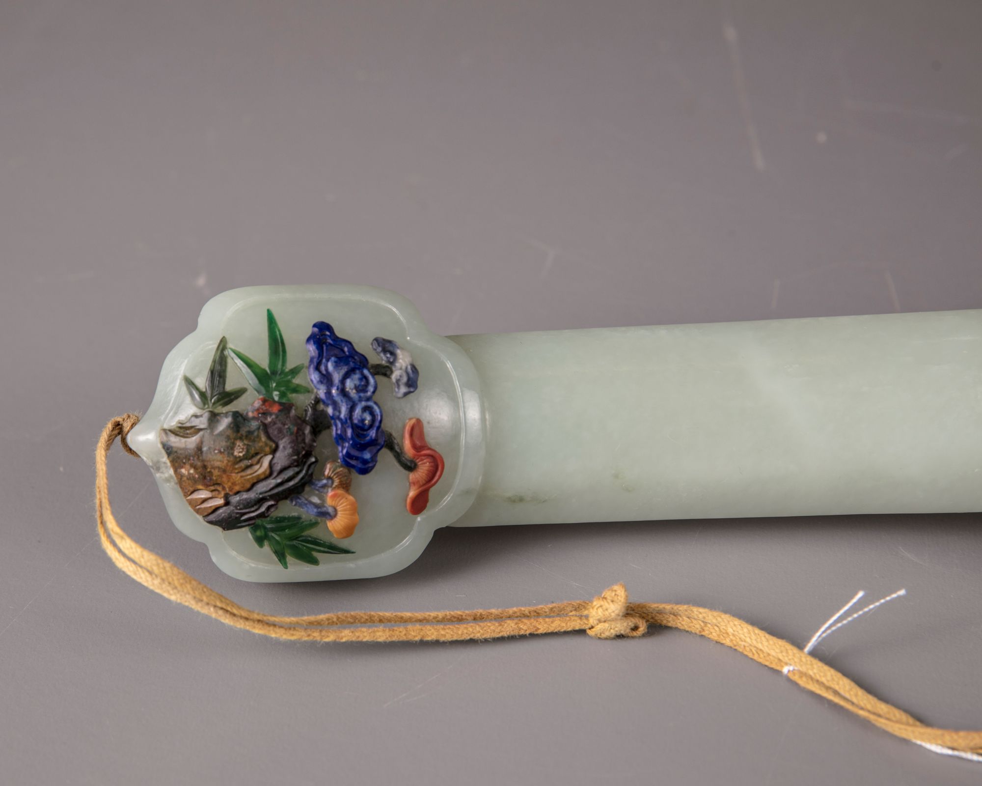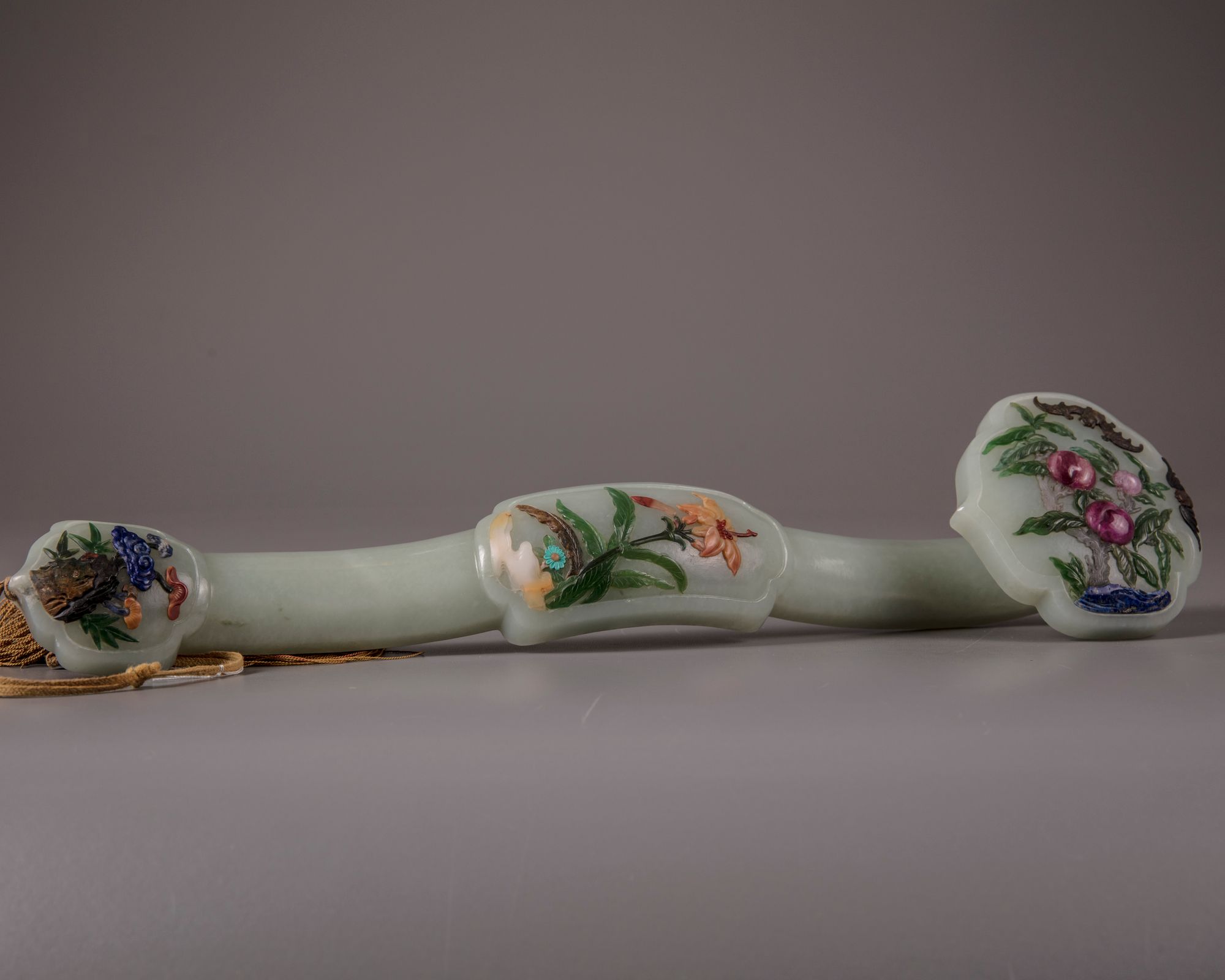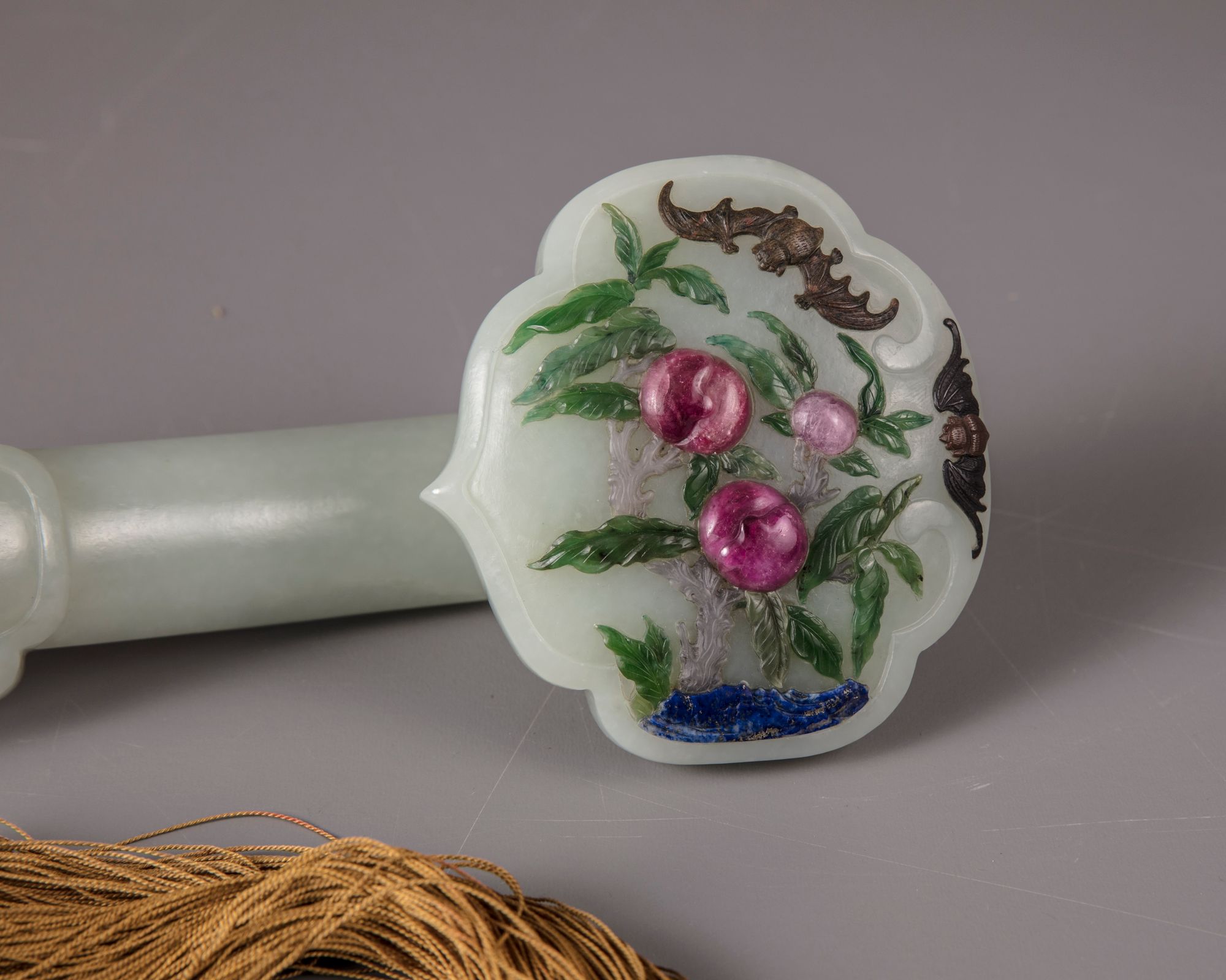 The thickly carved sceptre is decorated to the ruyi-shaped head with tourmaline, lapis lazuli, and soapstone inlay depicting two bats in flight above peaches on the branch. The elongated quatrefoil middle section is decorated with a leafy lily in agate and a turquoise aster, and the shaped end section of the sceptre is decorated with lingzhi fungus growing from a rocky base crafted from various hardstones. The reverse with an incised and gilt apocryphal Qianlong seal mark. The stone is of an even pale celadon tone with light veins and inclusions.