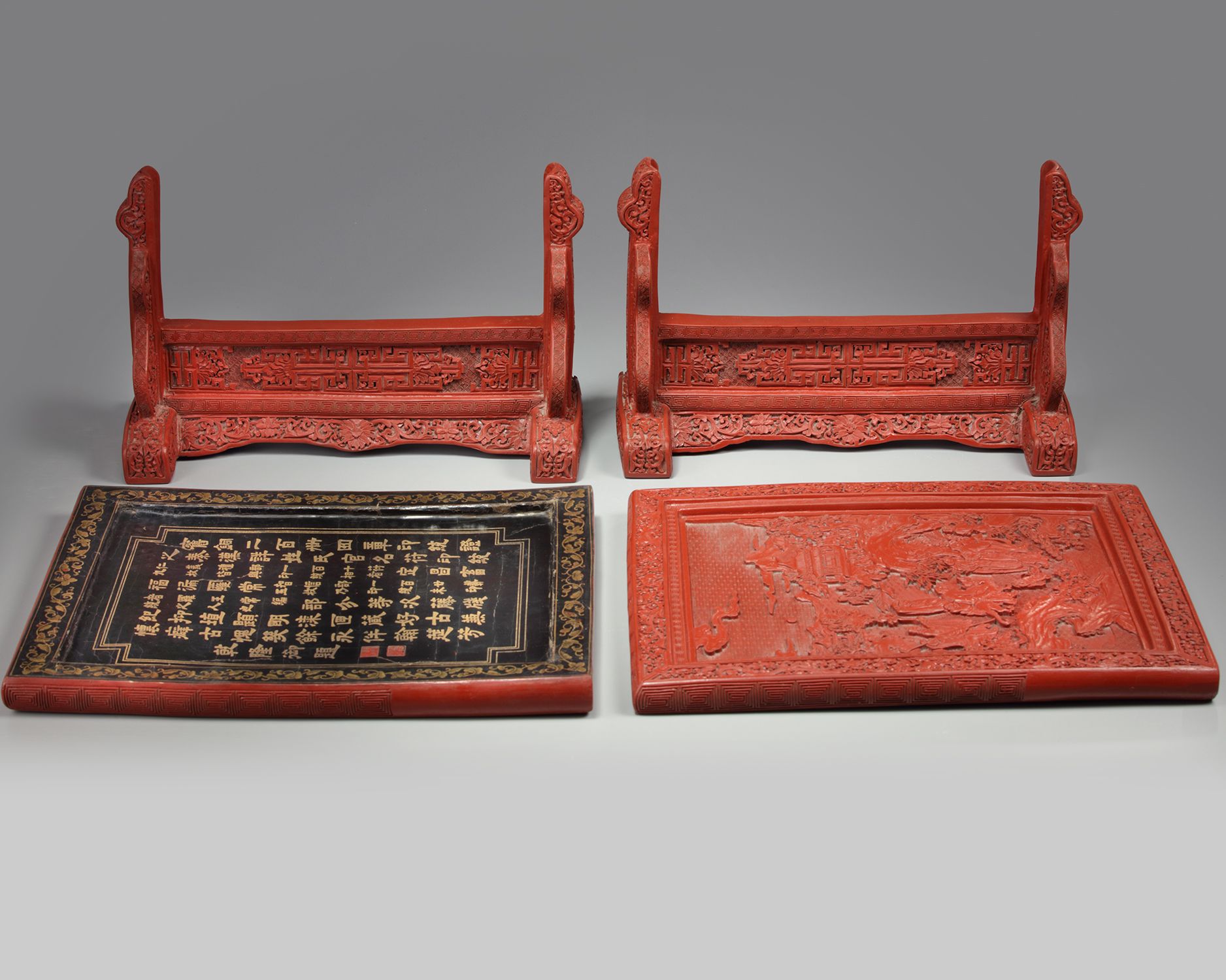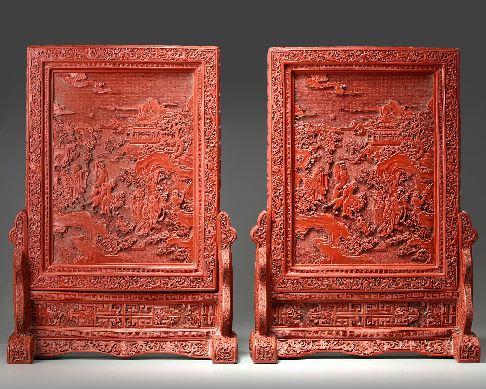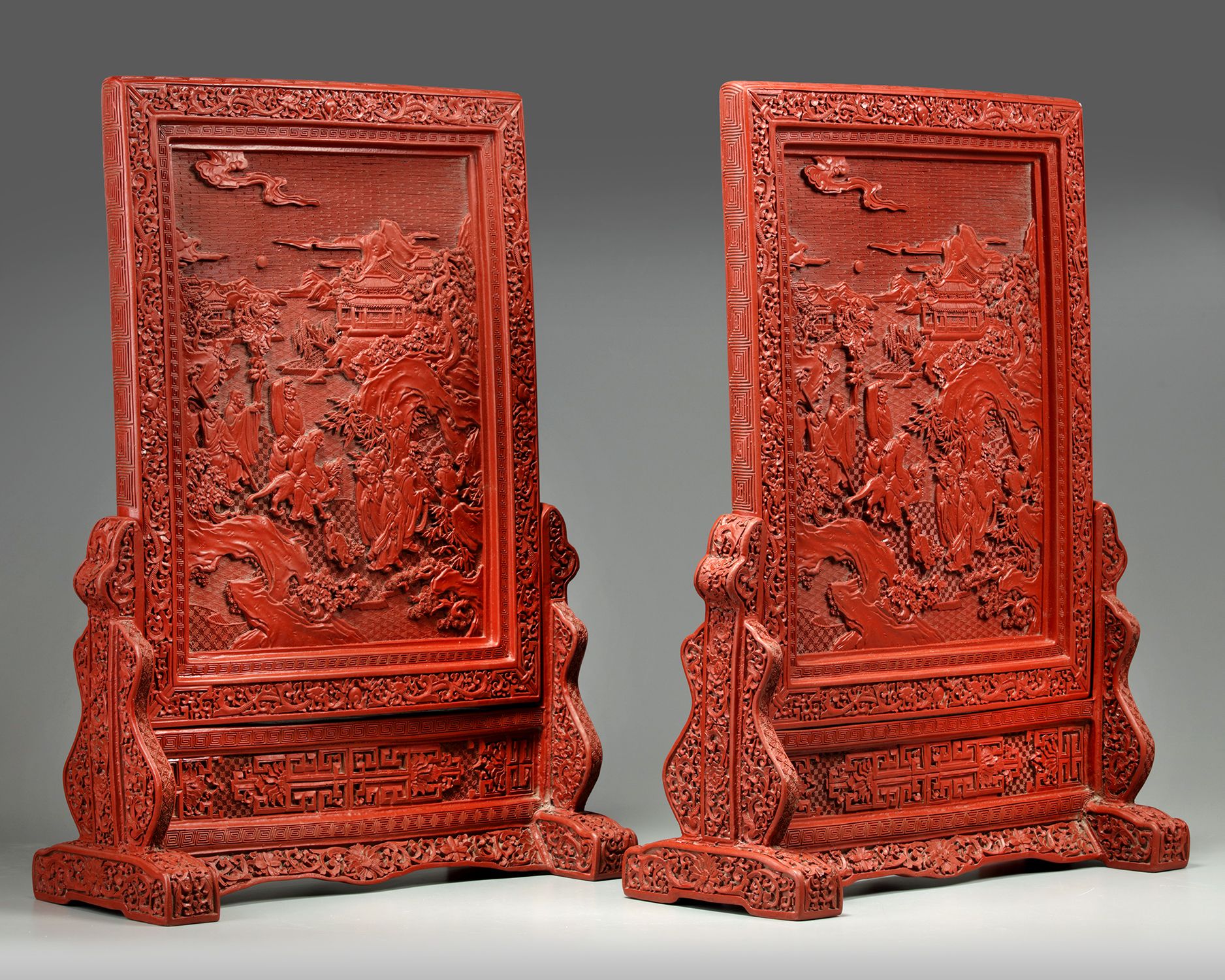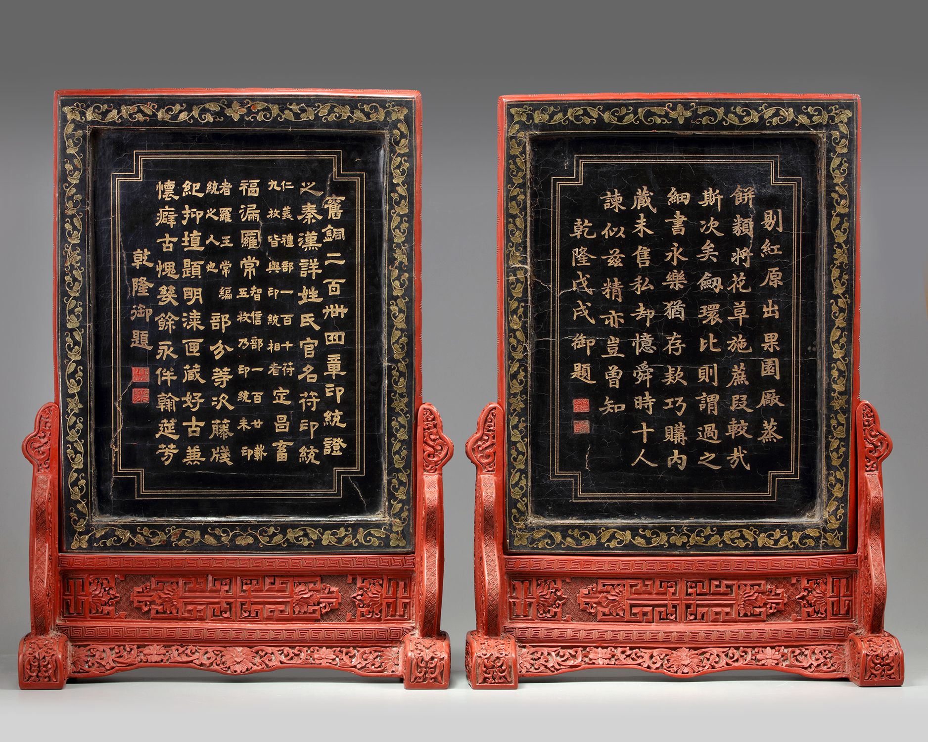 Each screen is decorated with Luohan in a mountainous river landscape, each holding their respective attributes. The border is carved with flower scrolls. The reverse is lacquered black and inscribed with gilt with an apocryphal Qianlong date. The stands are decorated with further flower scrolls and angular scrolls.