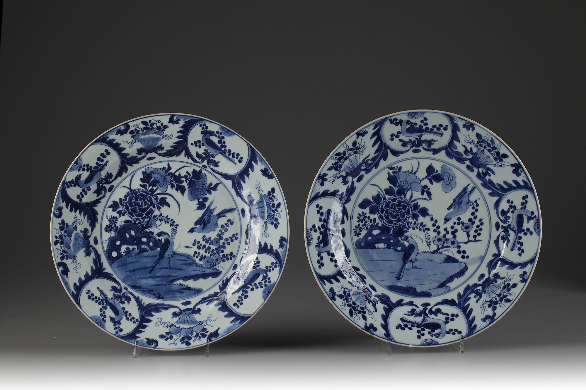 Centrally decorated with birds amidst a rocky garden scene, encircled around the rim with four cartouches enclosing birds separated by baskets of flowers.