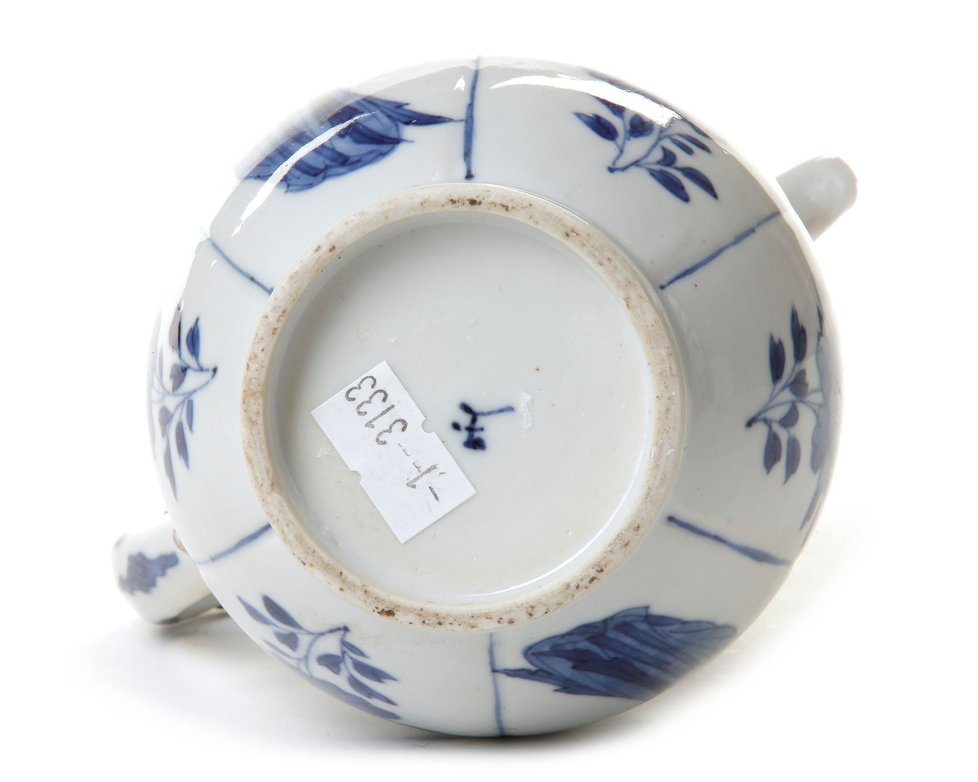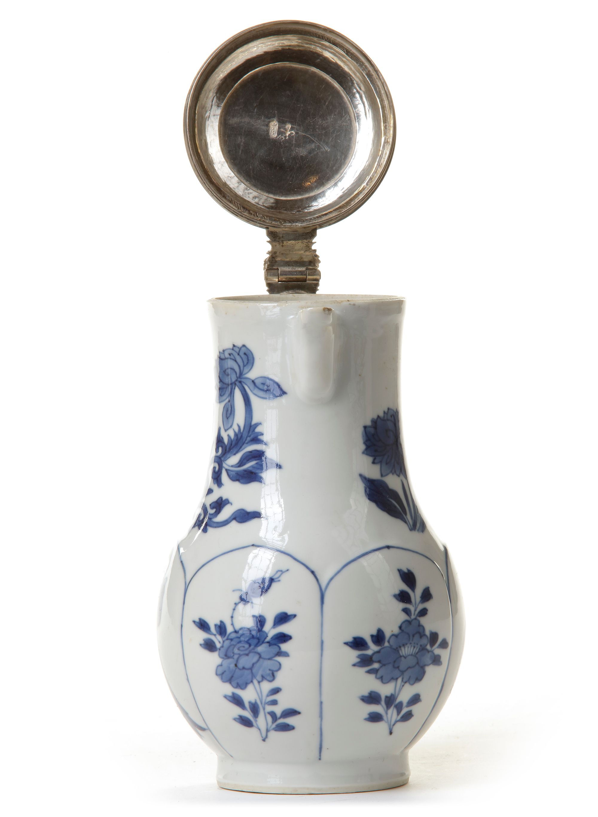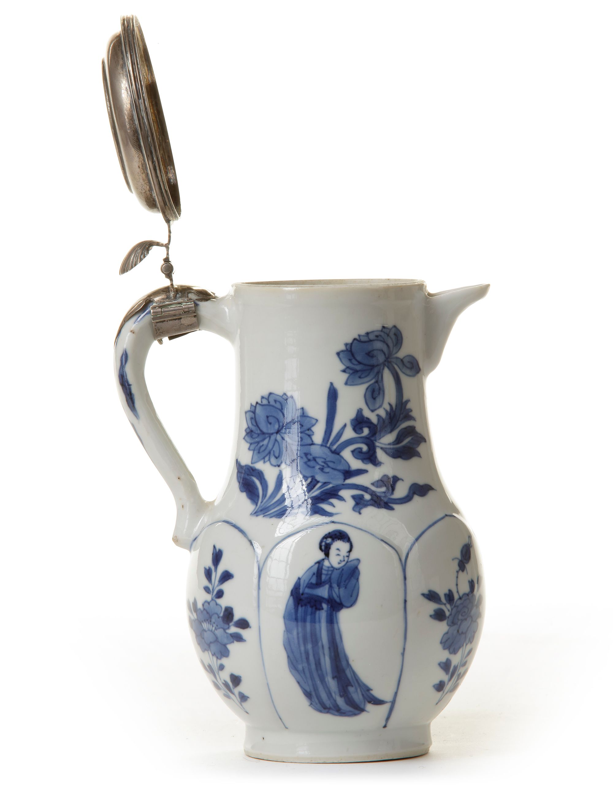 A silver mounted milk Jug China, Kangxi period (1662 – 1722) Height: 17 cm. Width: 12 cm. Silver mount: Amsterdam 18th century The wide neck is freely decorated with a flowering lotus above moulded panels with alternating decorations of flower sprays and “Long Elizas”. The silver mounted cover is 18th century and hallmarked Amsterdam to the inside of the cover. Nieuhof´s description of China, published in 1665, mentions that some Chinese used milk in their tea, though this was not customary in South China. The trade in tea by the Dutch and English East India Companies was booming in by the late seventeenth century and tea was considered a very valuable commodity which could only be afforded by royalty and the high upper class. The leaves were left in the pot to stew, making a very strong tea with a high acidity. The French started drinking tea with milk and sugar, becoming common use around 1700 in Europe, leading to the special orders of porcelain milk jugs manufactured in China. Hereafter, no proper tea set was considered complete without a milk jug.