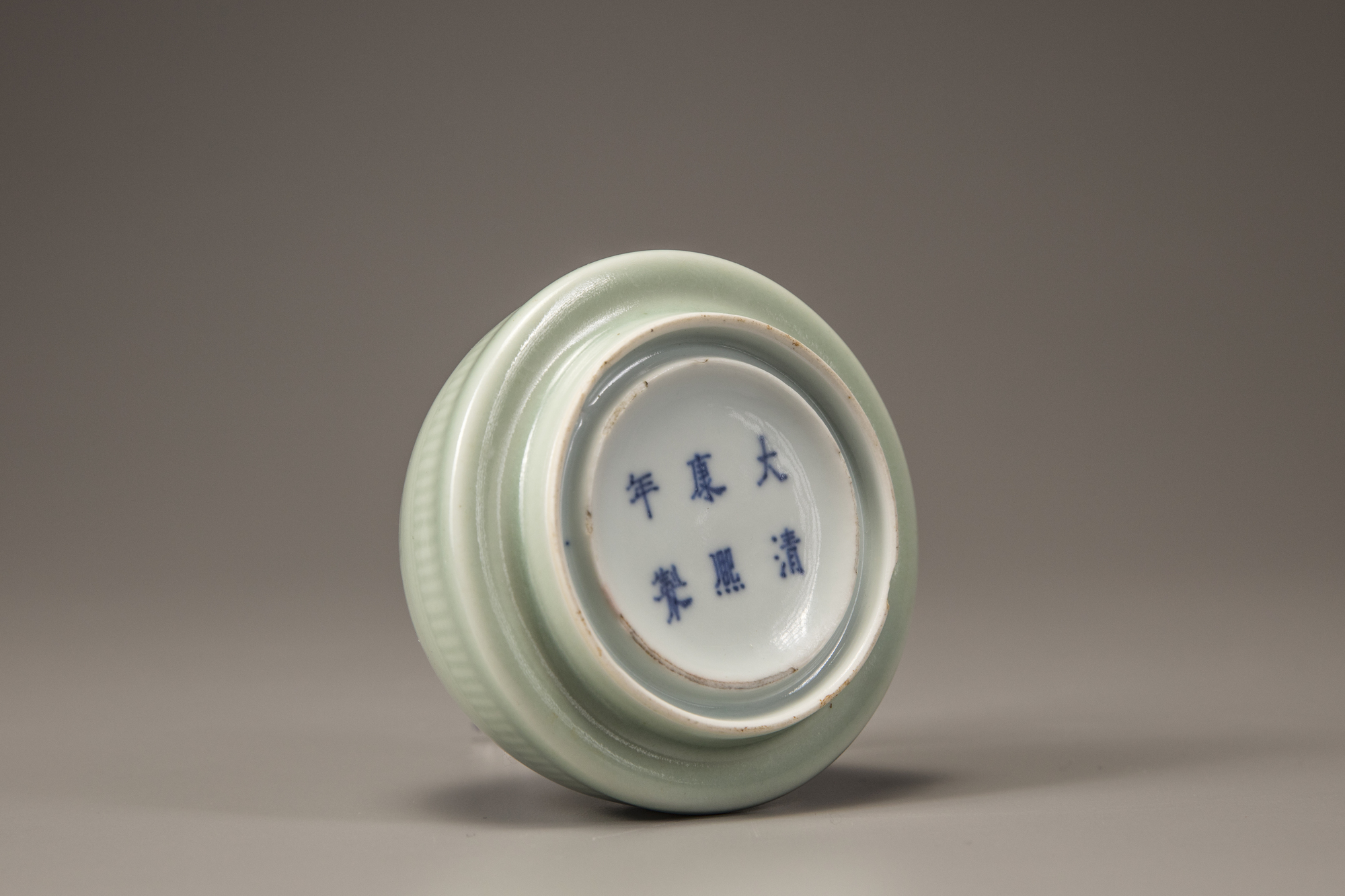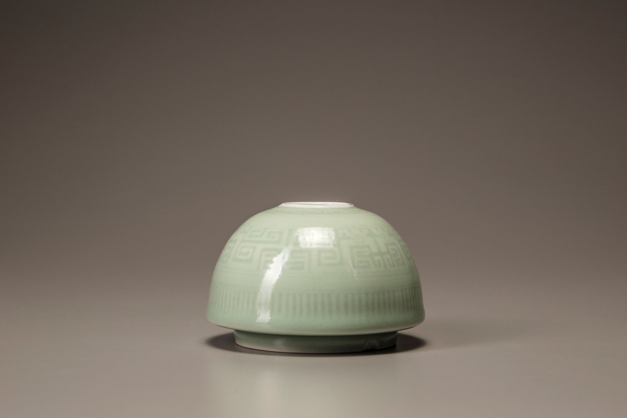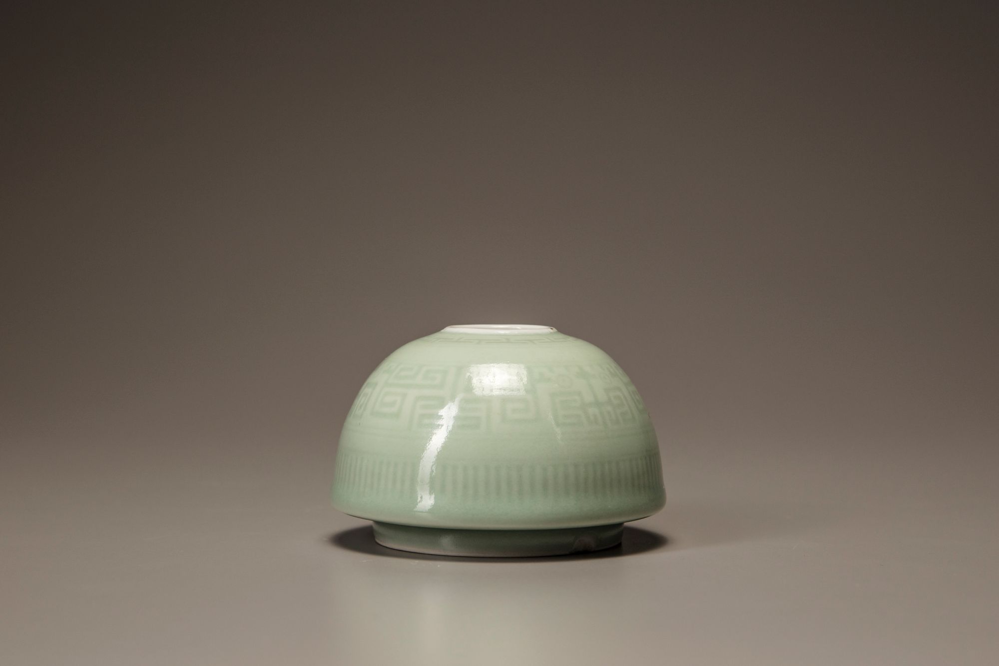 The domed water pot is carved to the exterior with a band of confronting geometric archaistic kui-dragons, above a band of rectangular lappets. The base with double-rim encircling an apocryphal Kangxi mark.
