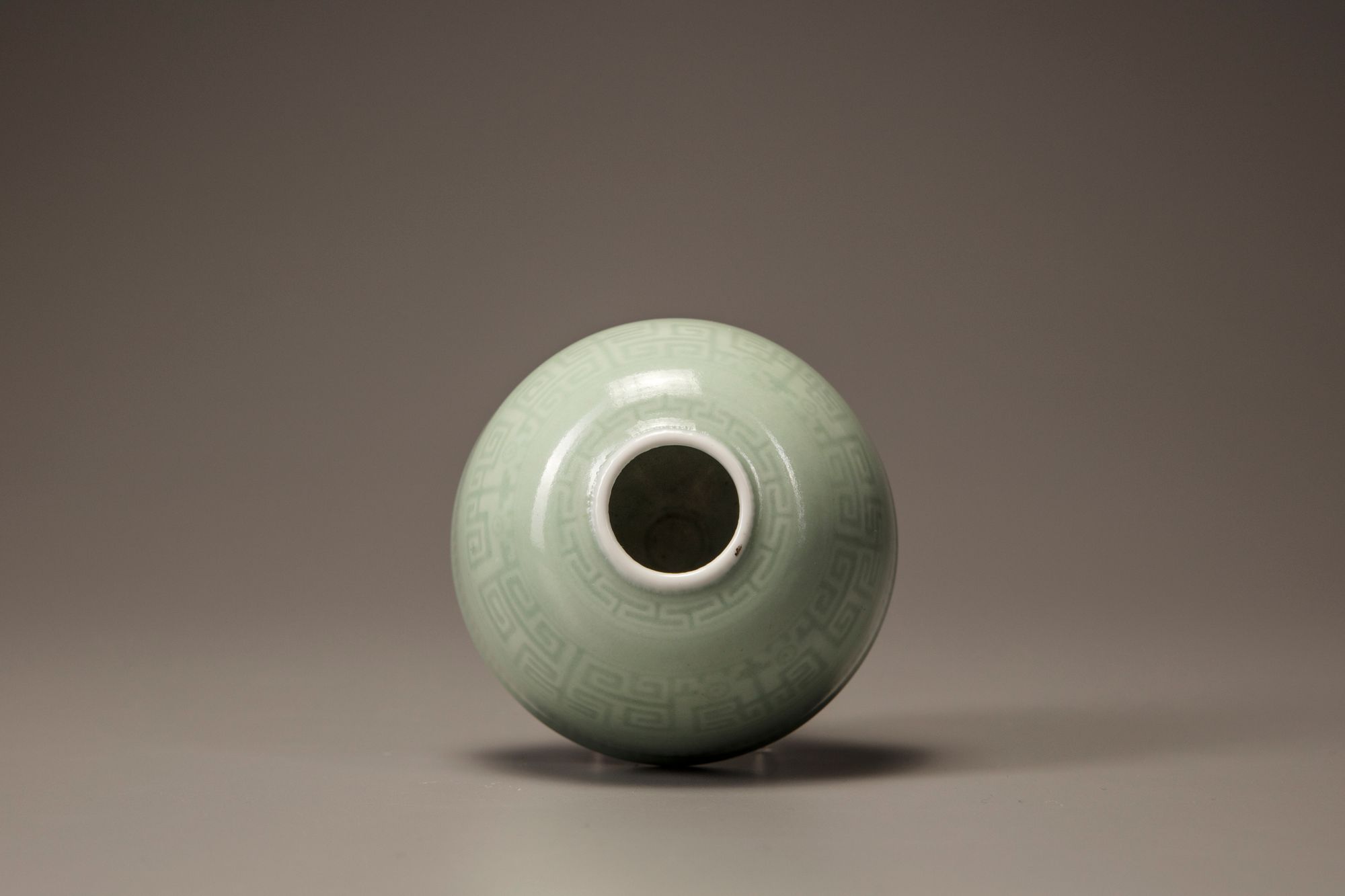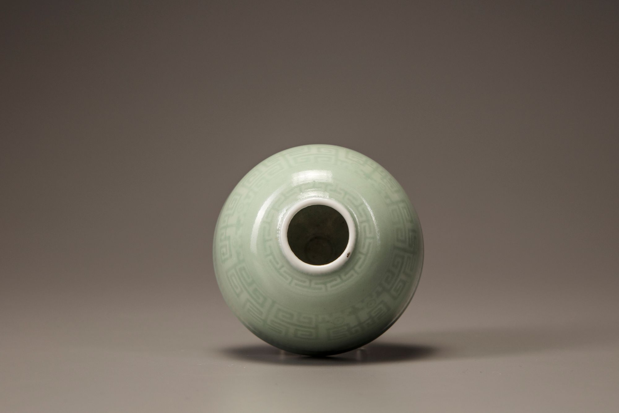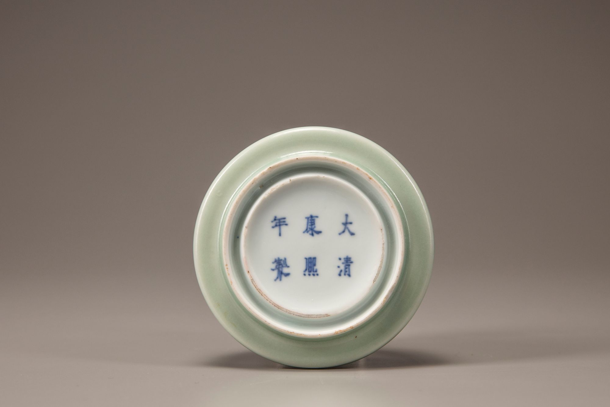 The domed water pot is carved to the exterior with a band of confronting geometric archaistic kui-dragons, above a band of rectangular lappets. The base with double-rim encircling an apocryphal Kangxi mark.
