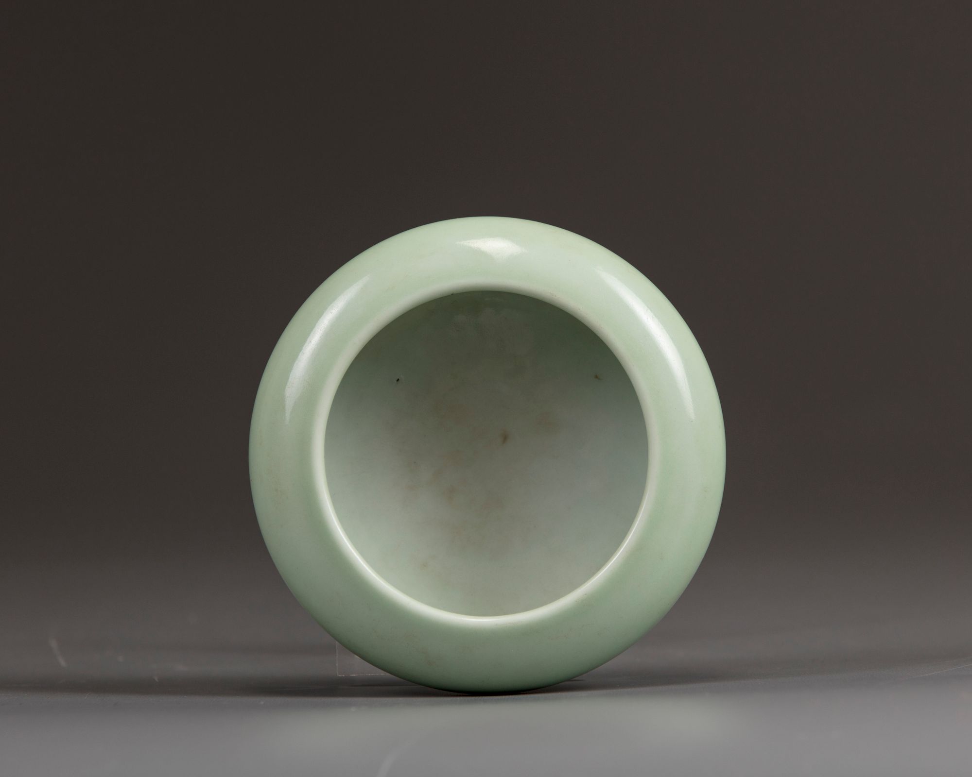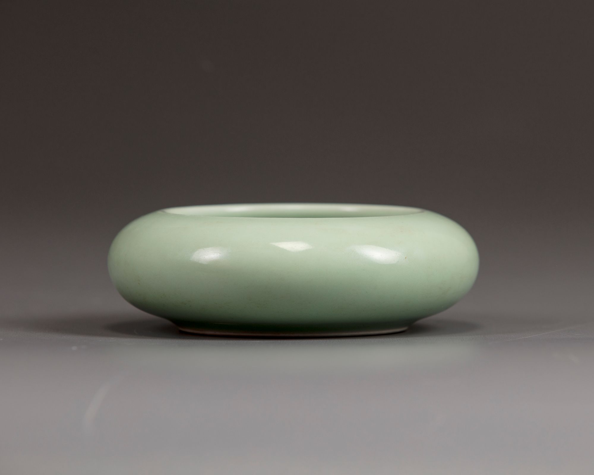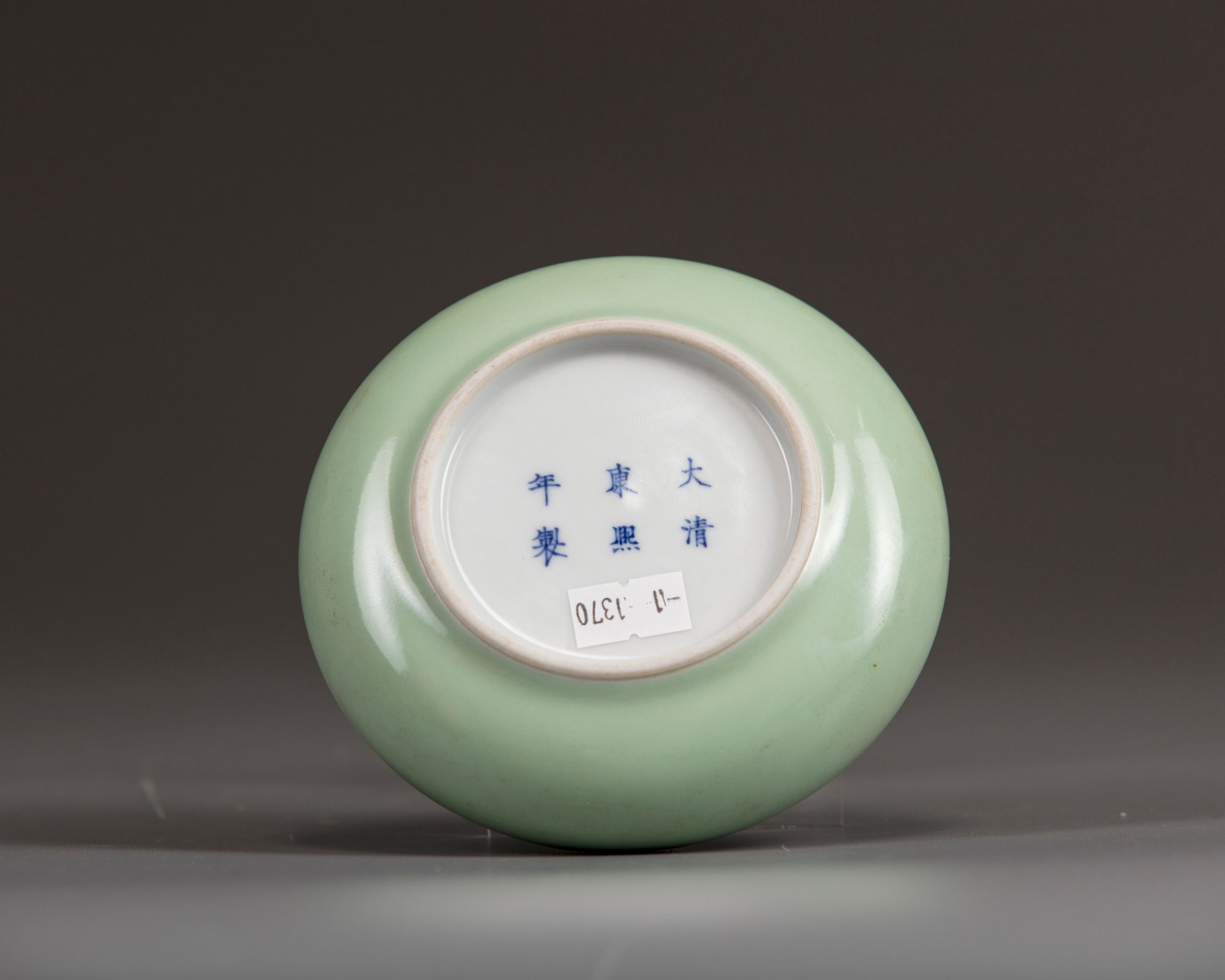 The shallow washer with an incurved rim is covered to the exterior with an even pale celadon glaze. The base with an apocryphal Kangxi six-character mark.