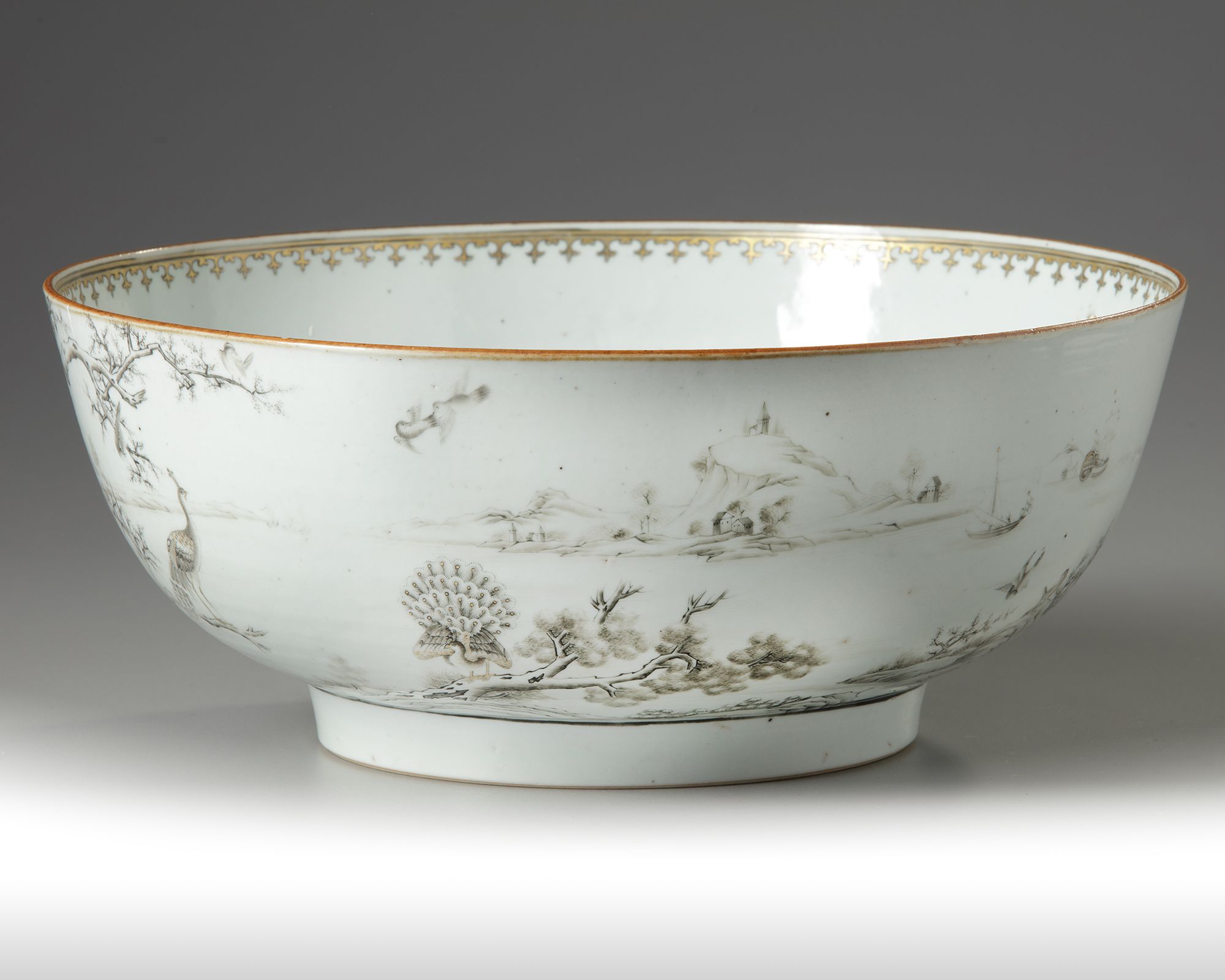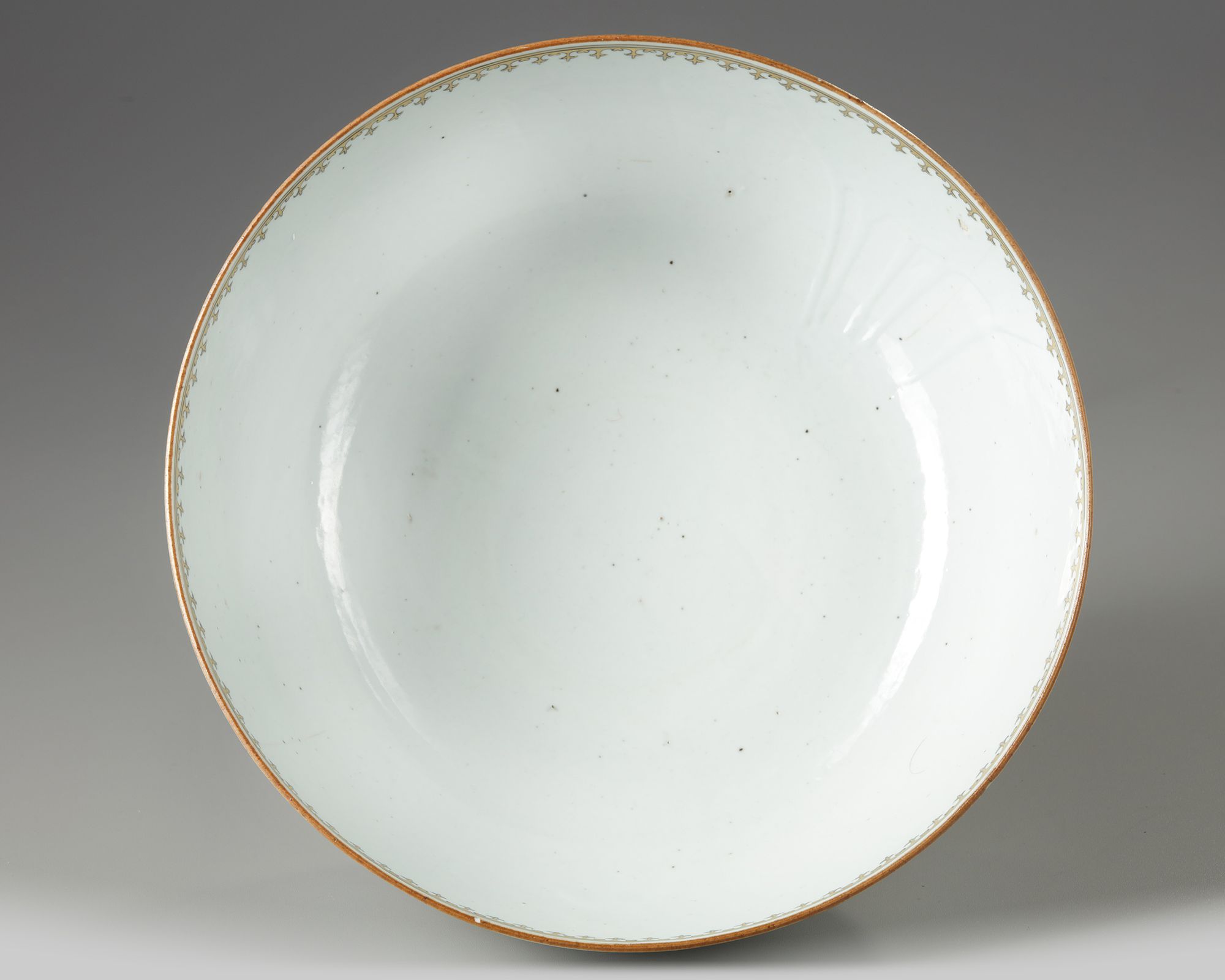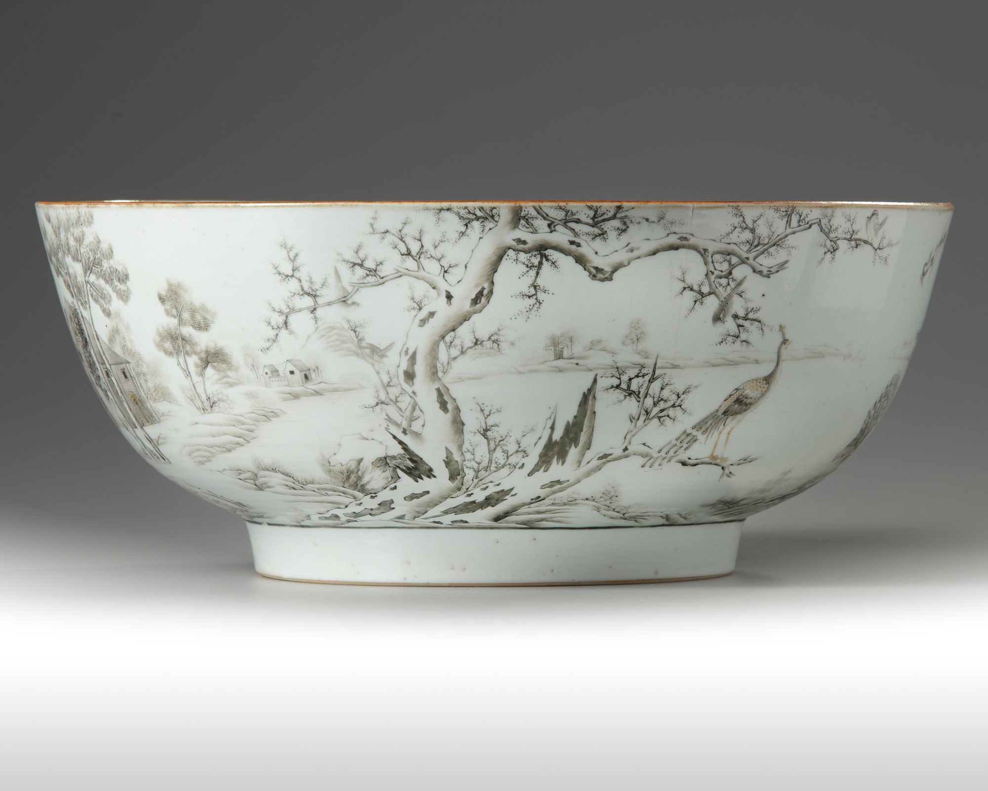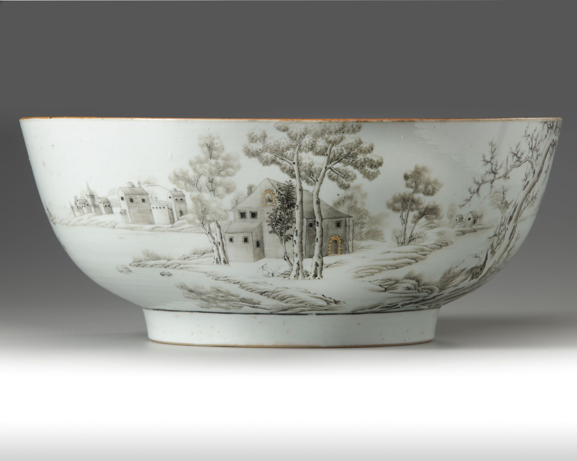 Catalogue notes: Compare the present lot with a larger punch bowl (39 cm. diam.) decorated with figures in the Museum Boijmans van Beuningen, Rotterdam, accession no. A 5226 (KN&V).