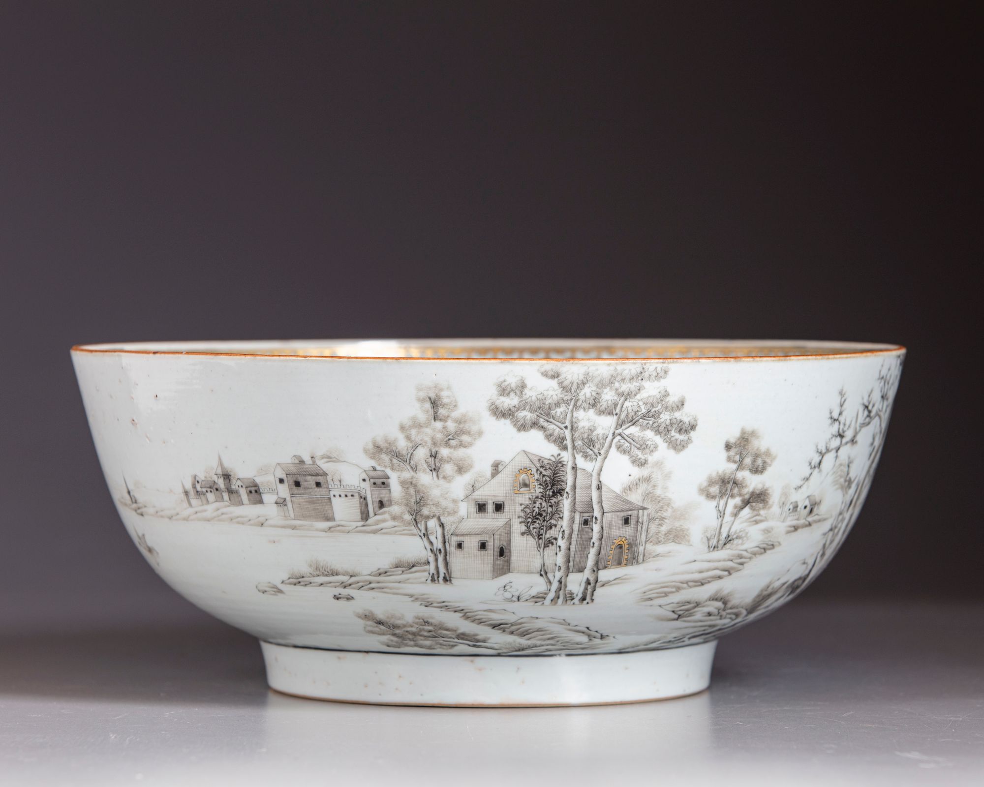 The bowl is finely decorated and gilt to the exterior with a multitude of pairs of birds in flight and at leisure next to a European-style building in a mountainous river landscape. The interior is decorated with gilt spearhead band to the rim. Wood stand. Provenance: Private Dutch collection