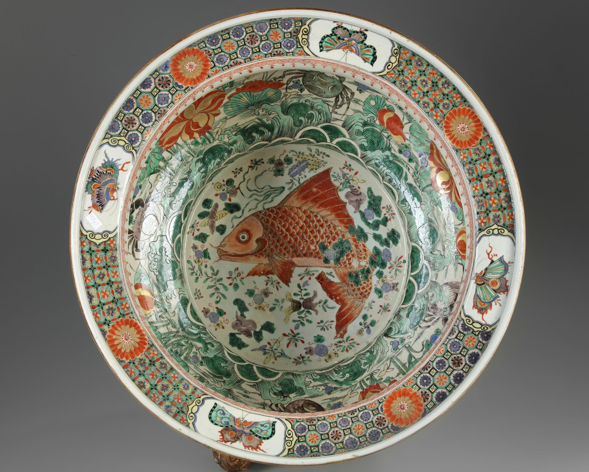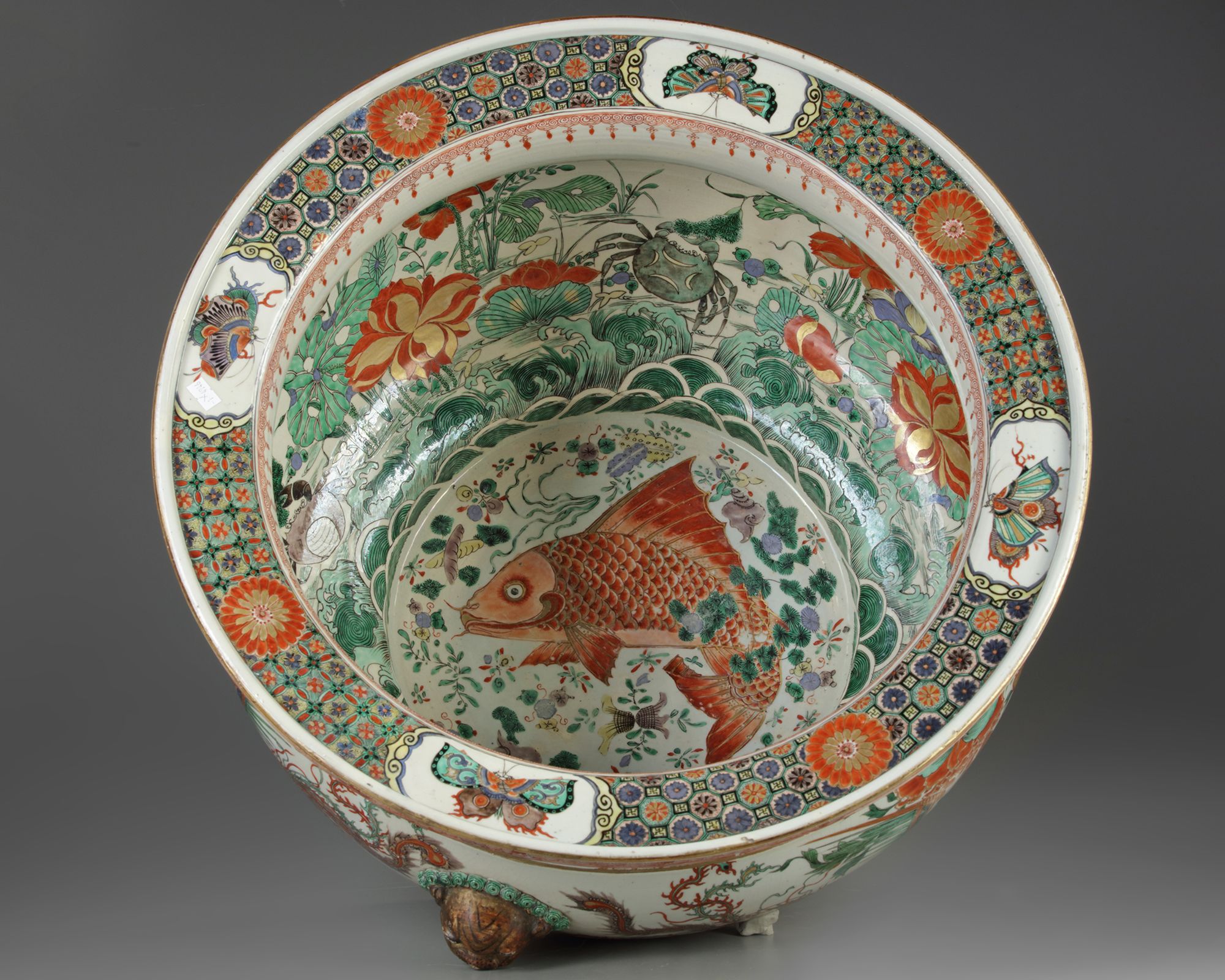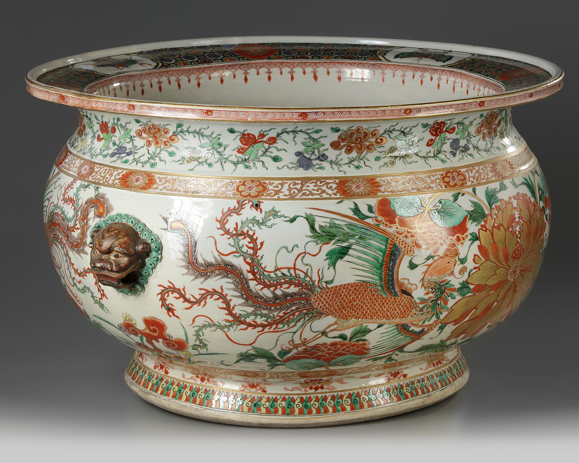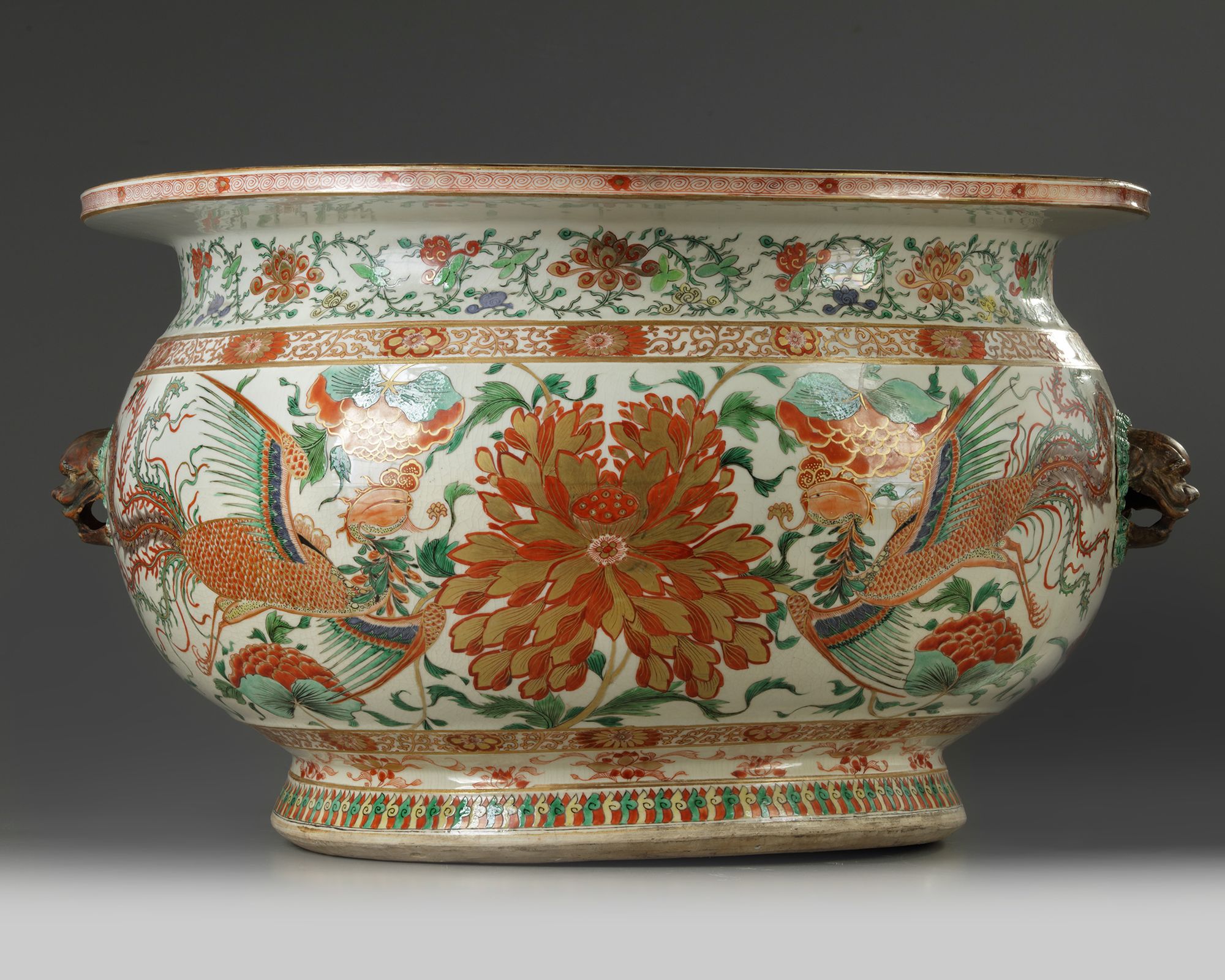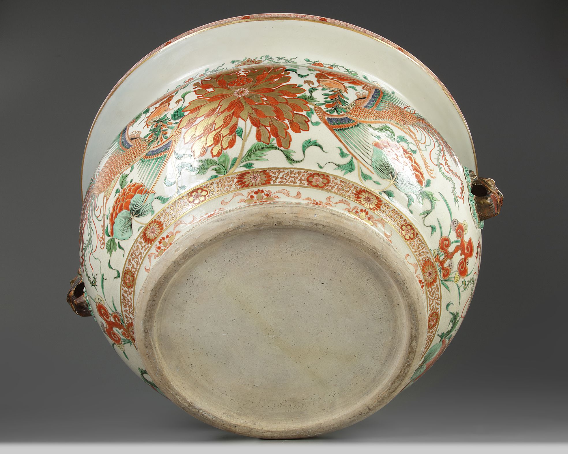 The centre is decorated and gilt with a carp to the middle surrounded by crabs amongst dense and leafy lotus flowers, the surface of the rim is decorated with a geometric band interspersed with flowerheads and butterfly cartouches. The exterior is boldly decorated with two lion-mask handles and large elaborate flower sprays flanked by two phoenix. 37 cm. height, 59.7 cm. diam.