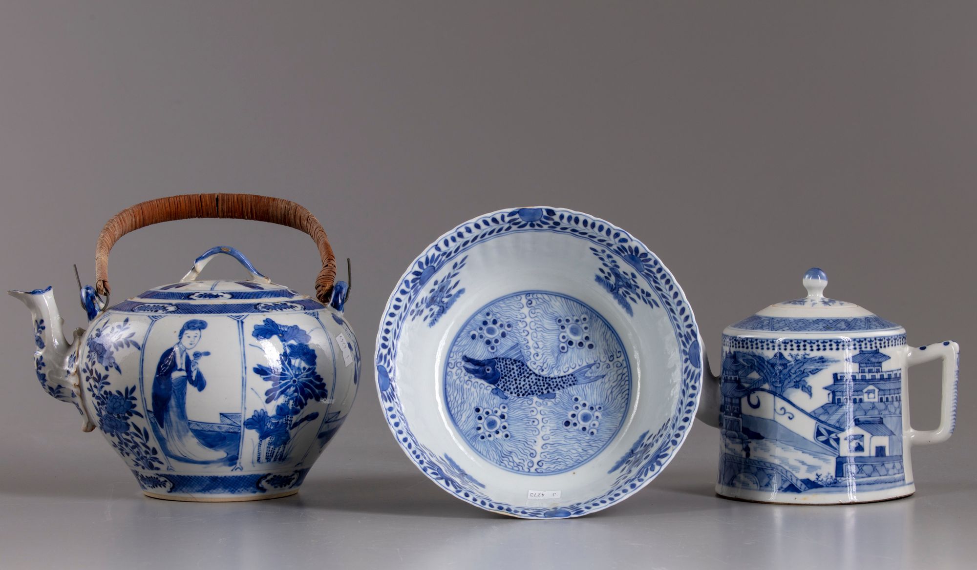 The teapot is decorated with alternating panels enclosing a lady holding a flower and blossoming tree branches, with a decorated spout and two upright handles. The blue and white teapot is decorated with mulit-level pavilion and with a fisherman on sampan in a river beside houses.The bowl is decorated to interior with a central roundel enclosing a fish with flowering branches,The exterior is decorated further with alternating fish and flower head, the bottom with a Chinese Kangxi four character mark.