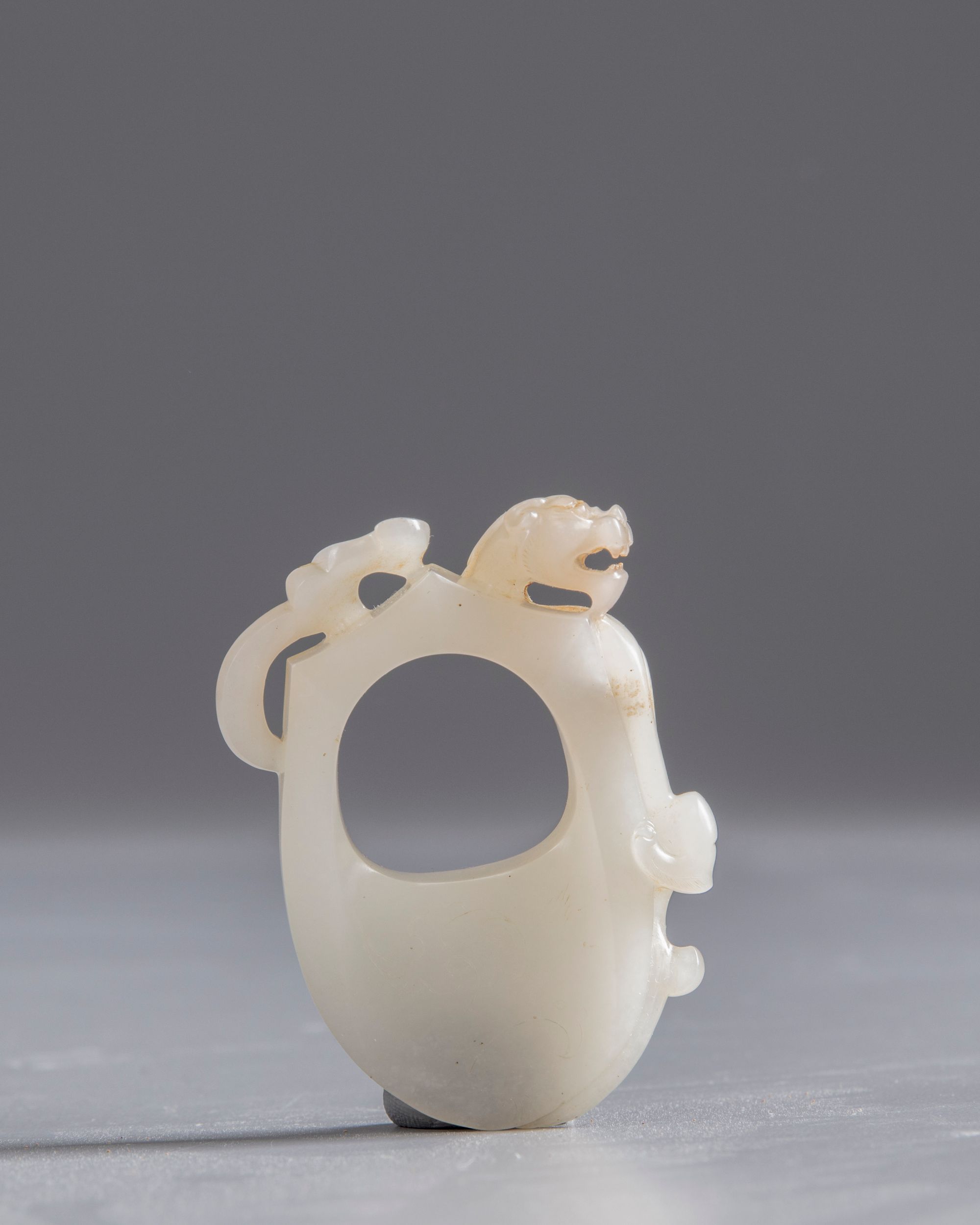 The heart-shaped pierced pendant is carved in an archaistic style with a chilong clambering on the top edge. The lower surface and the underside is carved with archaistic scrolls. The stone is of an even white tone with some russet inclusions and veins on the chilong's body.