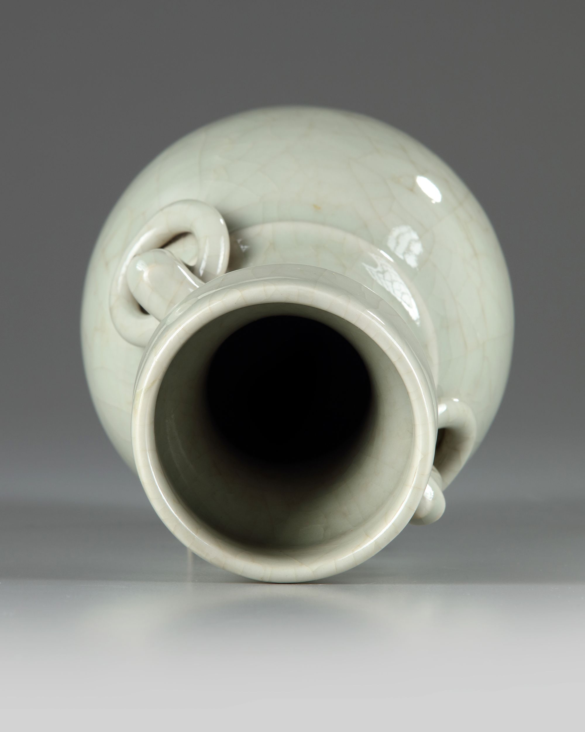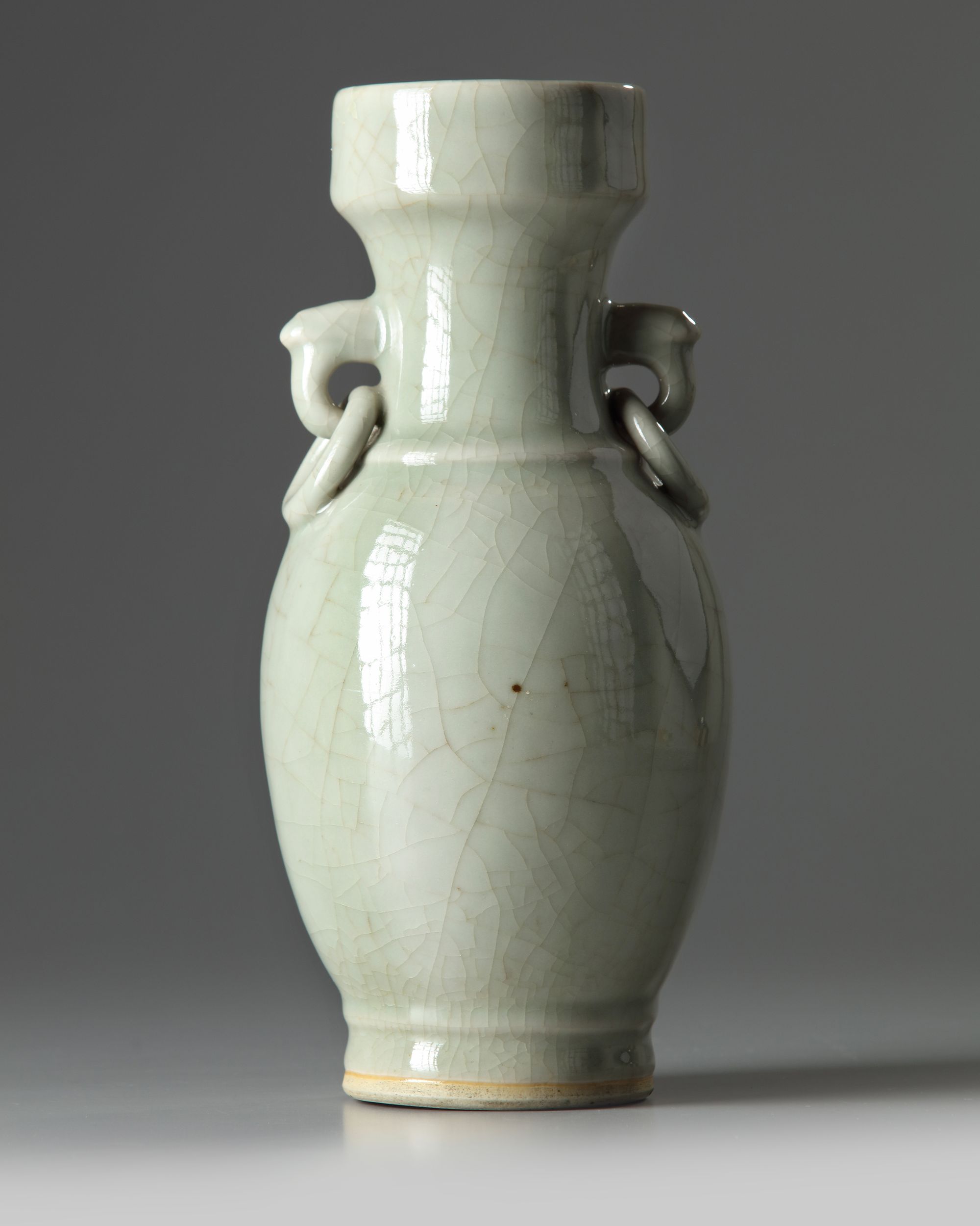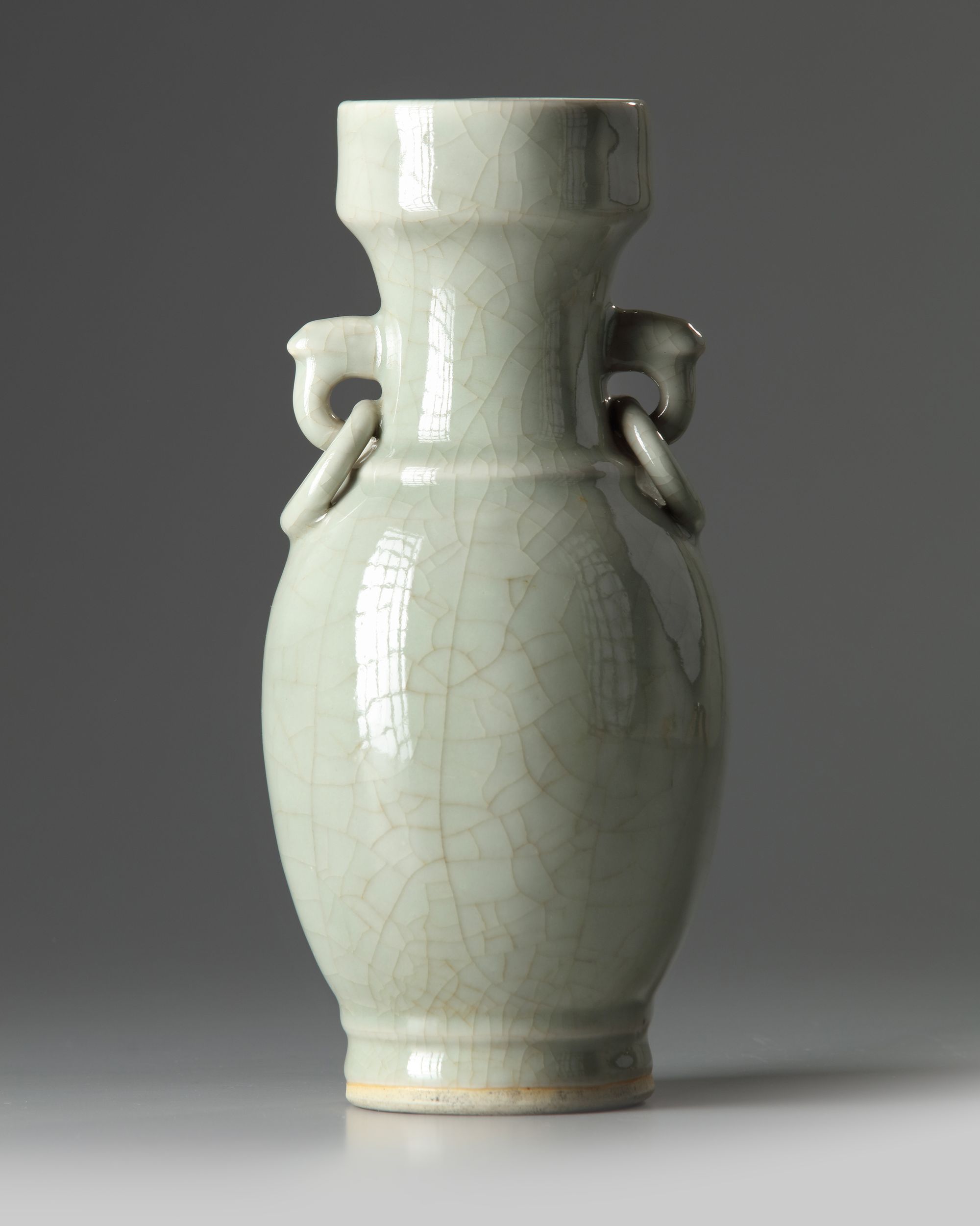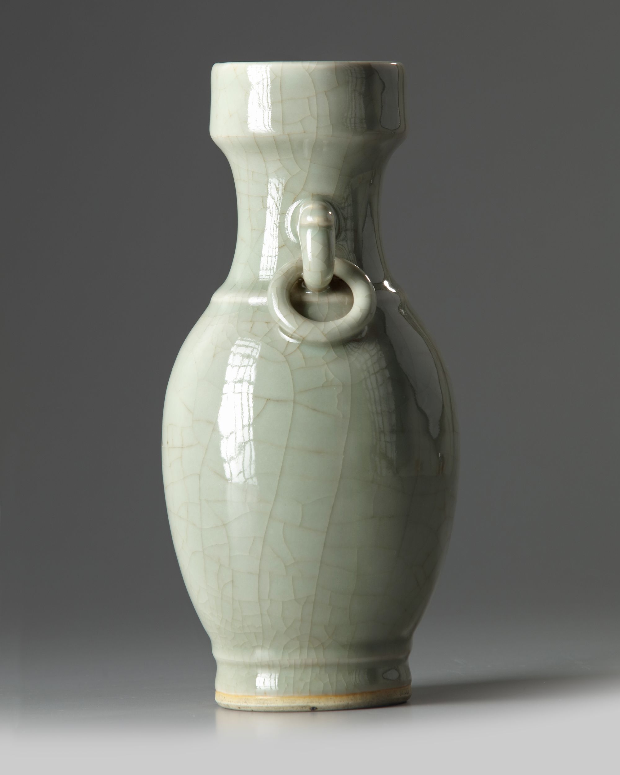 The vase is of baluster form, the neck is decorated with two stylised handles suspending fixed rings. The vase is covered overall with an unctuous crackled pale celadon glaze.