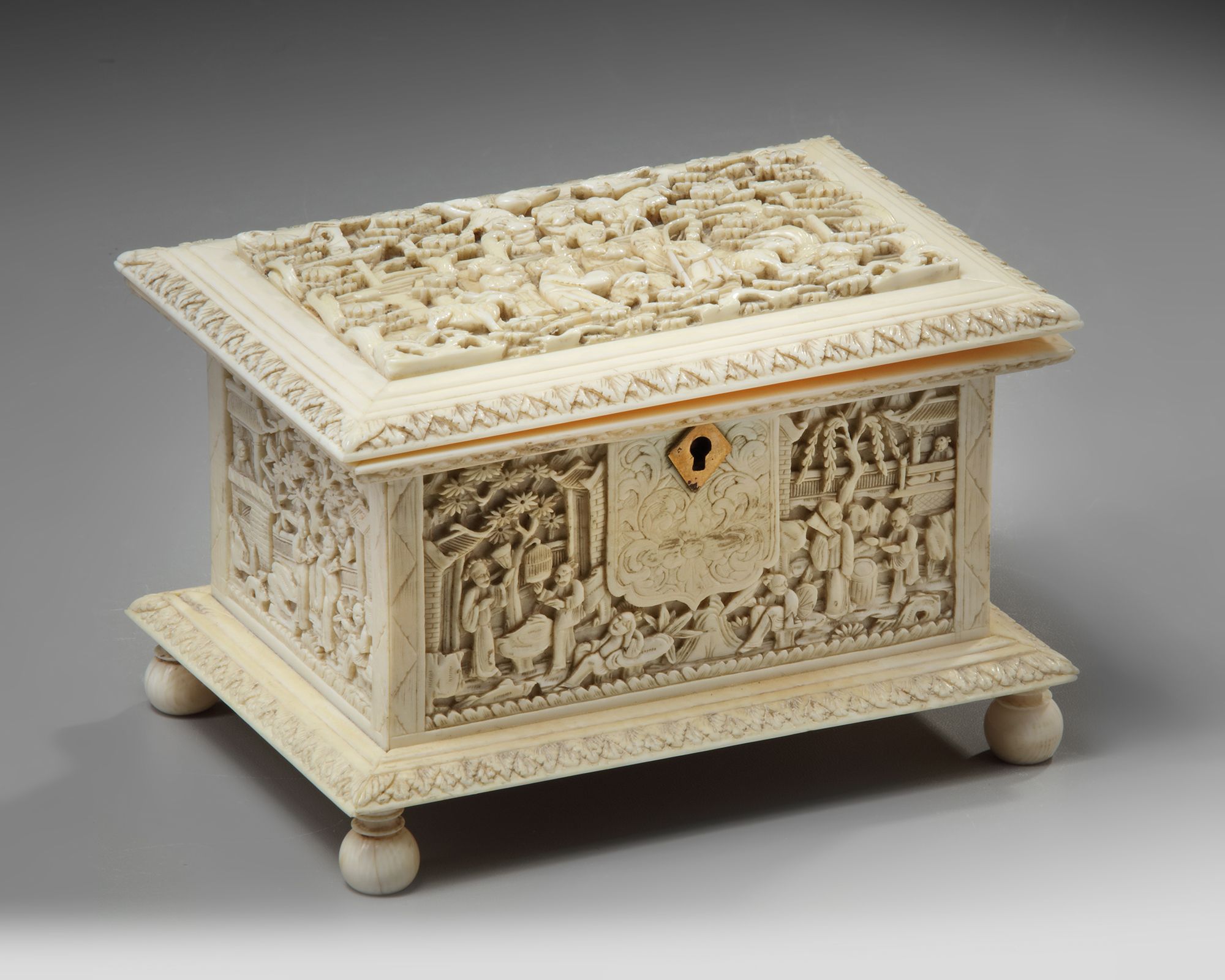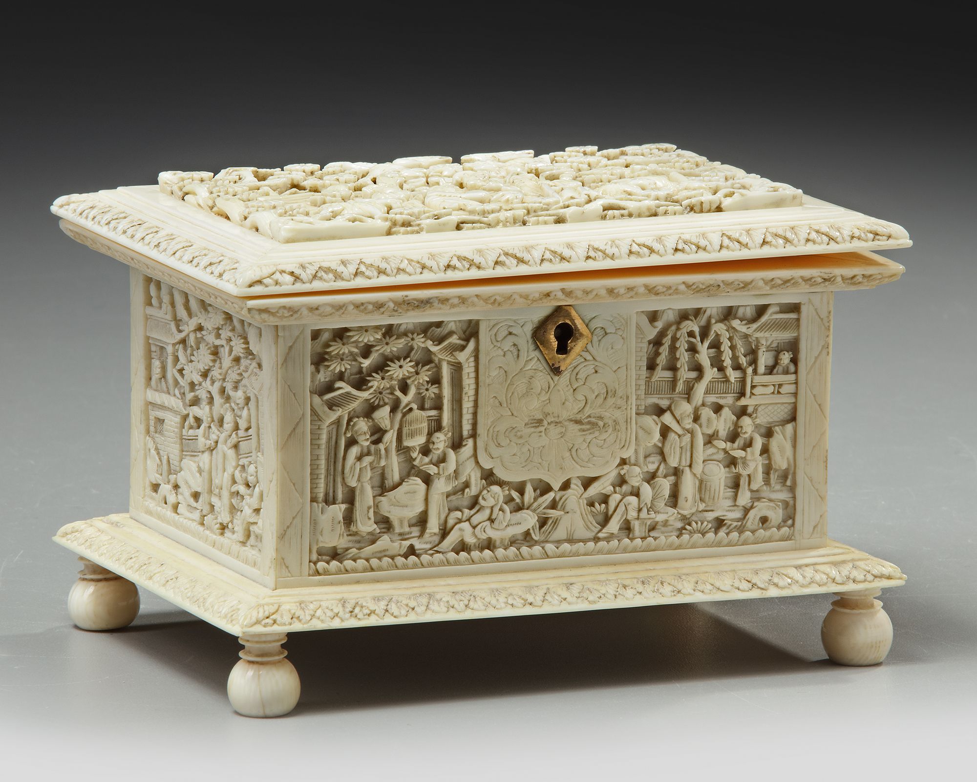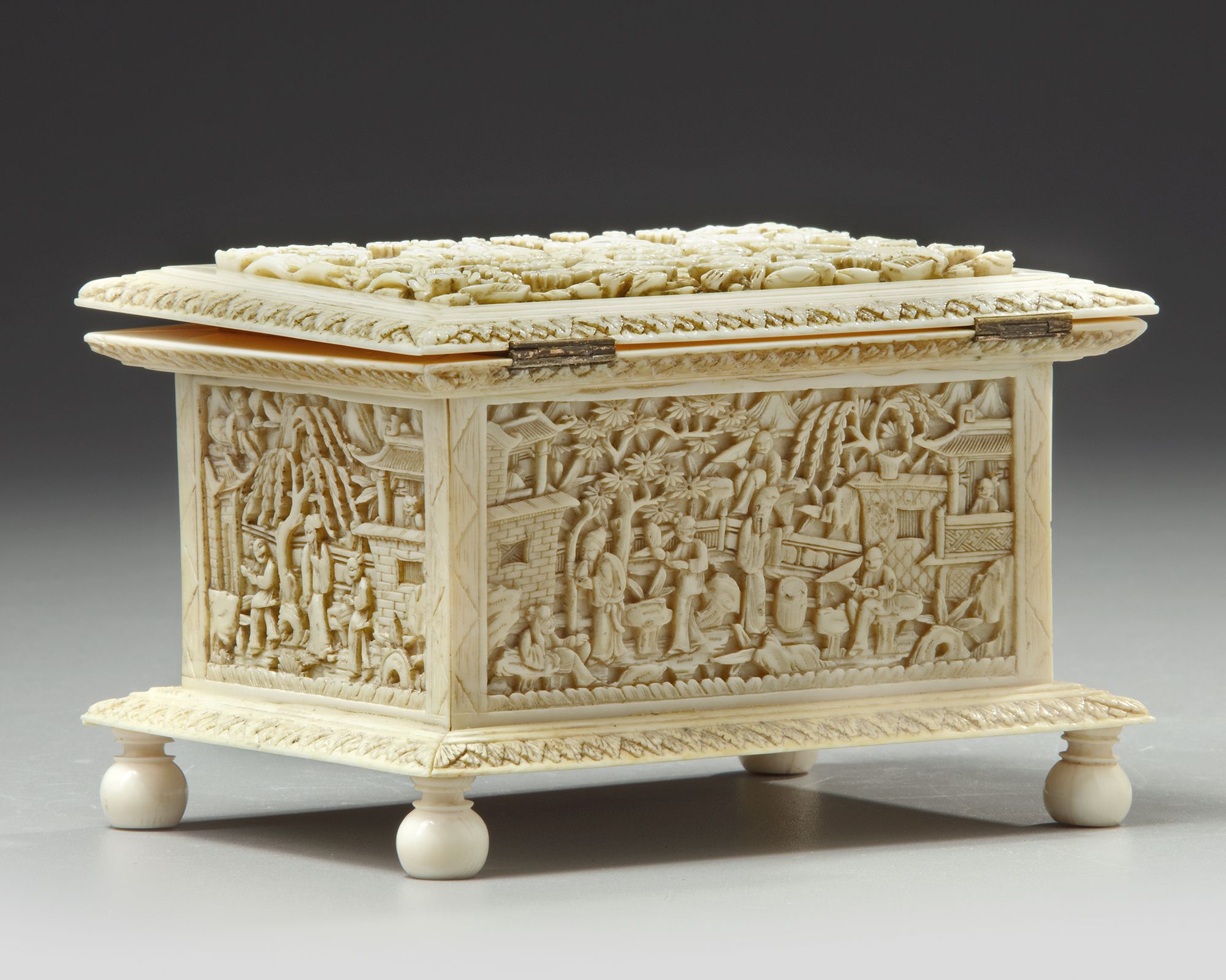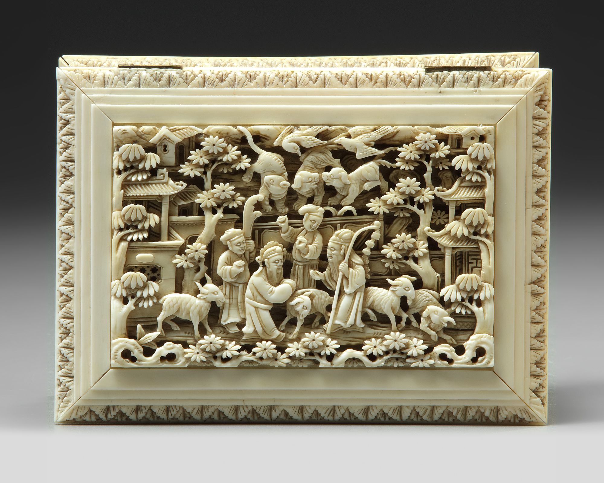 Carved with panels depicting figures amongst trees and pavilions.