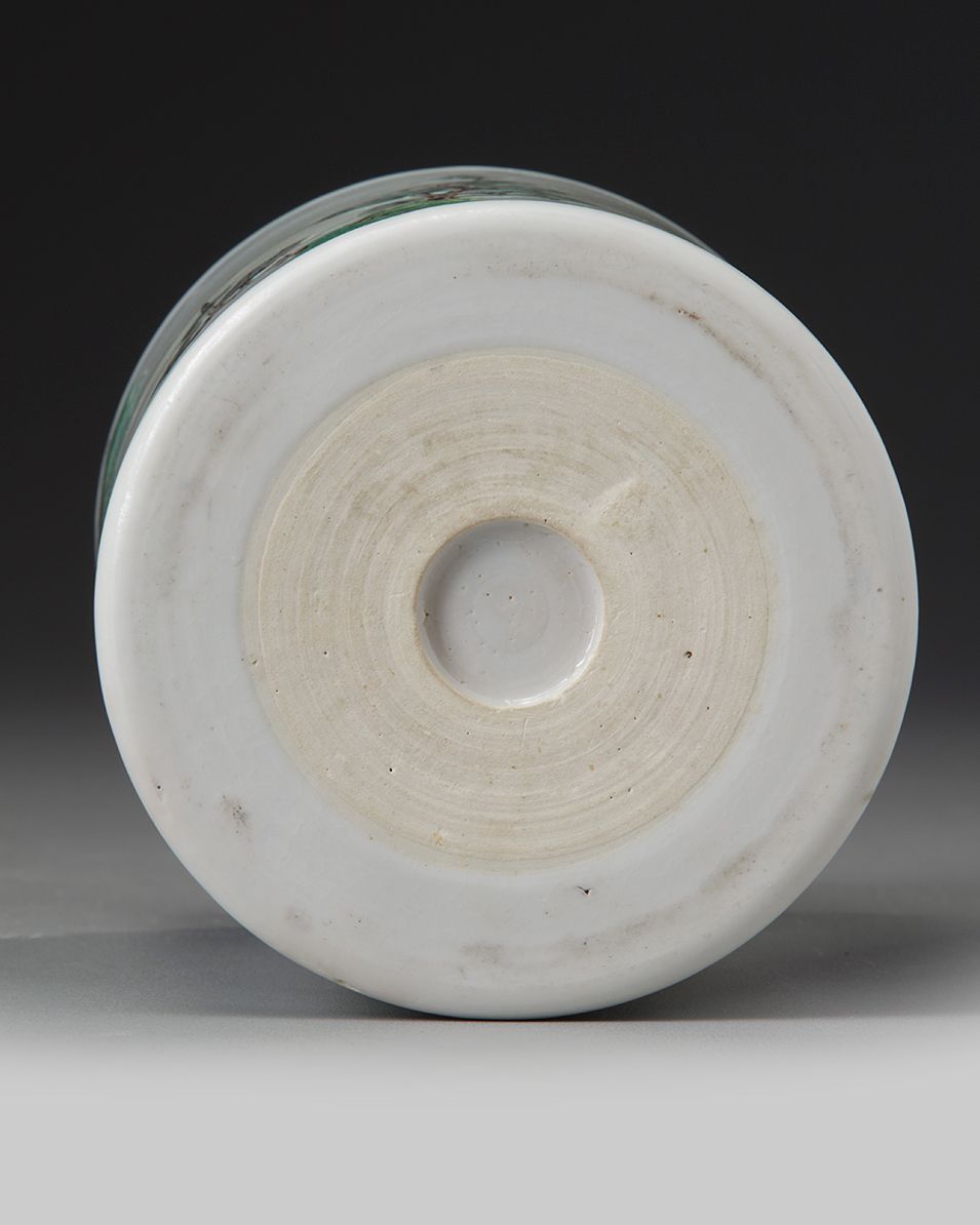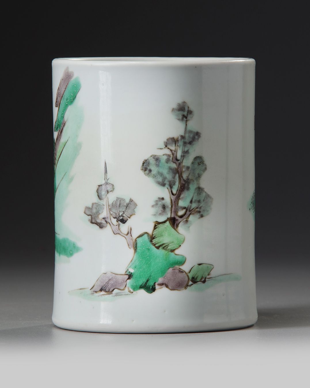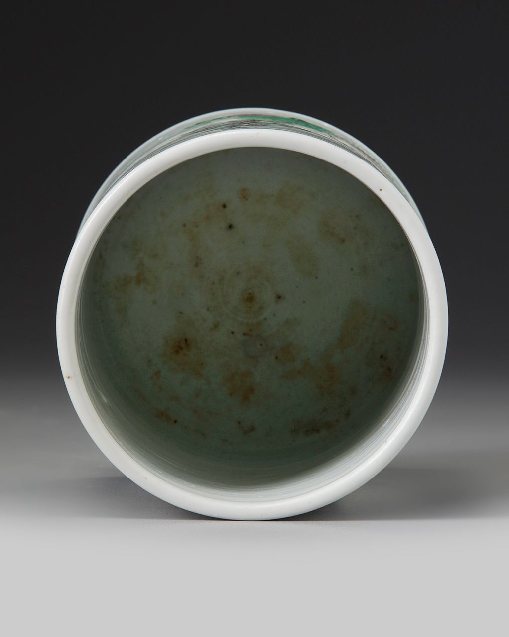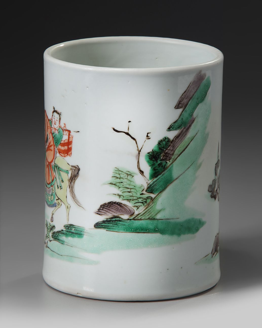 The brush pot is decorated with a scholar and his two attendants, one holding a bucket on a staff, riding a horse.