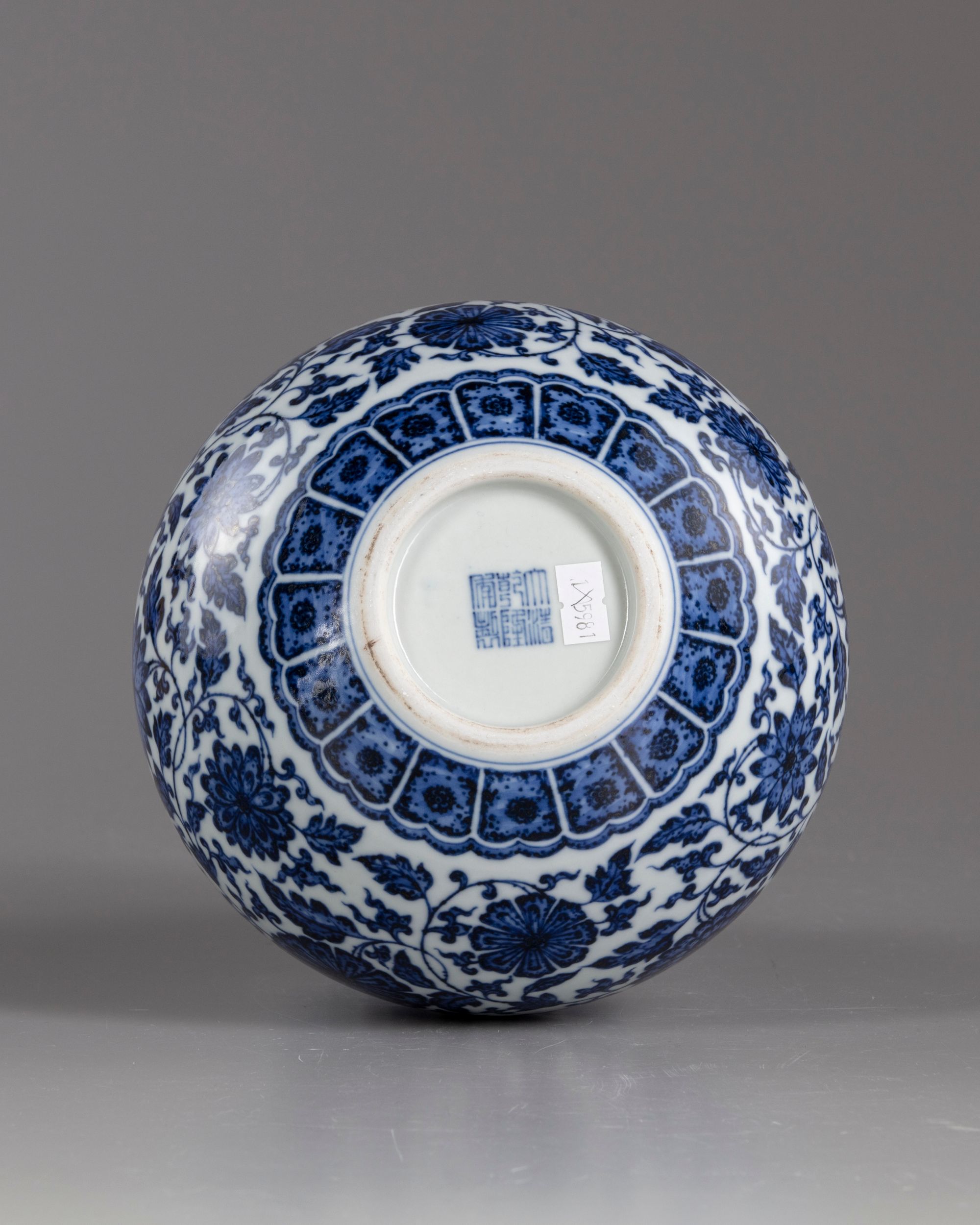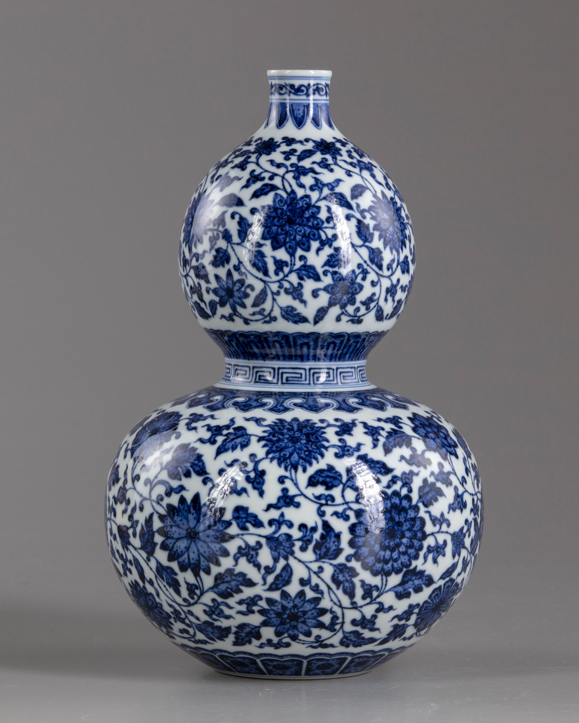 The two globular sections of the body are decorated with flowers on leafy scrolling vines, the waist and the foot are decorated with lappets. The base bears an apocryphal Qianlong mark.