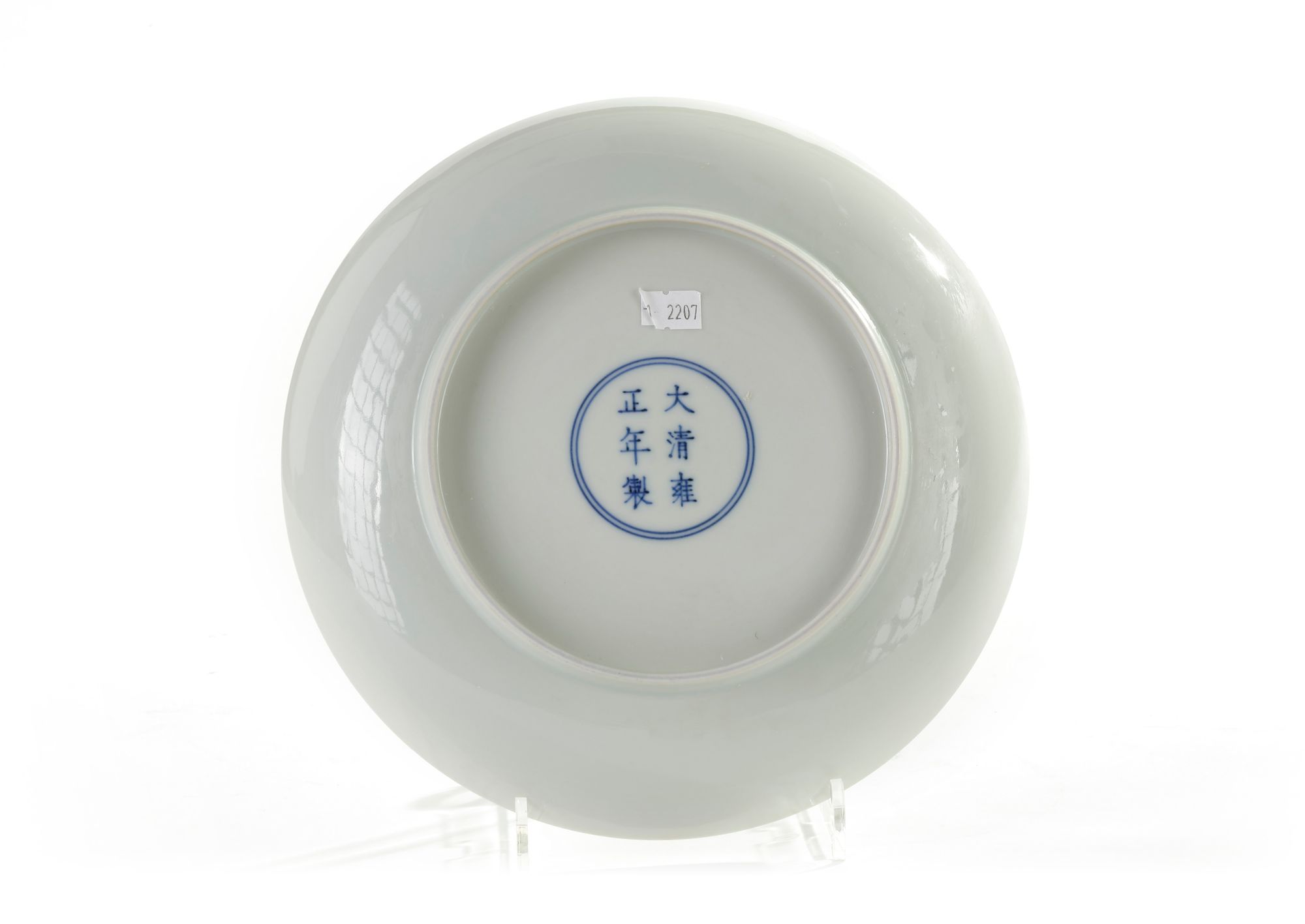 The dish is decorated with ladies at leisure with children in a fenced garden, surrounded by three female musicians playing various instruments. The base with an apocryphal Yongzheng six character mark.