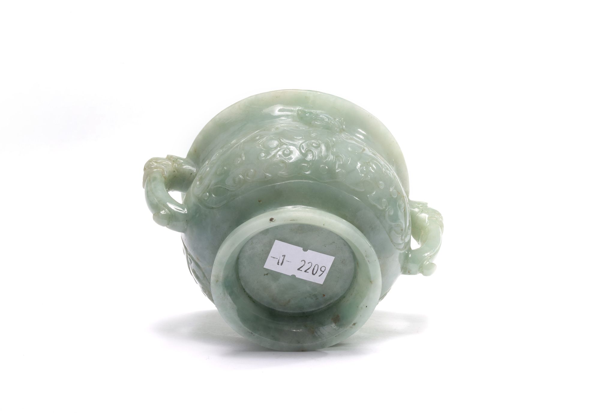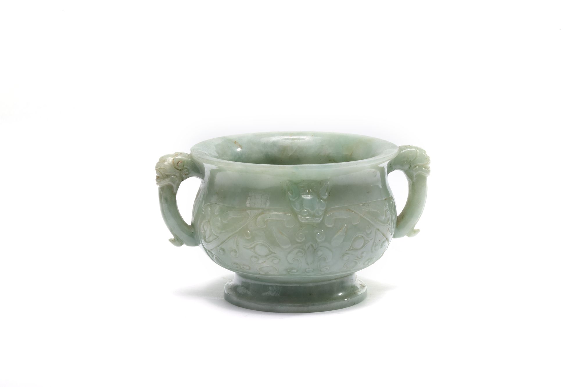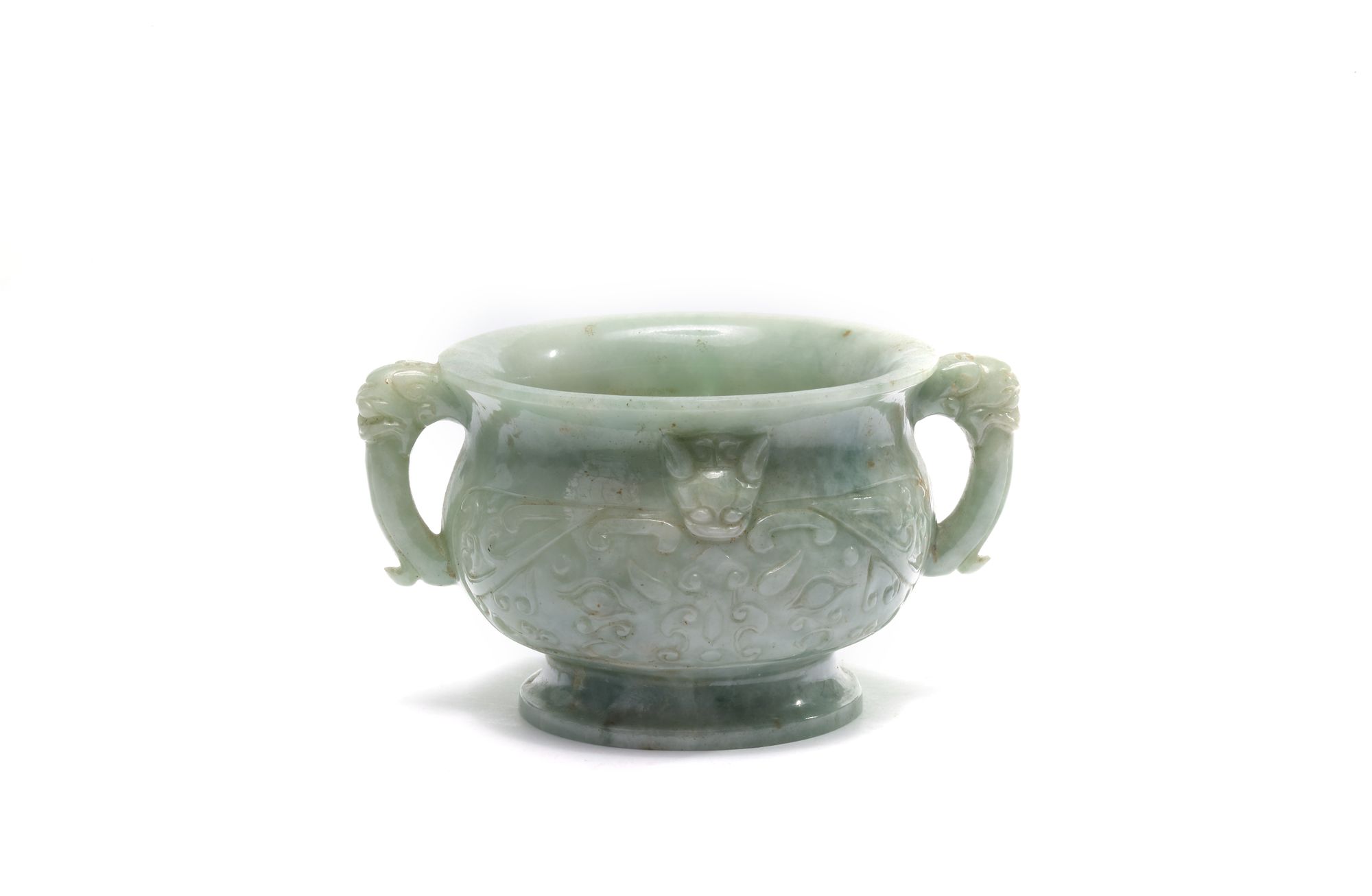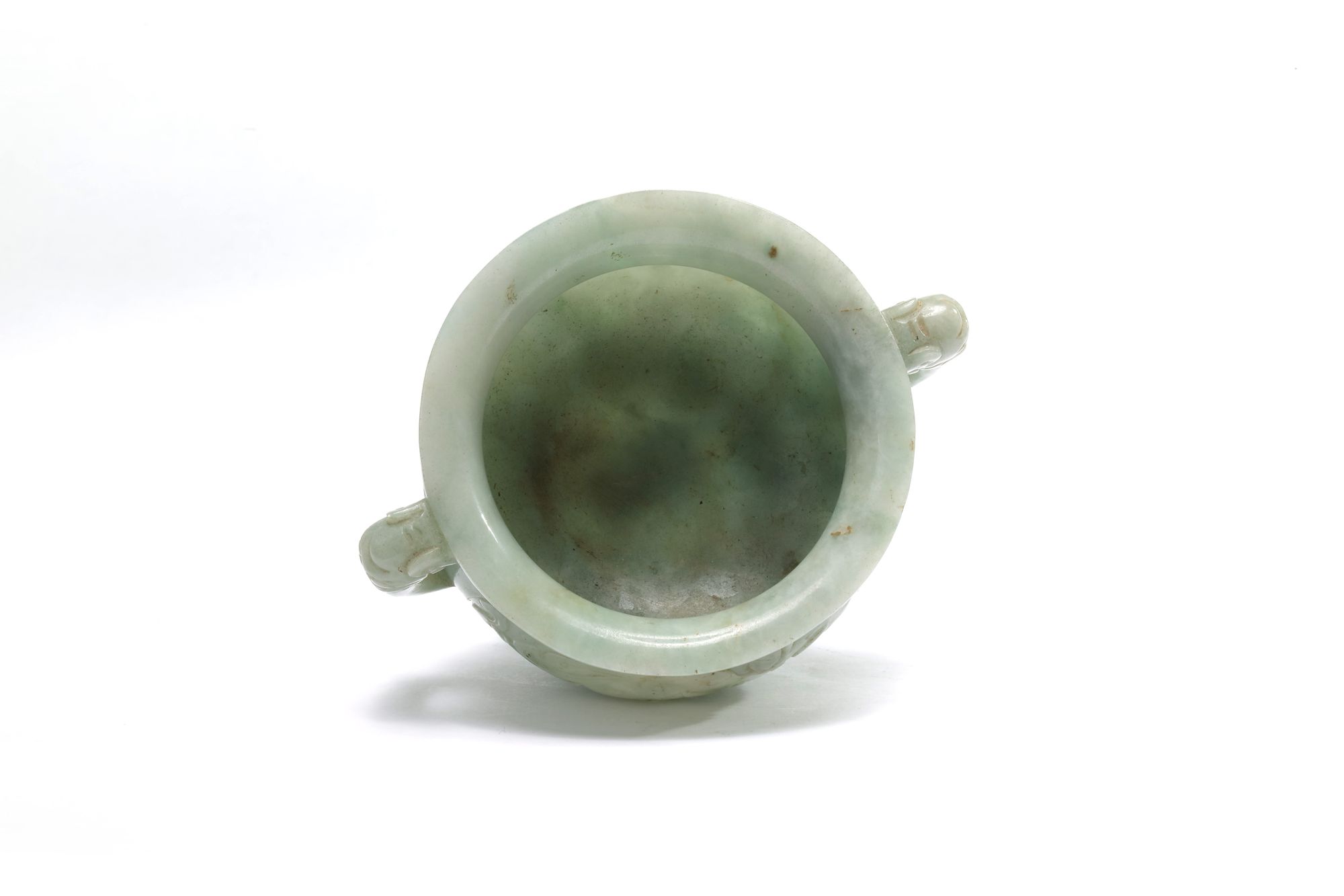 The censer is fashioned with two beast head handles to the neck, the squat body is carved with two panels containing a taotie mask below a single mask in low relief. The stone of a celadon tone with light apple green inclusions.
