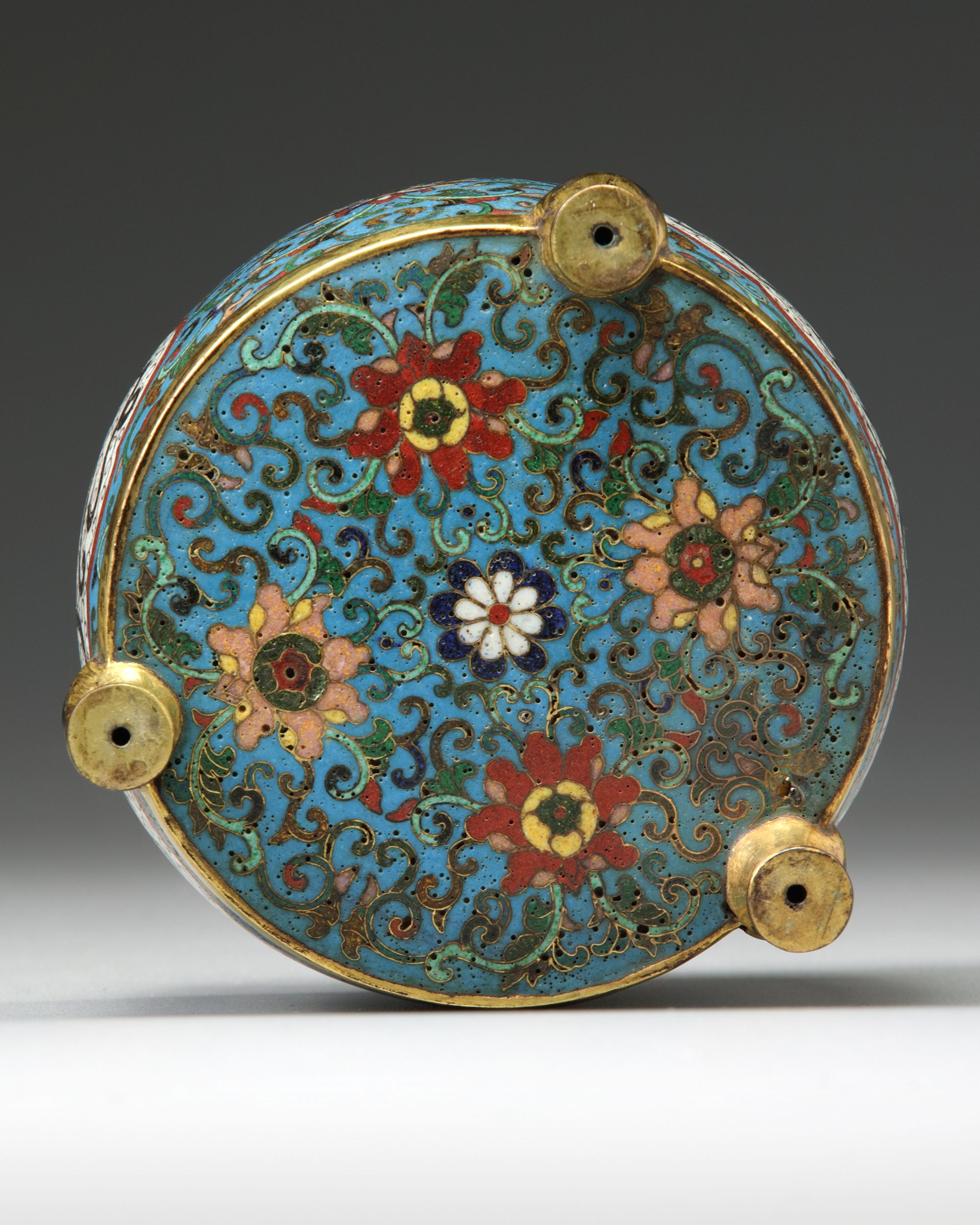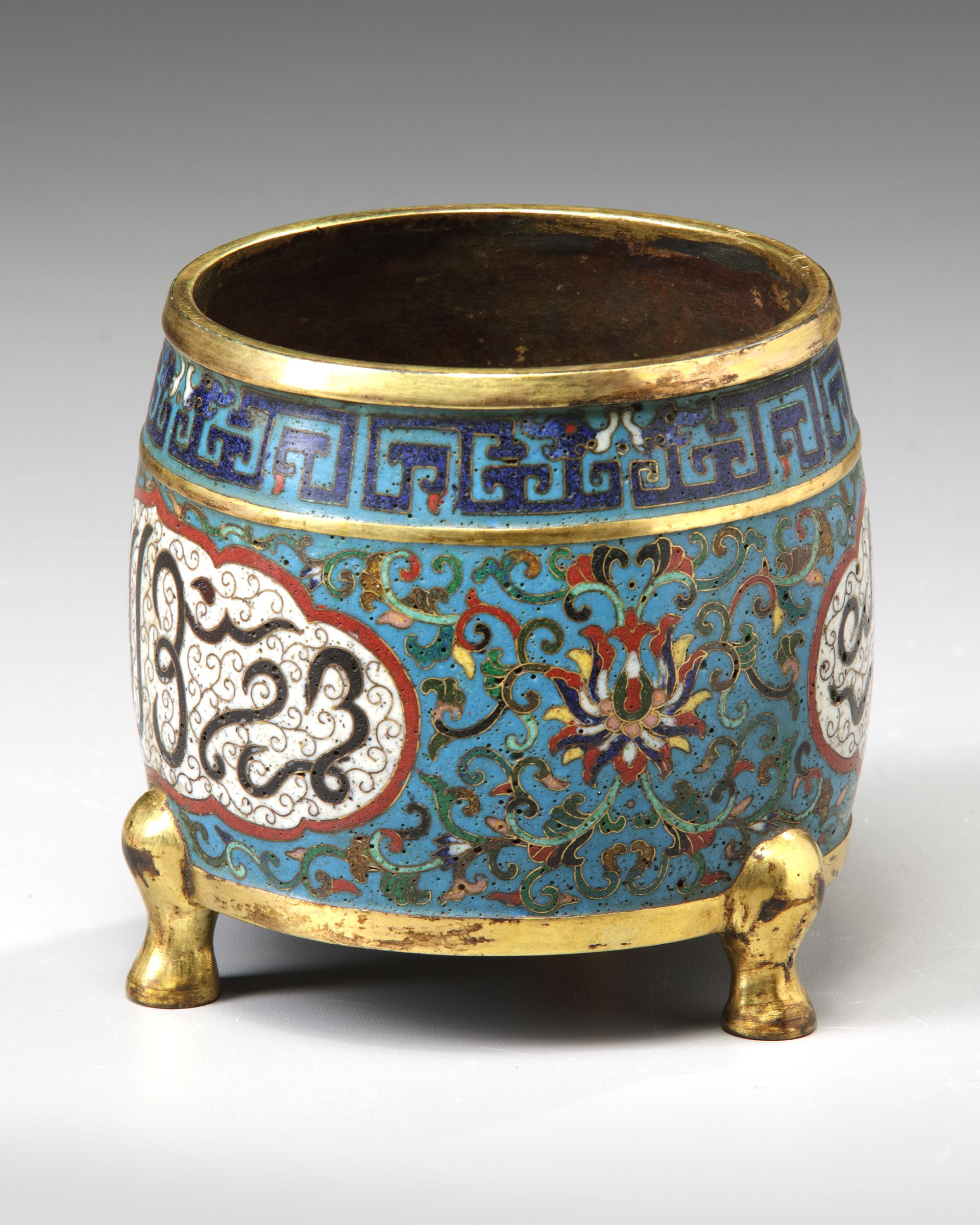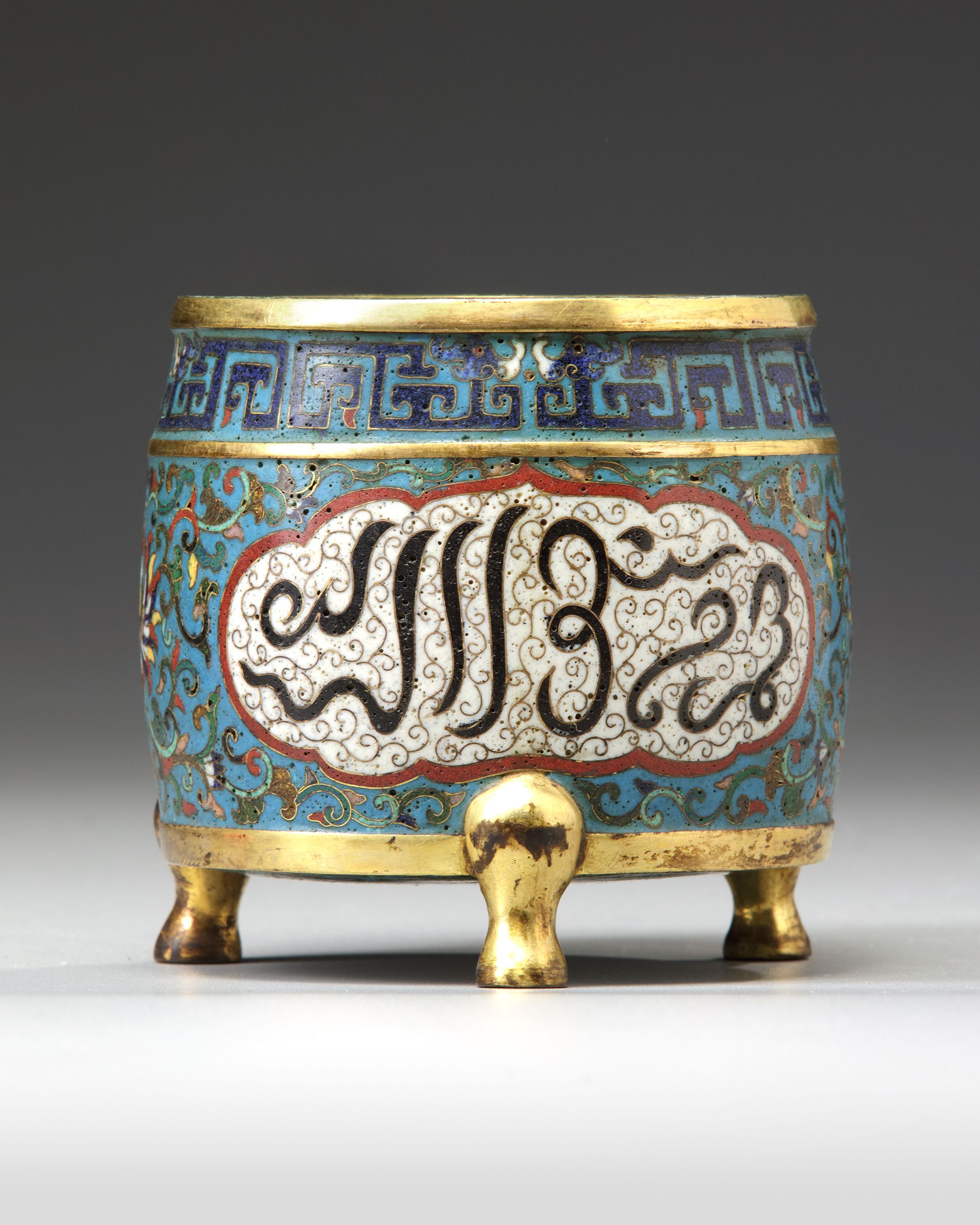Of compressed globular shape standing on three conical feet, with two ruyi-shaped cartouches containing Islamic script on a ring-punched ground, the exterior with a cloisonné decorated with lotus and foliage.
