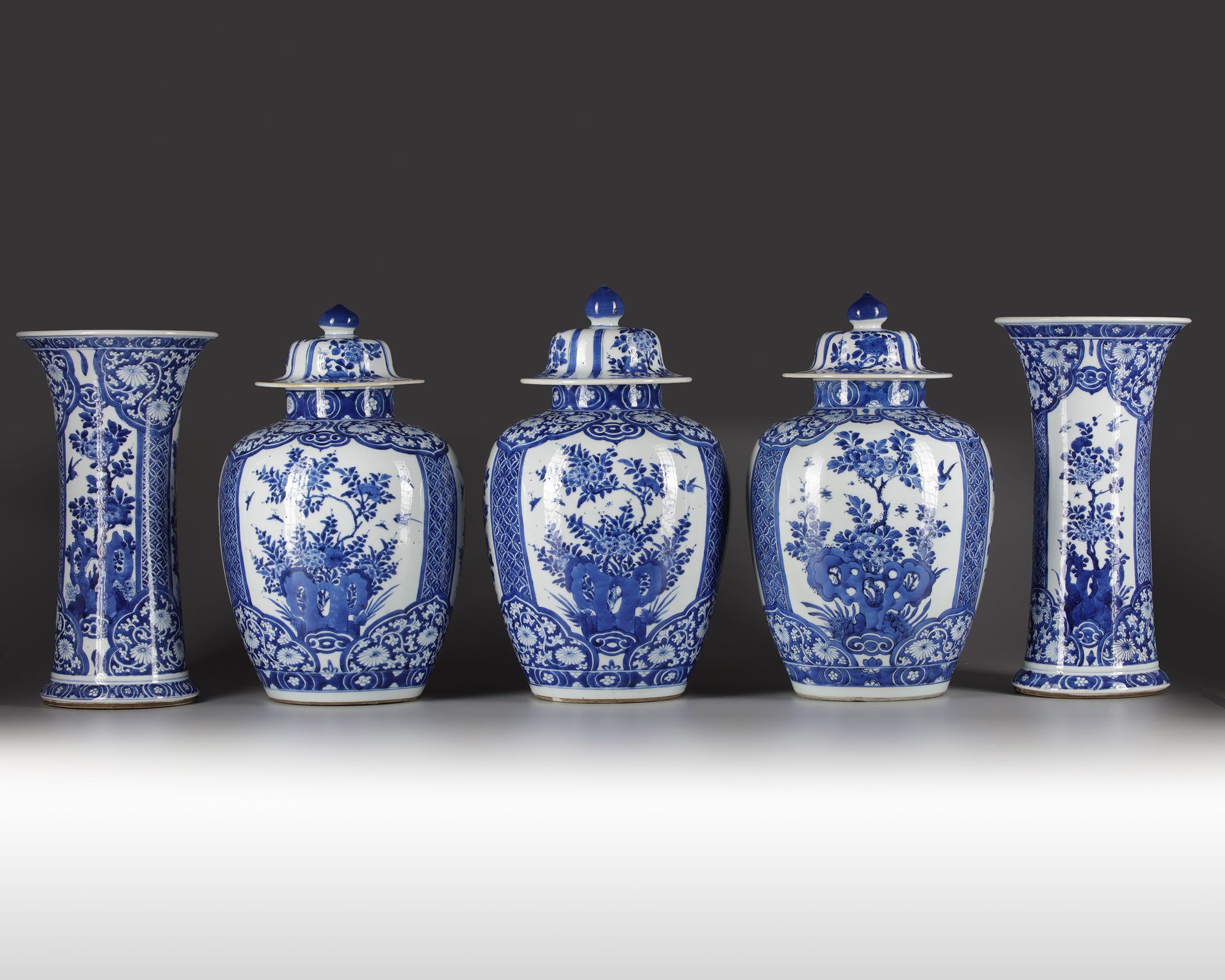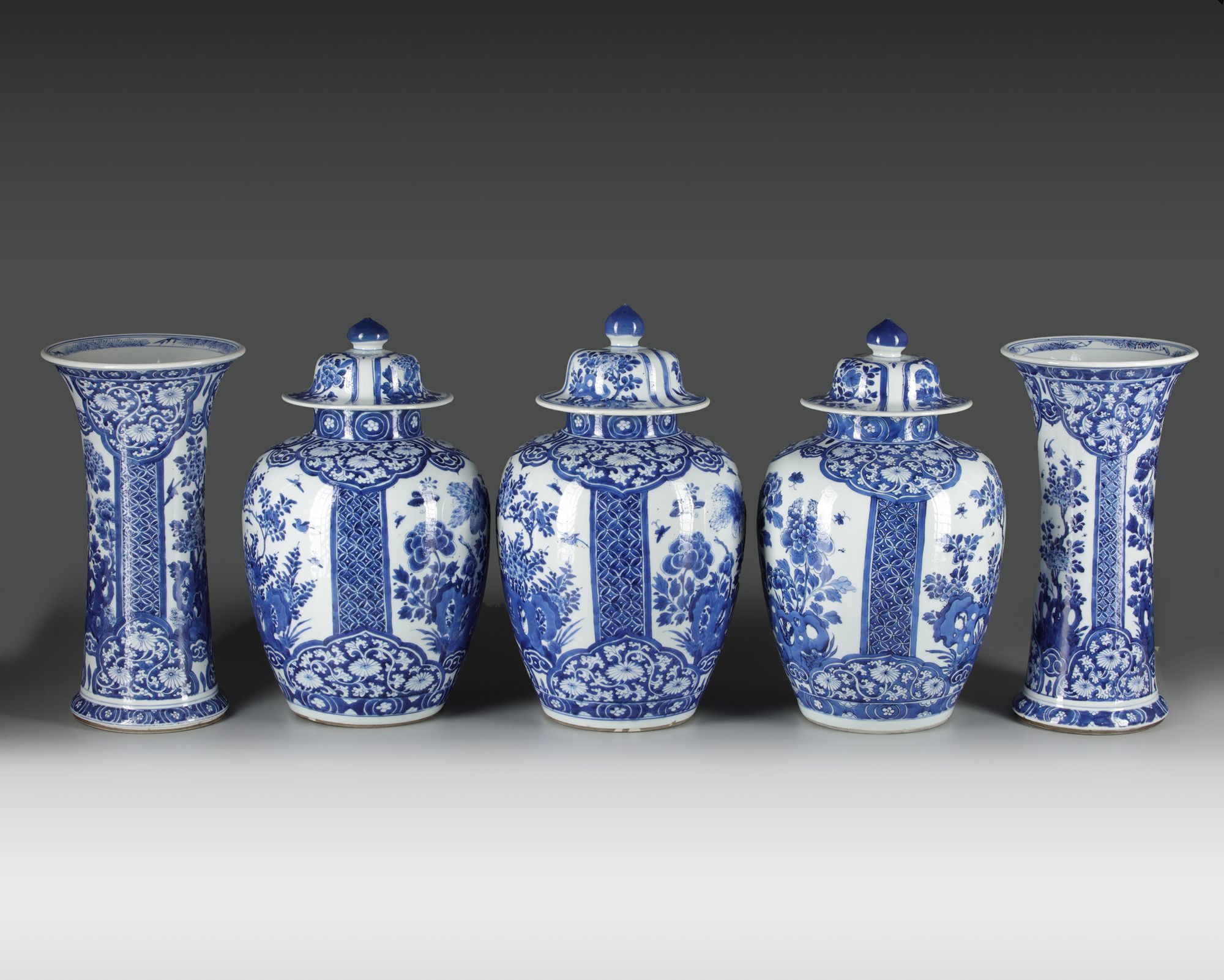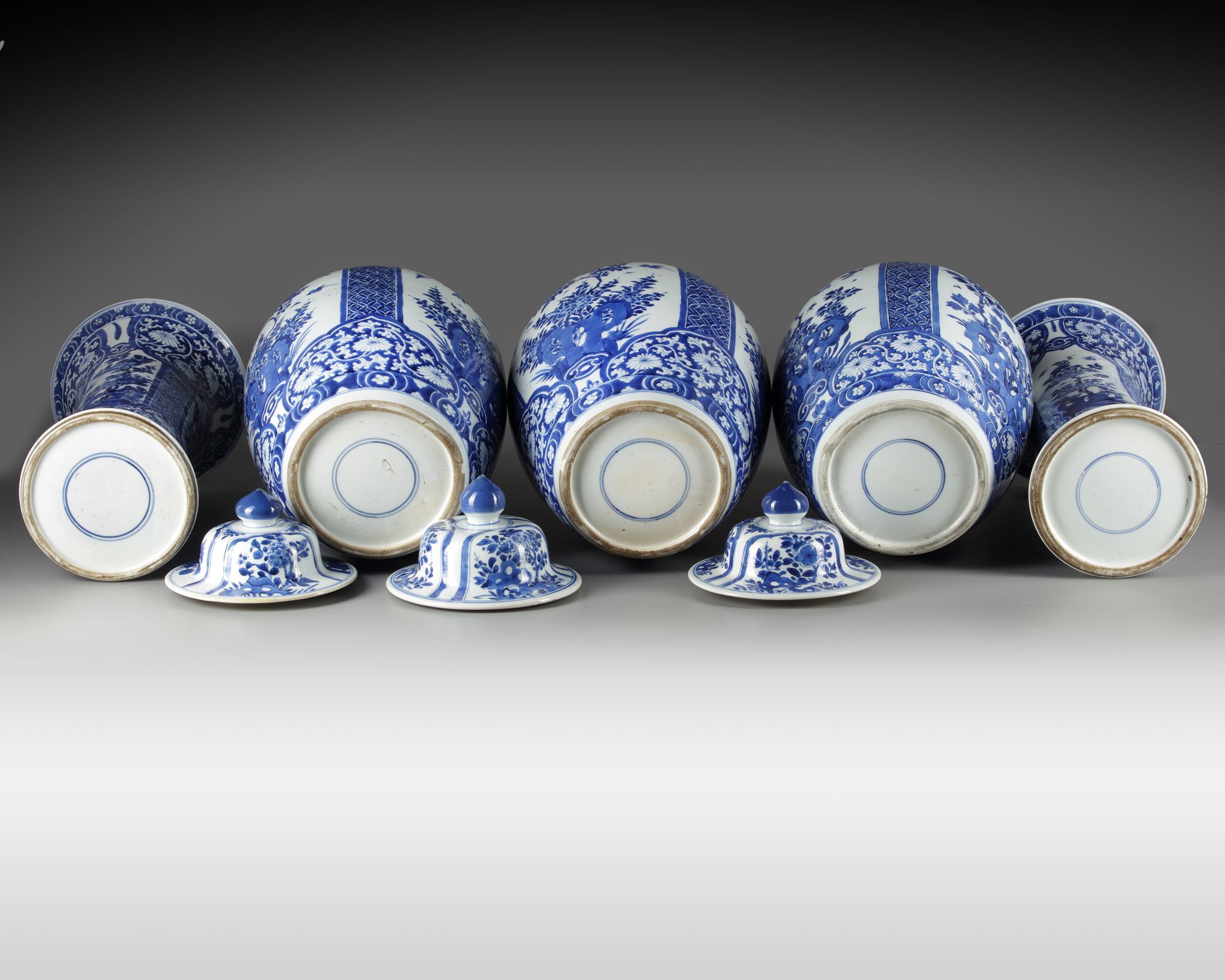 The group comprises three jars and covers and two trumpet vases, all well-decorated with a panels enclosing flowers growing from rocks, separated by brocade-patterned borders. The shoulders and feet are decorated with ruyi-shaped lappets. The domed covers of the vases are decorated with floral panels and are surmounted by lotus bud finials. The vases each bear an underglaze blue double circle mark.