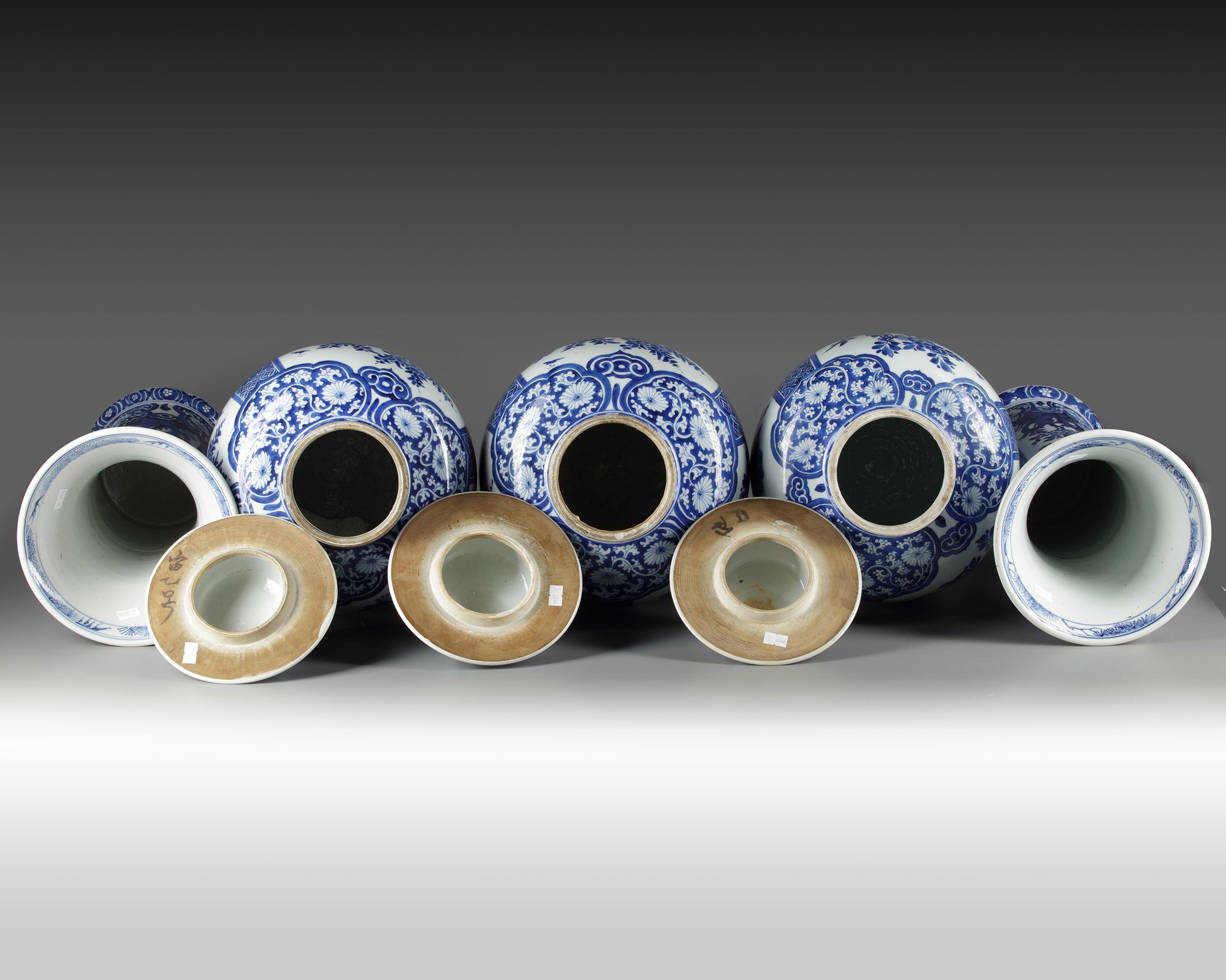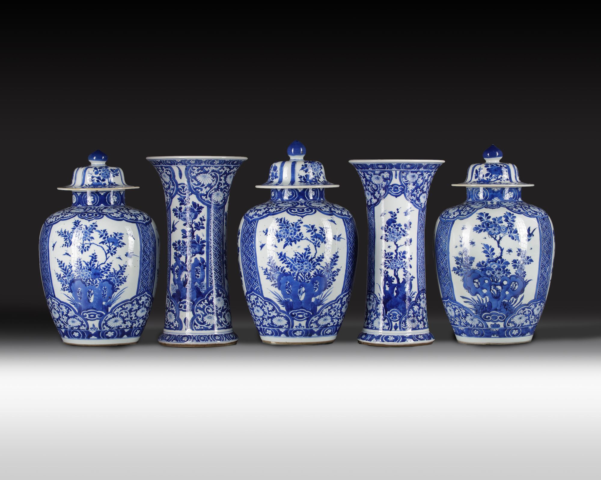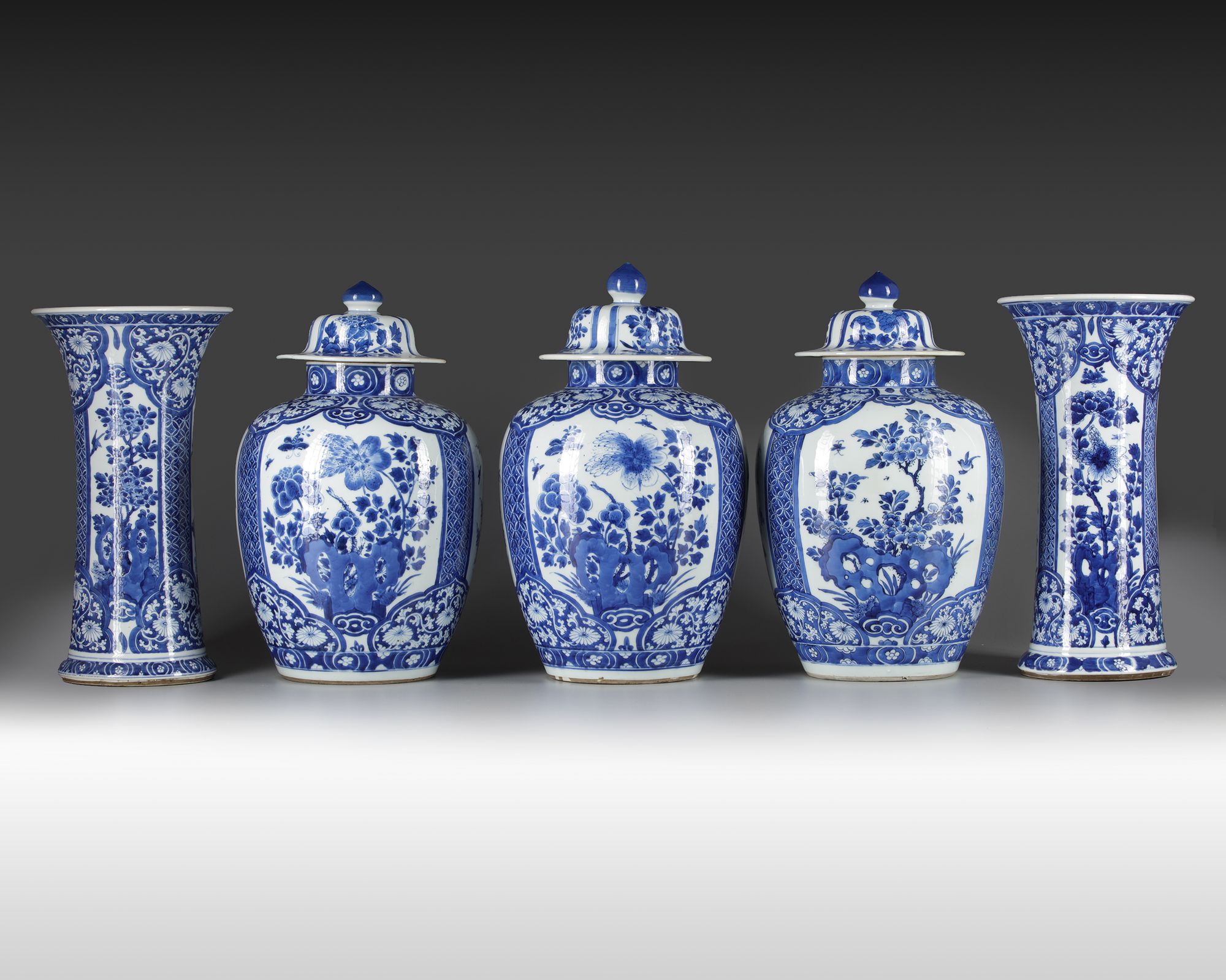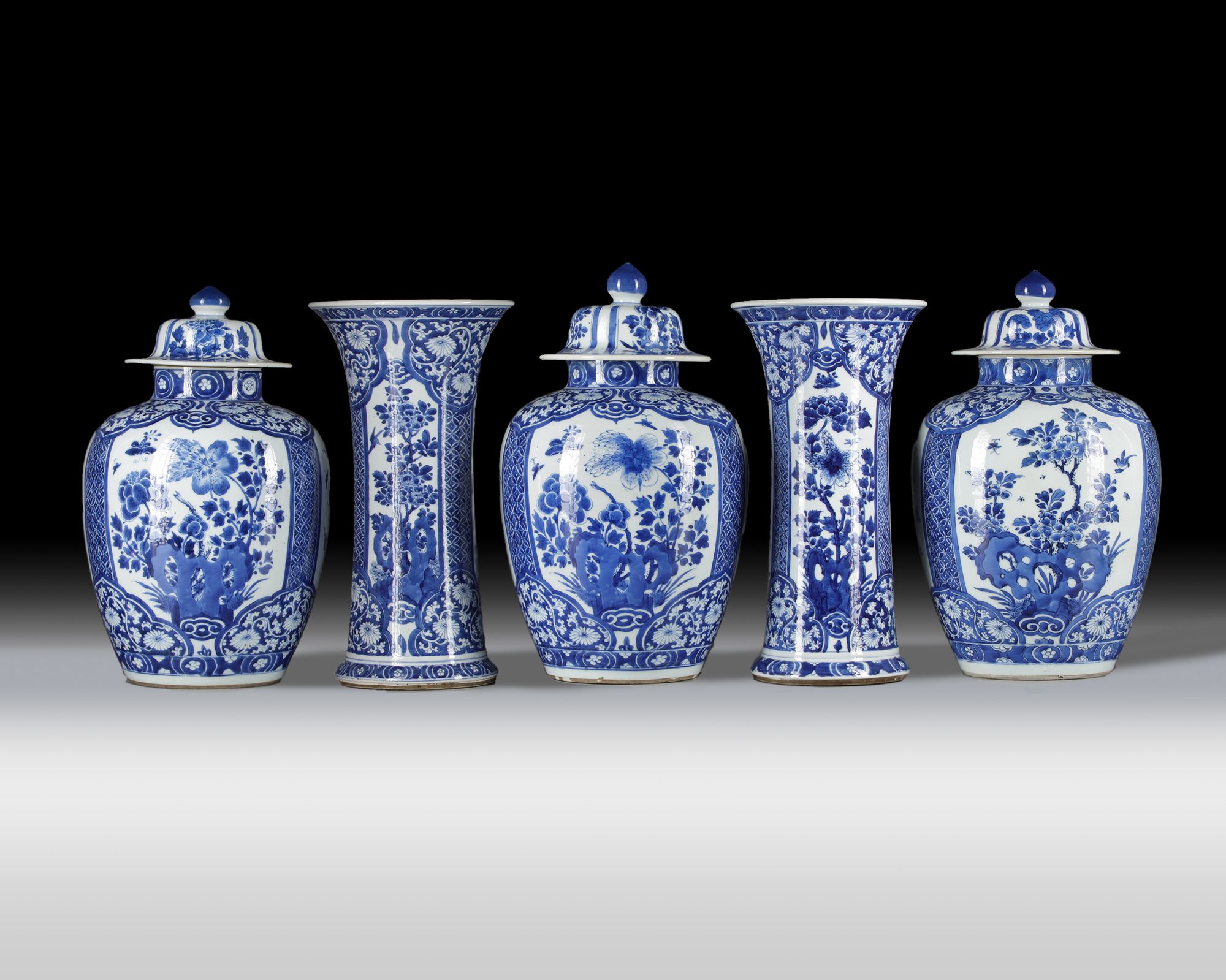 The group comprises three jars and covers and two trumpet vases, all well-decorated with a panels enclosing flowers growing from rocks, separated by brocade-patterned borders. The shoulders and feet are decorated with ruyi-shaped lappets. The domed covers of the vases are decorated with floral panels and are surmounted by lotus bud finials. The vases each bear an underglaze blue double circle mark.