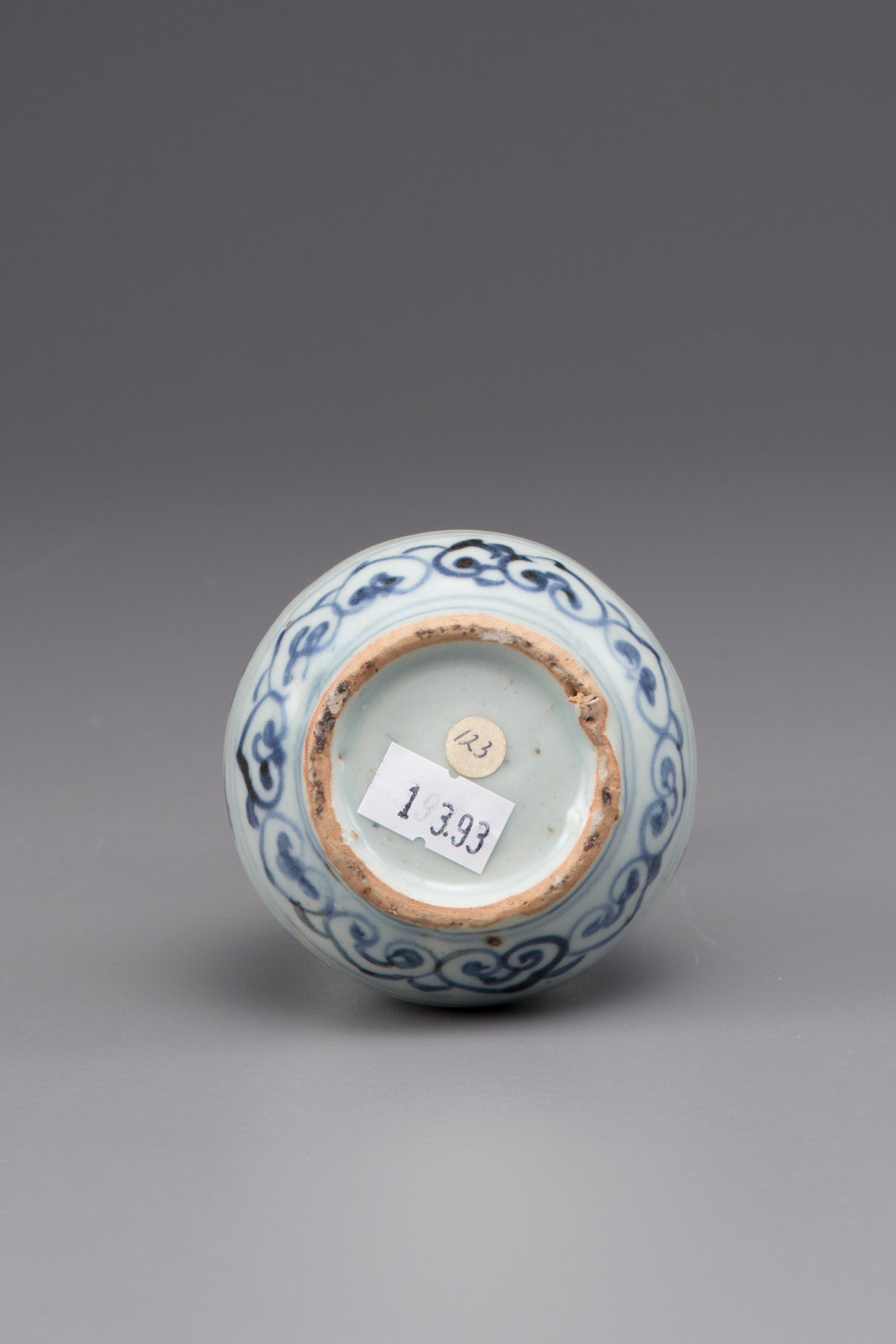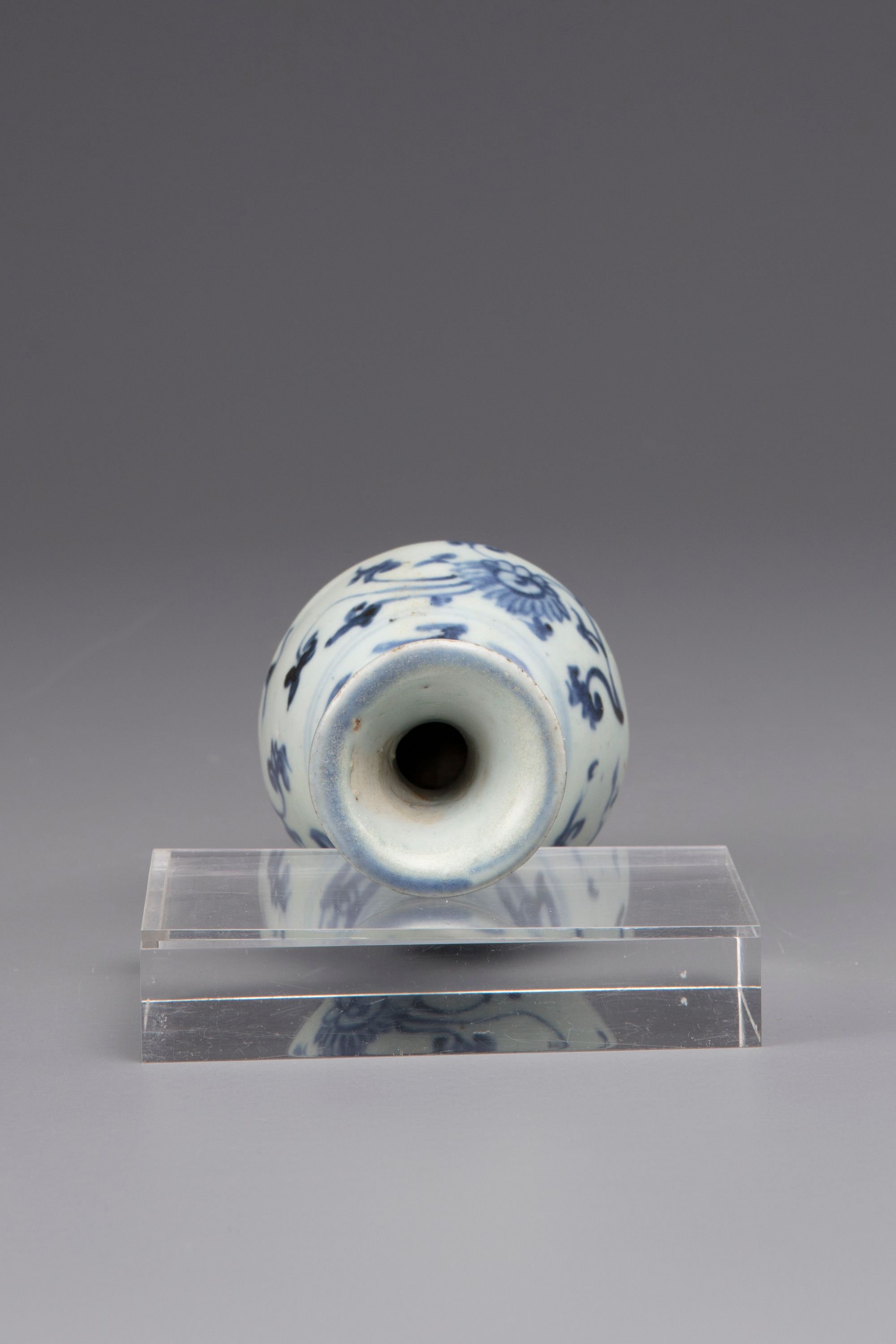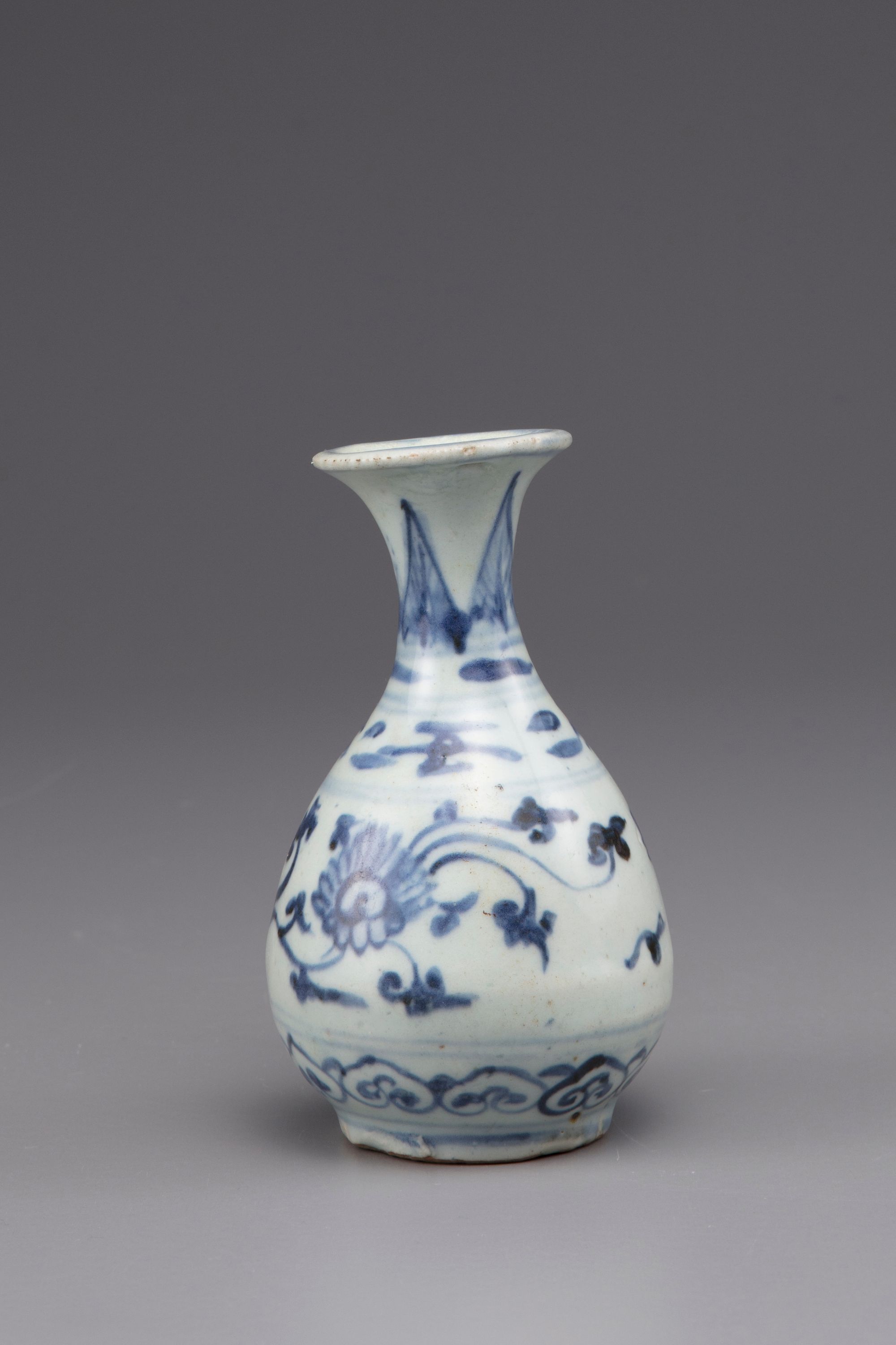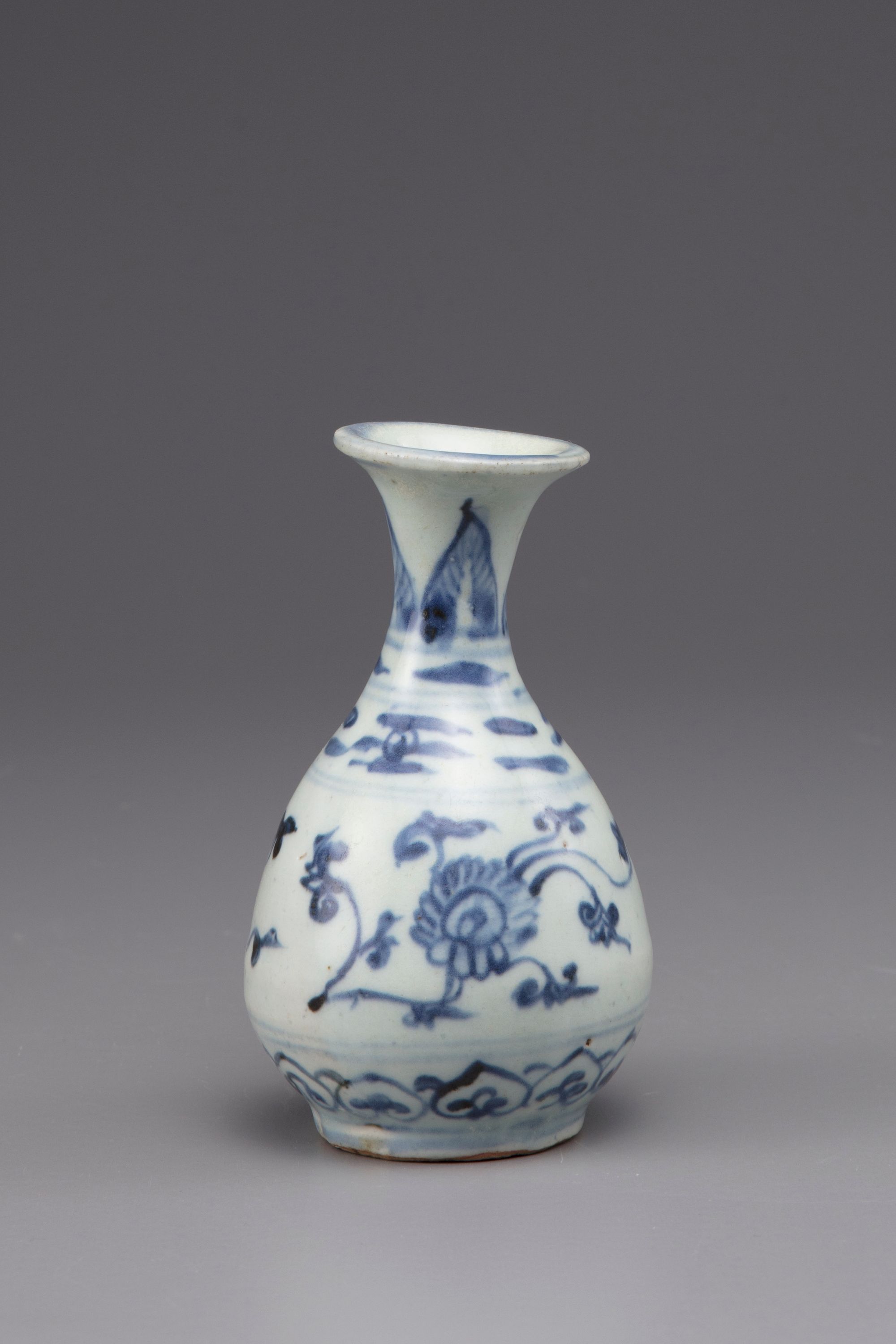 Pear-shaped vase with short neck and flaring mouth and decorated in underglaze blue.