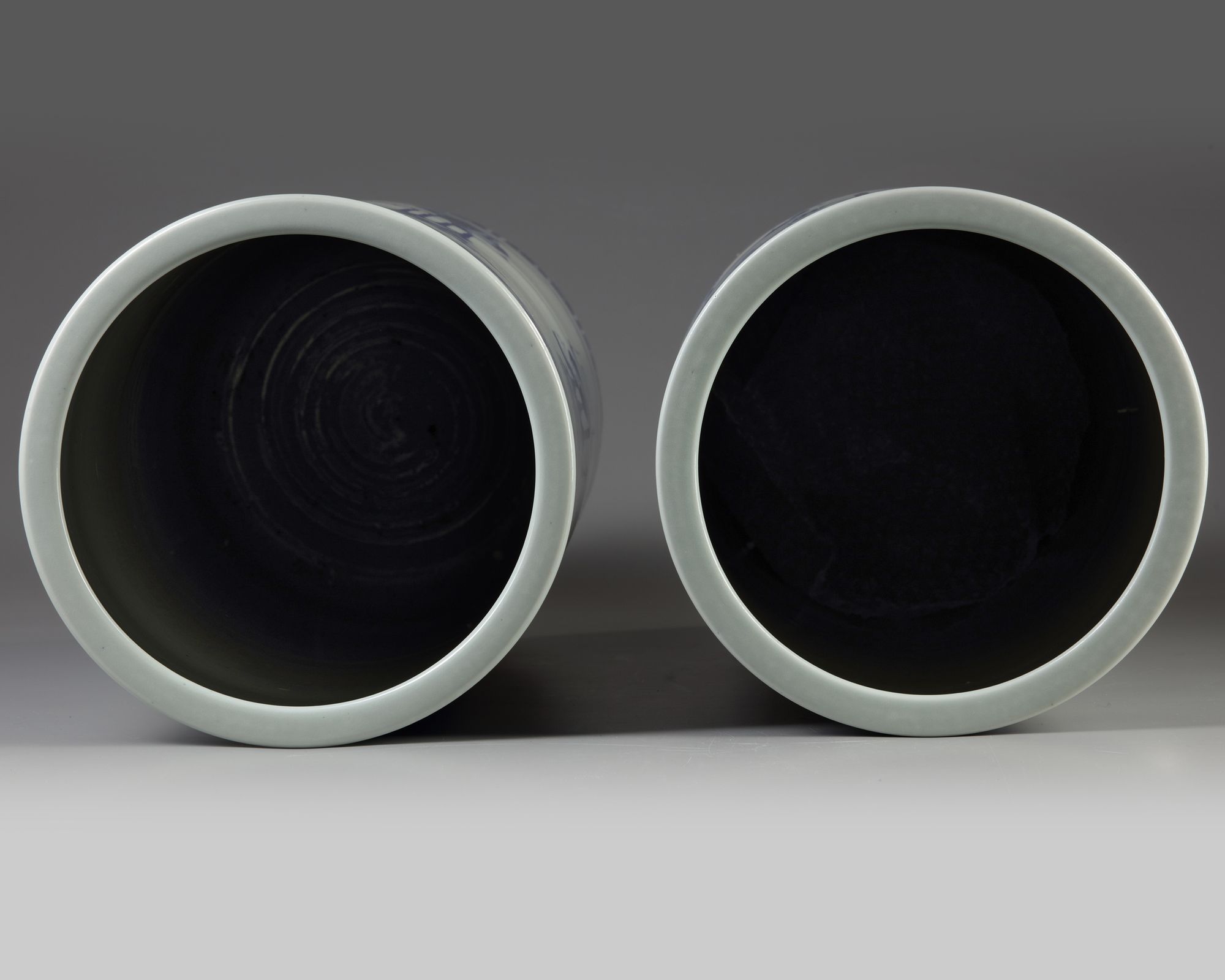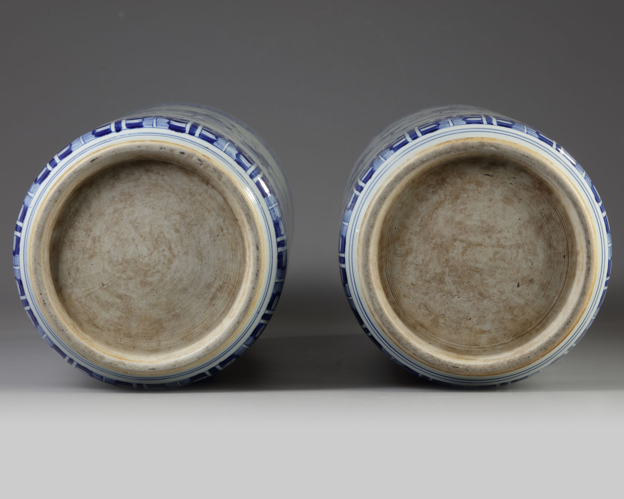 The two stands are decorated to the sides with a continuous scene of ladies at play on musical instruments amongst precious objects on stands ,ruyi sceptres and butterflies. All between a broad band of Fu bats amongst clouds and a key fret chain to the rim and a petal border to the base.