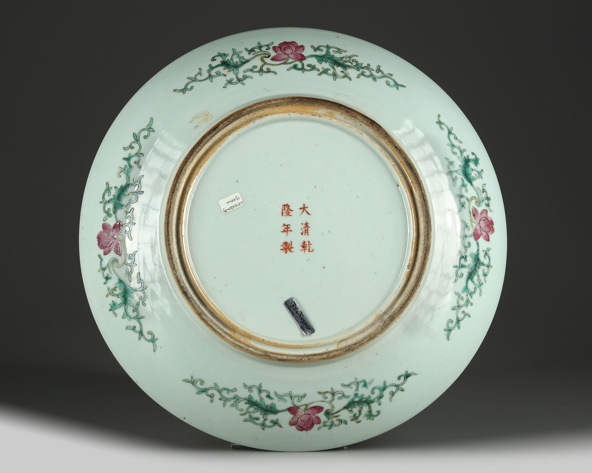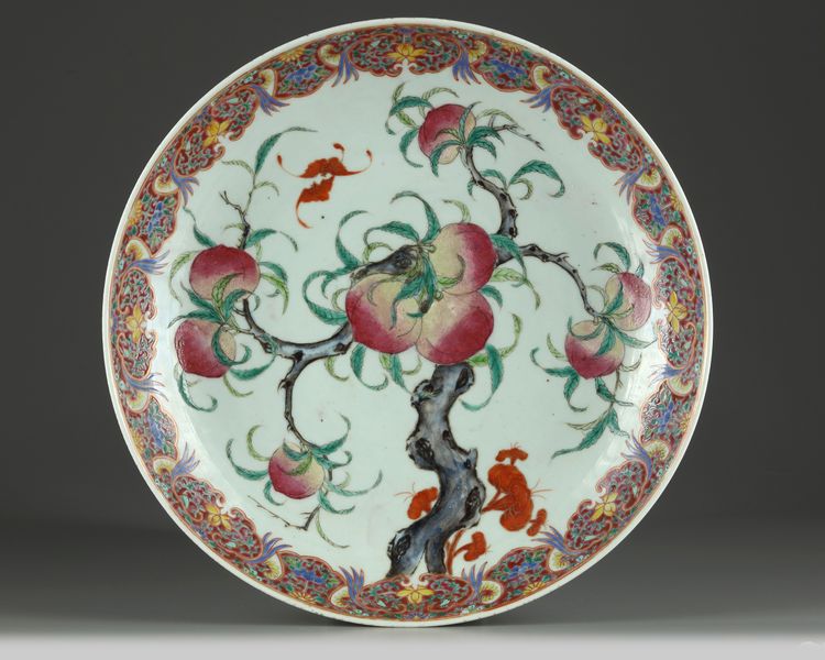 The dish is decorated with nine peaches growing from a leafy gnarled tree growing beside iron-red and gilt lingzhi fungus, below two iron-red bats in flight. The rim is decorated with a gilt pomegranate-shaped panel enclosing scrolling flowers on a puce ground. The reverse is decorated with four lotus sprays, and the base with an apocryphal Qianlong mark in iron-red within a channelled footrim.