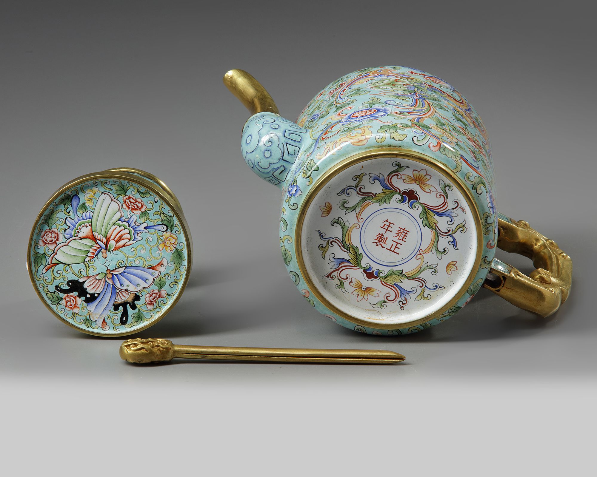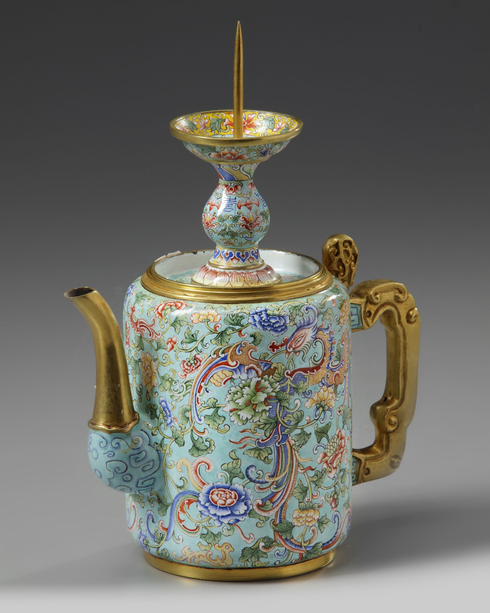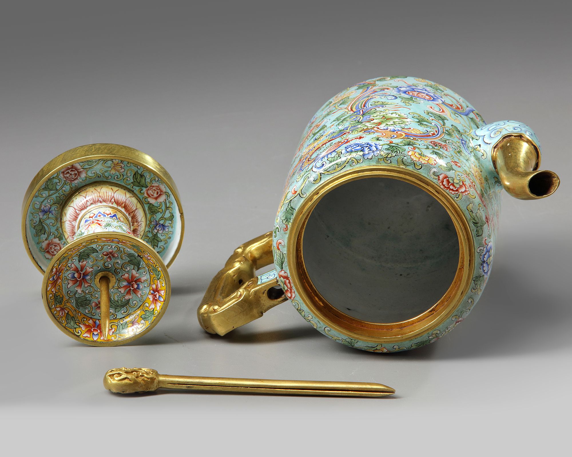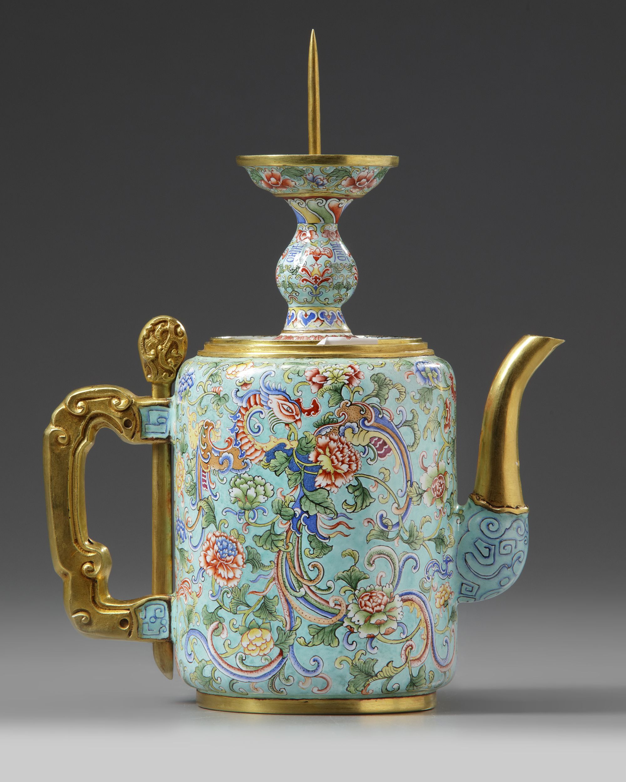 The body is finely enamelled with beautifully plumed phoenix amongst densely scrolling peonies on a rich turquoise ground. The body is affixed with a gilt bronze spout and an archaistic C-shaped handle inset with gilt bronze tweezers. The underside is inscribed with an apocryphal Yongzheng reign mark. The cover is decorated with shou characters interspersed with scrolling lotus, all surmounted by a small dish and a golden pricket. The underside decorated with two butterflies. 22 cm high.
