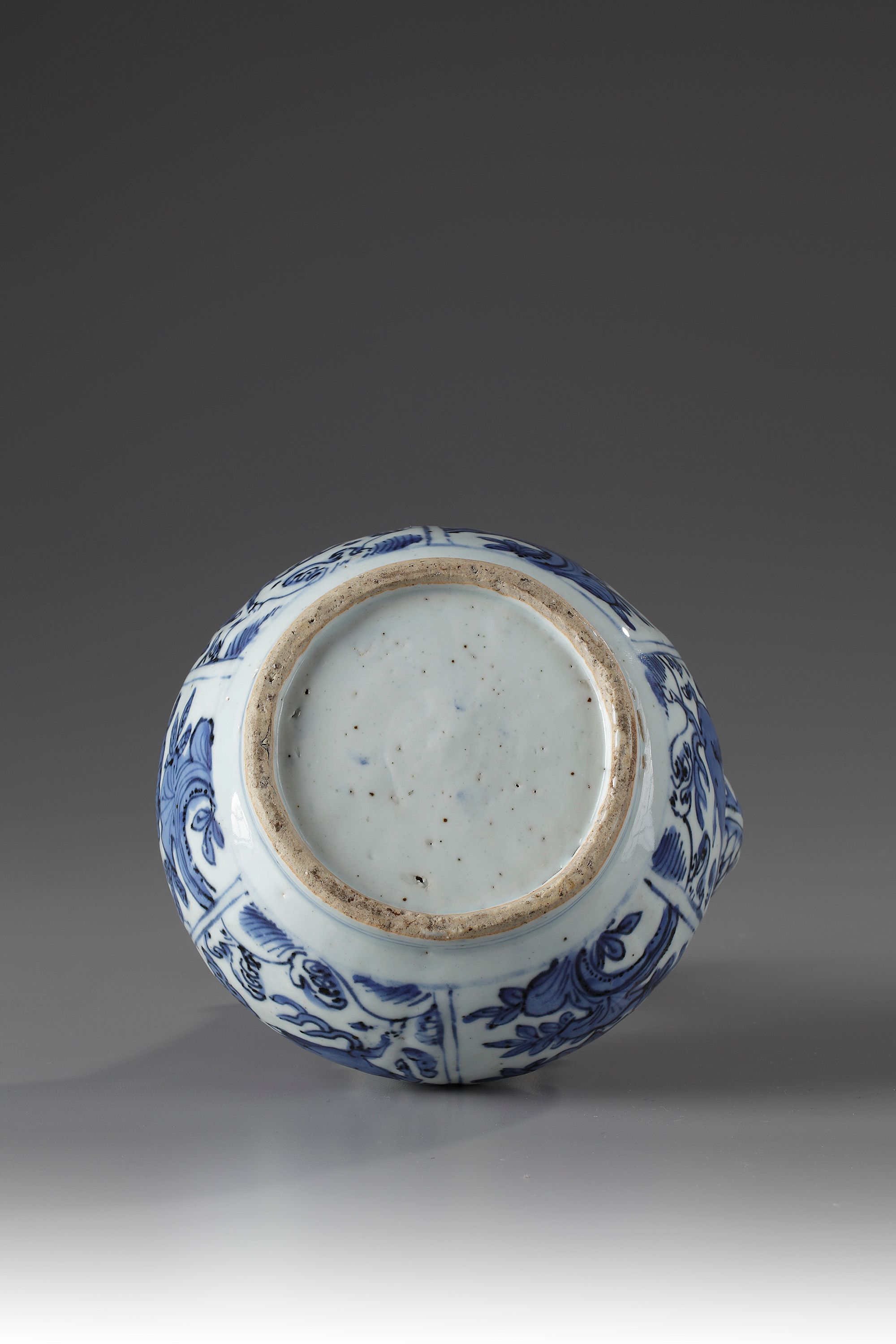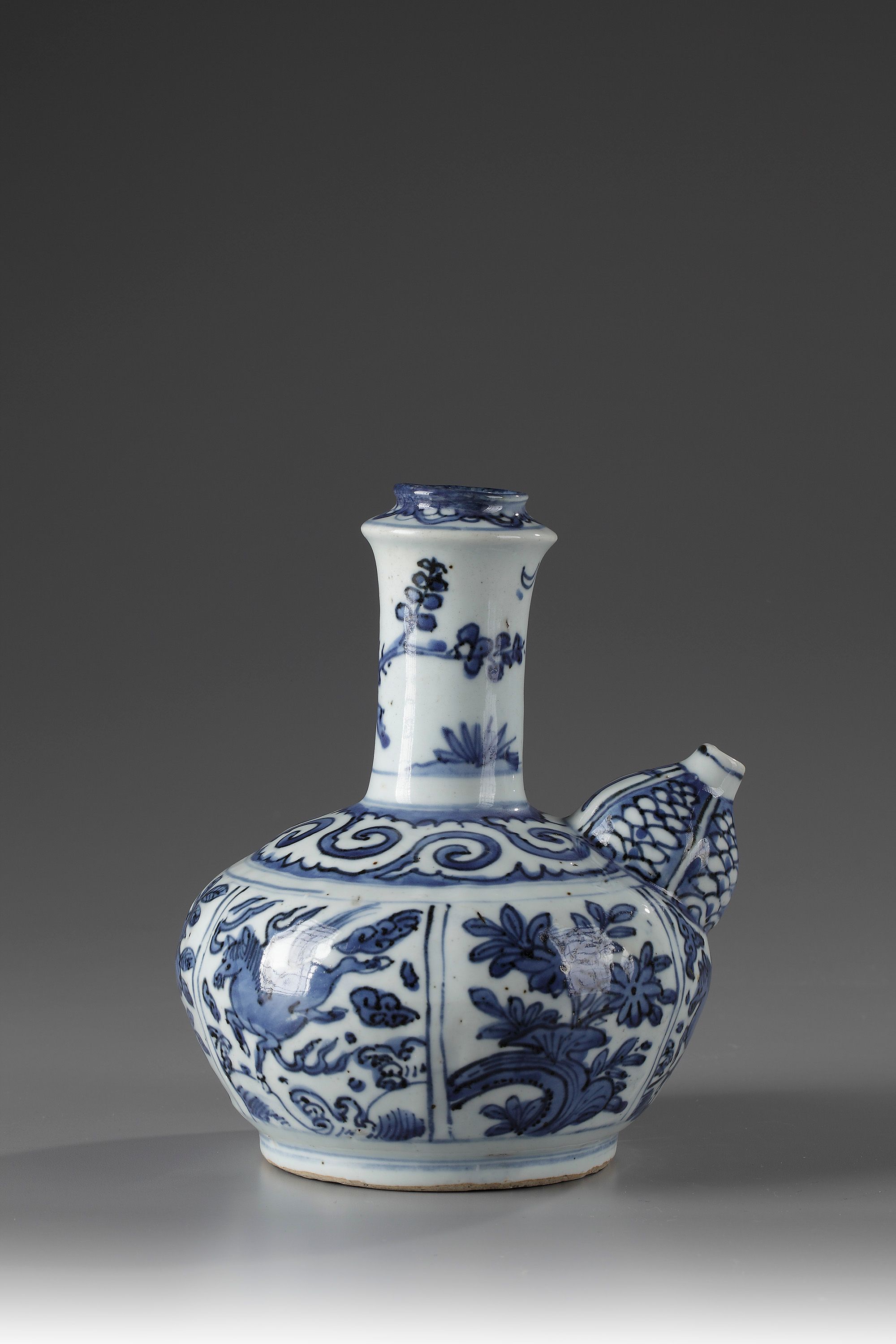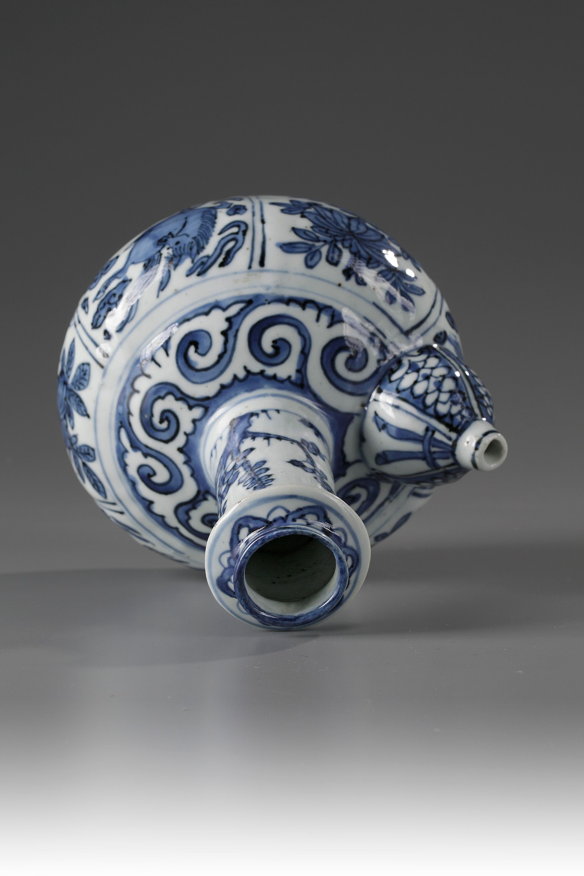 painted and moulded with panels of flowers and landscapes with a jumping horse, beneath a band of scroll work, the neck decorated with a flowering tree in a landscape and a crescent moon.