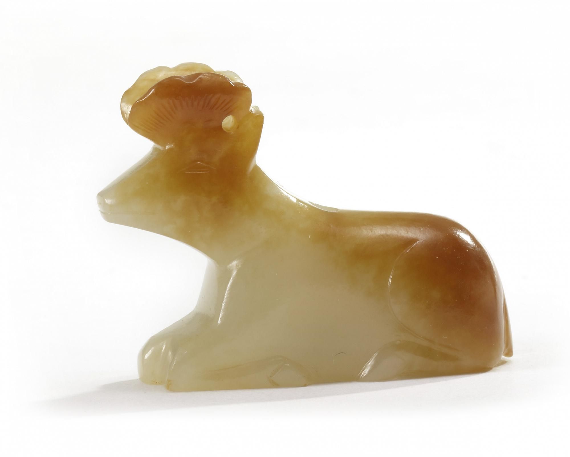 The animal is carved recumbent, the stone is of a celadon tone with russet inclusions. The toggle is drilled with an aperture to the centre.