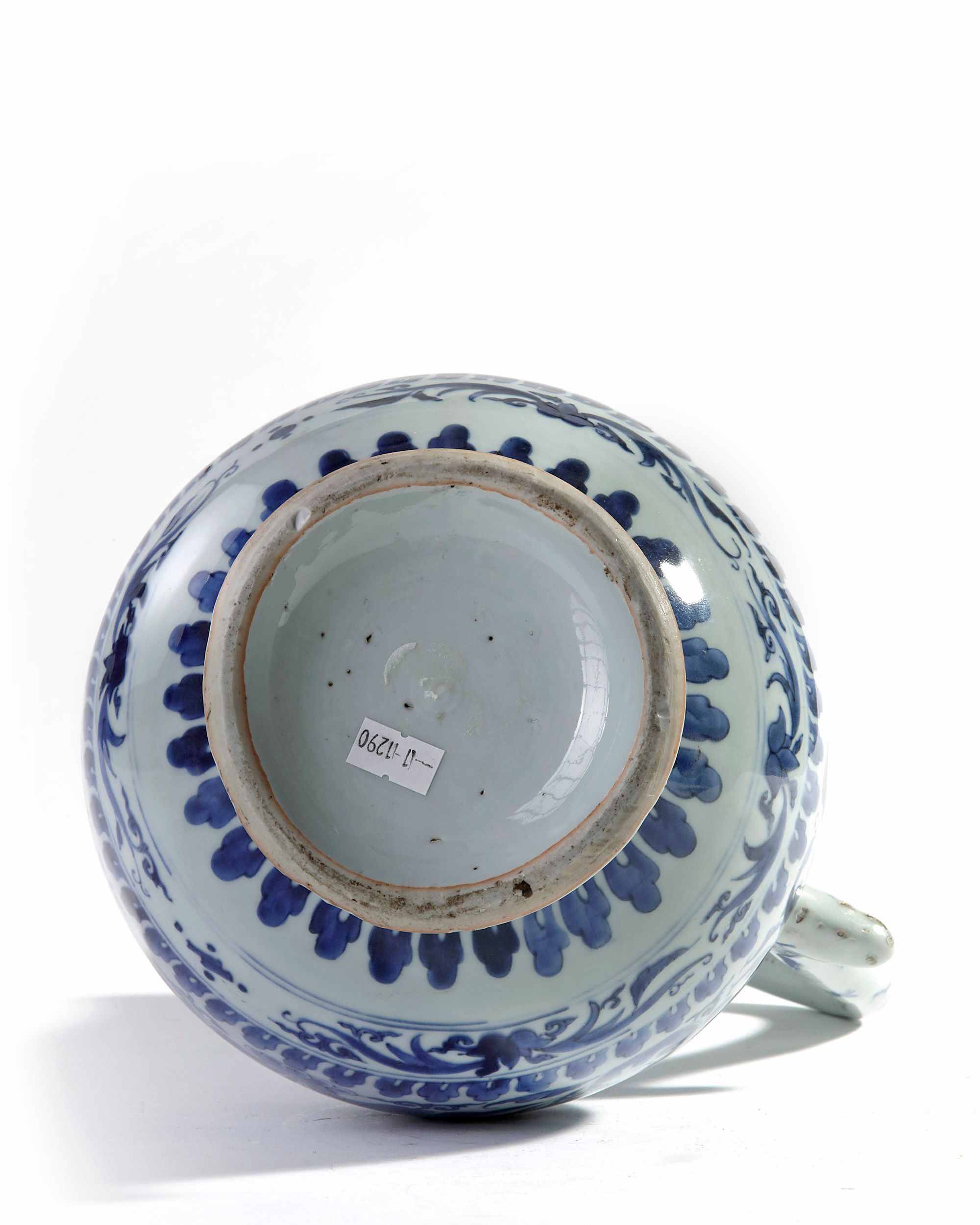 The pear-shaped body applied with a loop handle, the exterior is painted in a vibrant blue with scrolling flowers between petal on the shoulder and the foot. The neck is decorated with upright tulips.