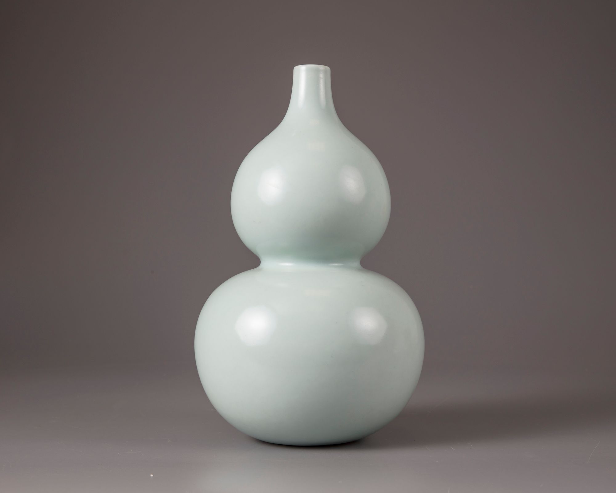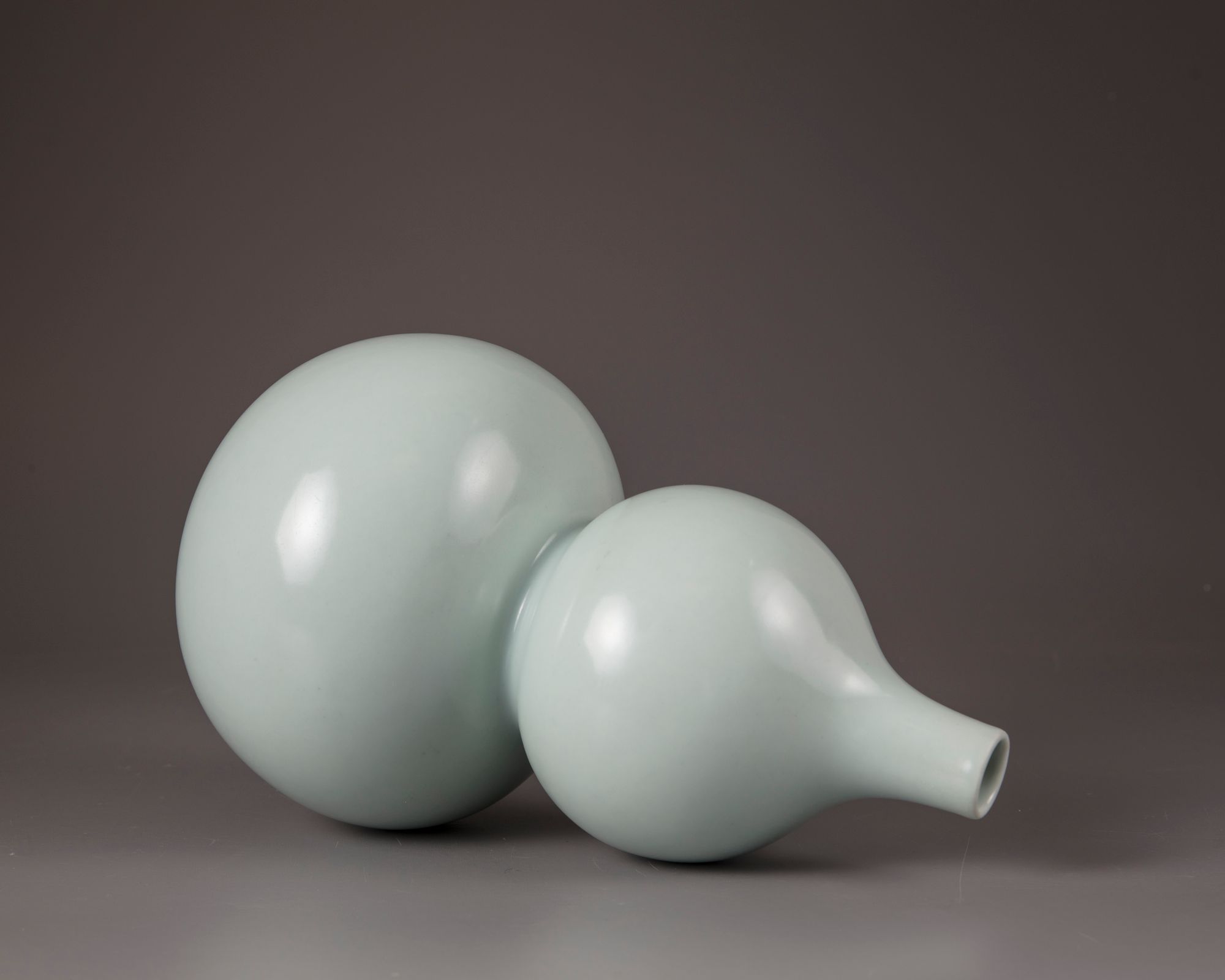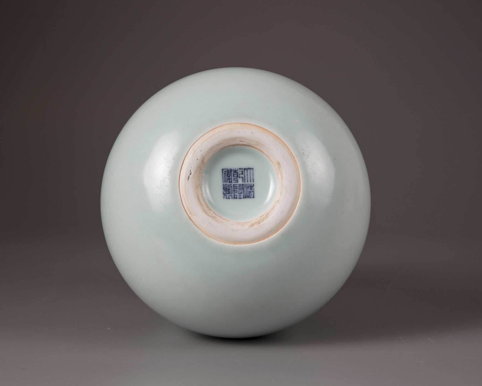 The vase is modelled with a globular lower section below a narrow waist leading to a tapered upper section and narrow rim. The vase is covered overall save for the foot in an even pale celadon glaze. The base with an apocryphal Qianlong mark.