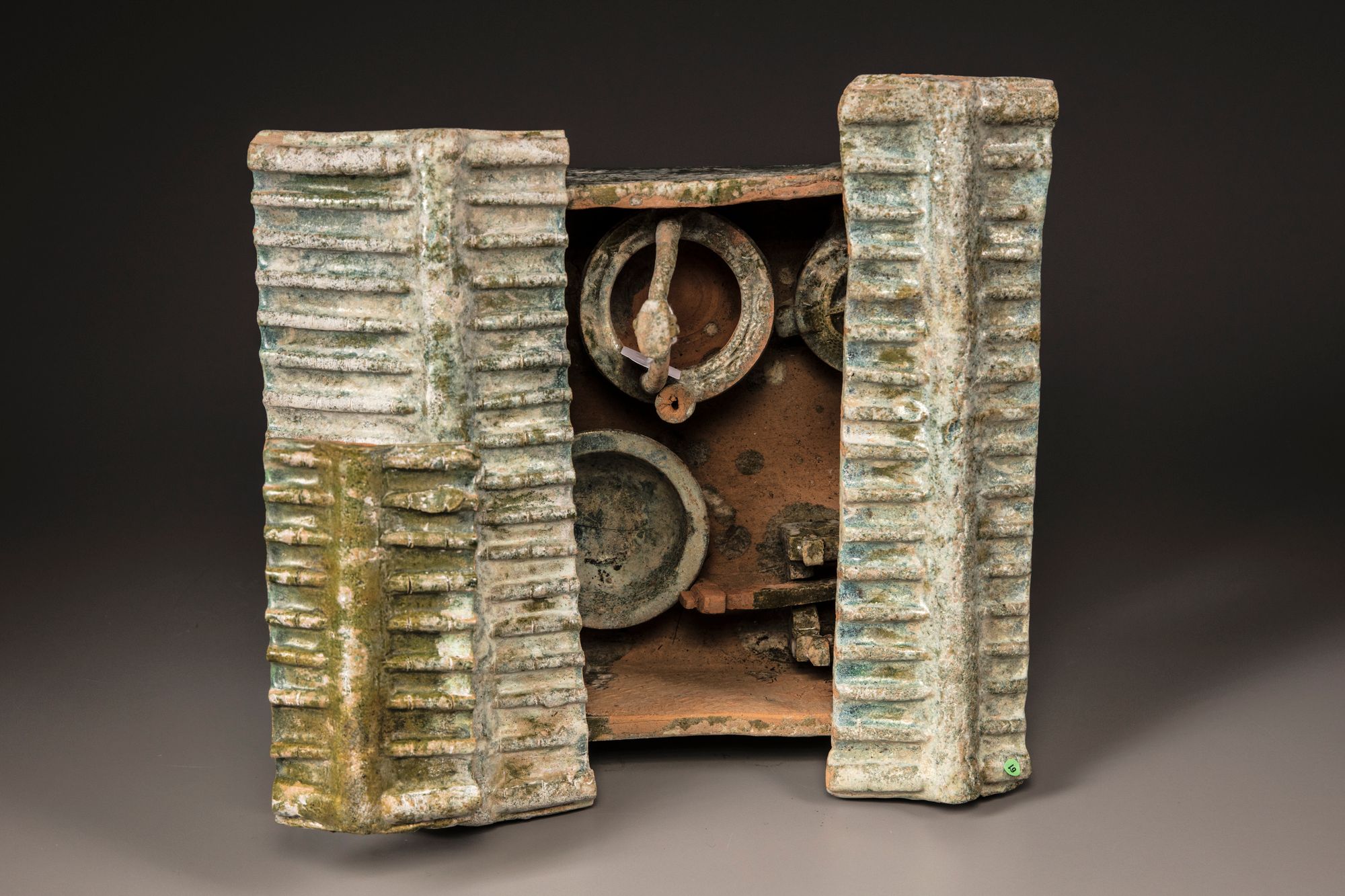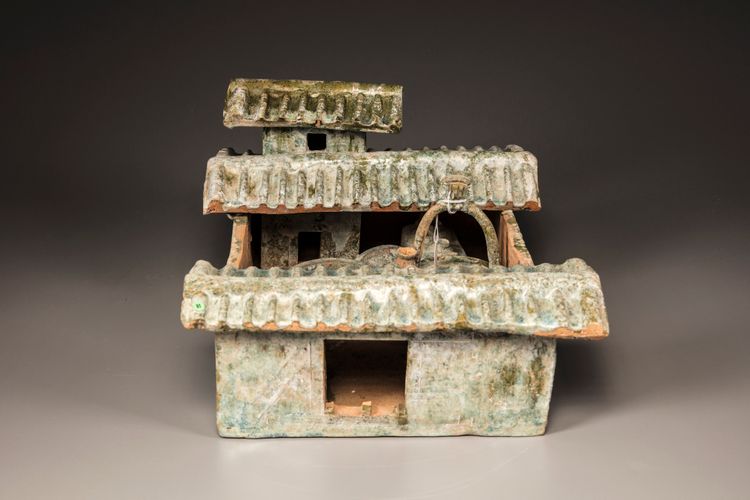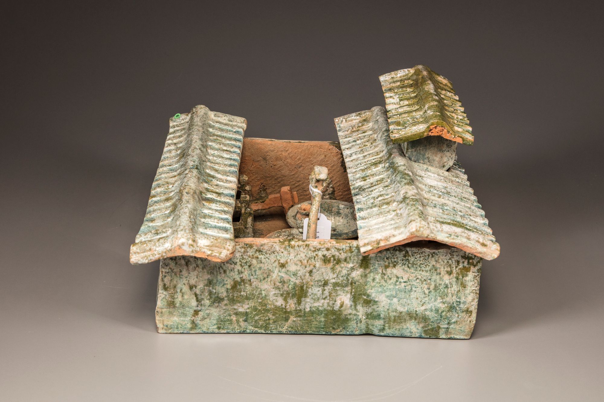The interior of the building contains a grinding stone, water well oven storage building and a levered mechanism for pounding cereals, covered with an iridescent green glaze.