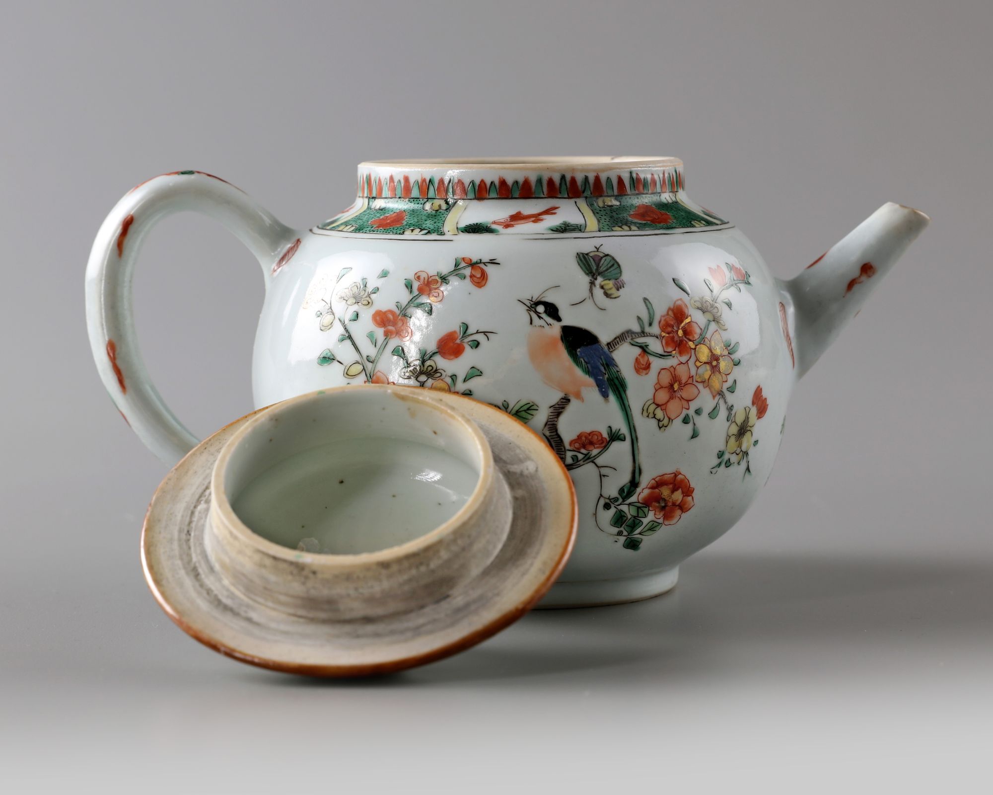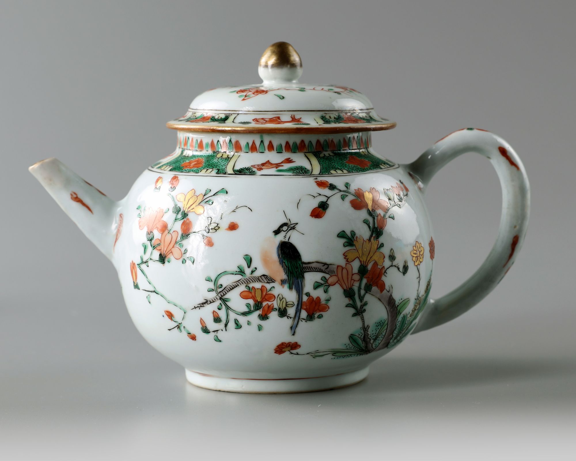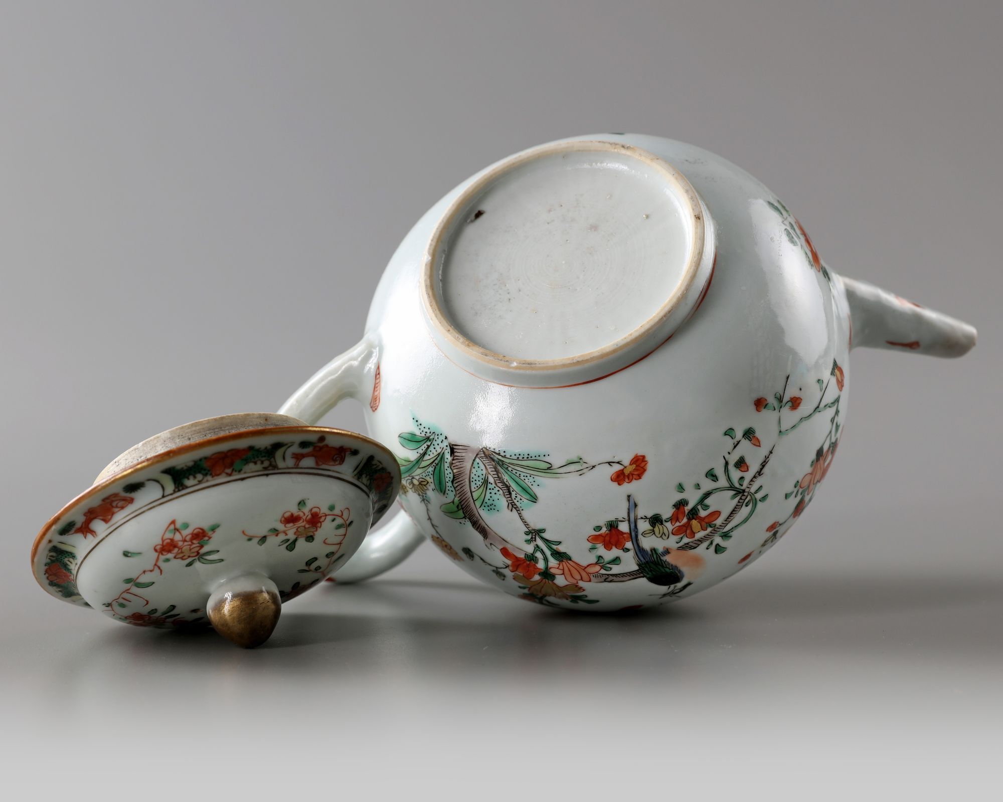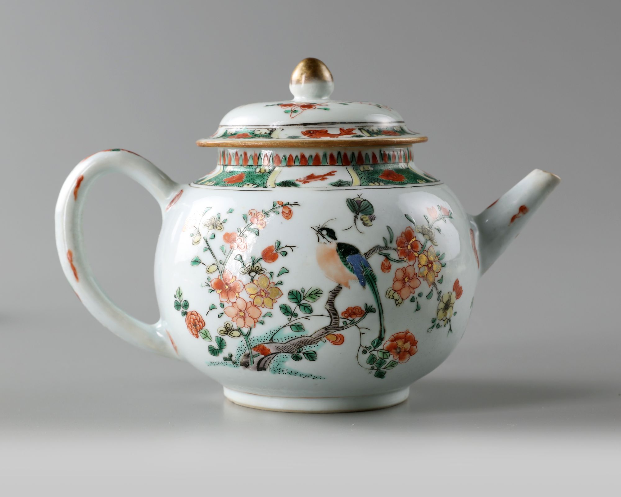 The globular teapot is decorated with bird perched on flowering branches and below butterflies in flight, all below a seeded floral band with cartouches enclosing fish. The slightly domed cover is similarly decorated and surmounted by a gilt lotus bud finial.
