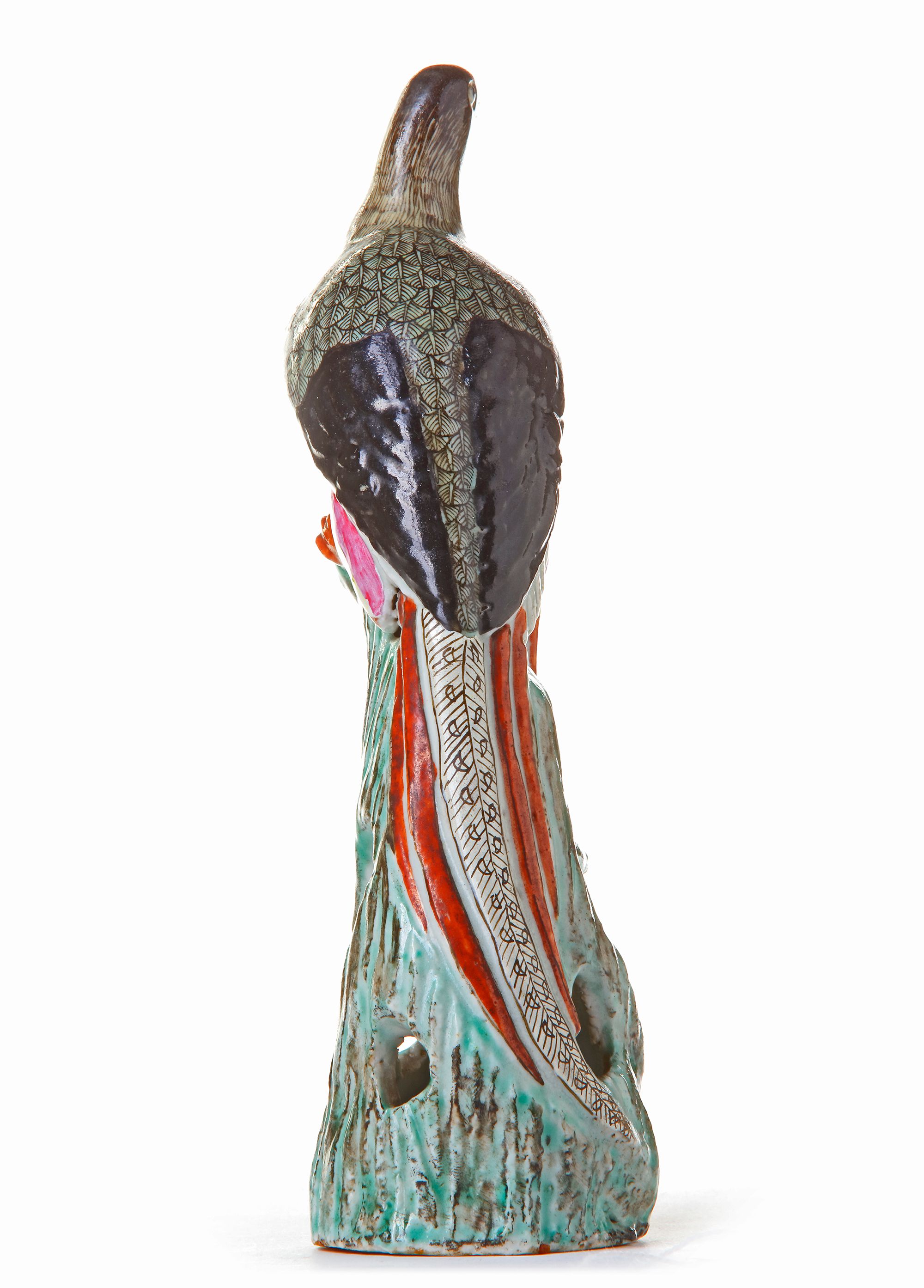 The pheasant stands upright on one leg, with the other leg tucked underneath the wing, upon an openwork rockwork base. 20.1 cm high