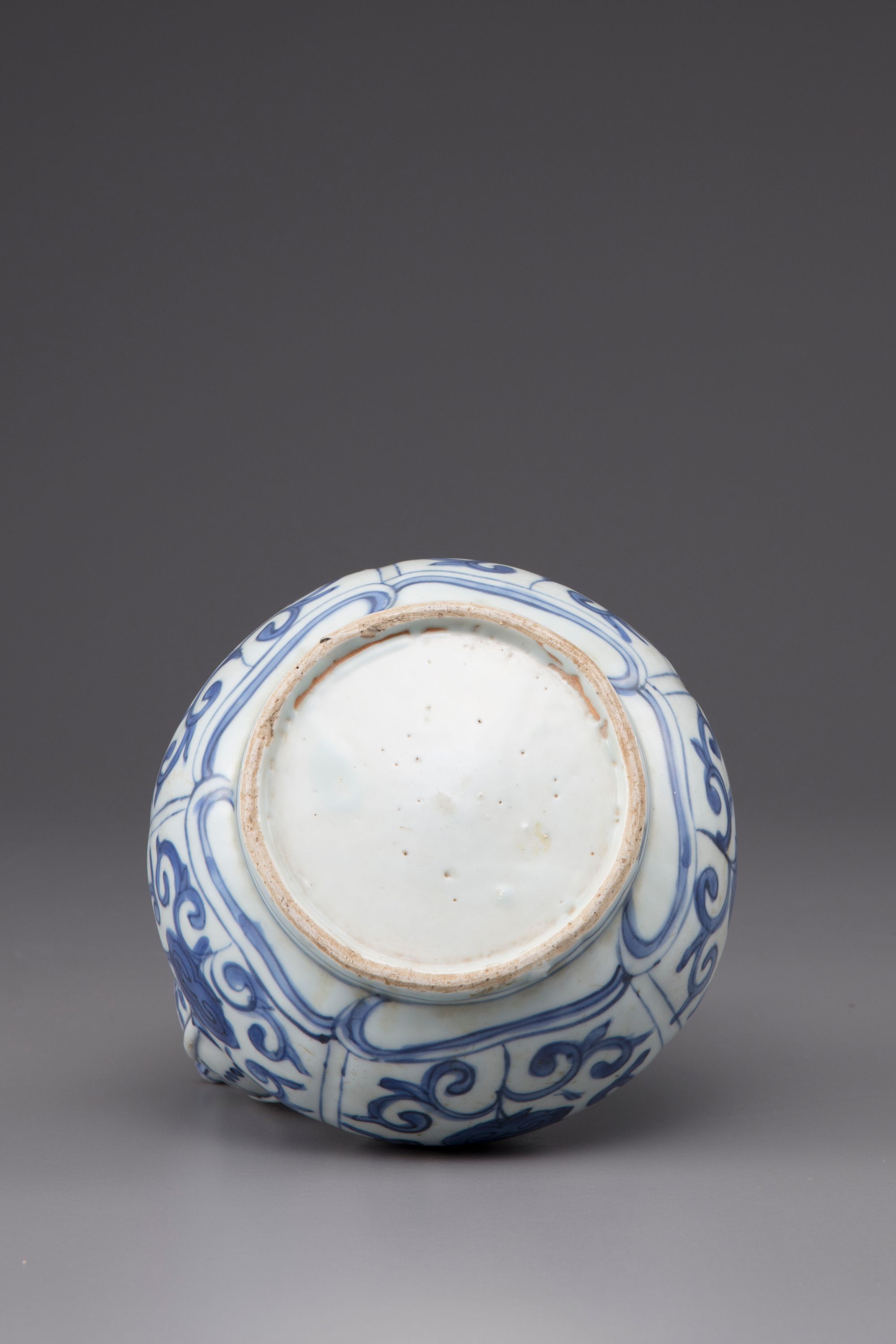 With rounded sides, decorated in underglaze blue with lotus and precious goods.