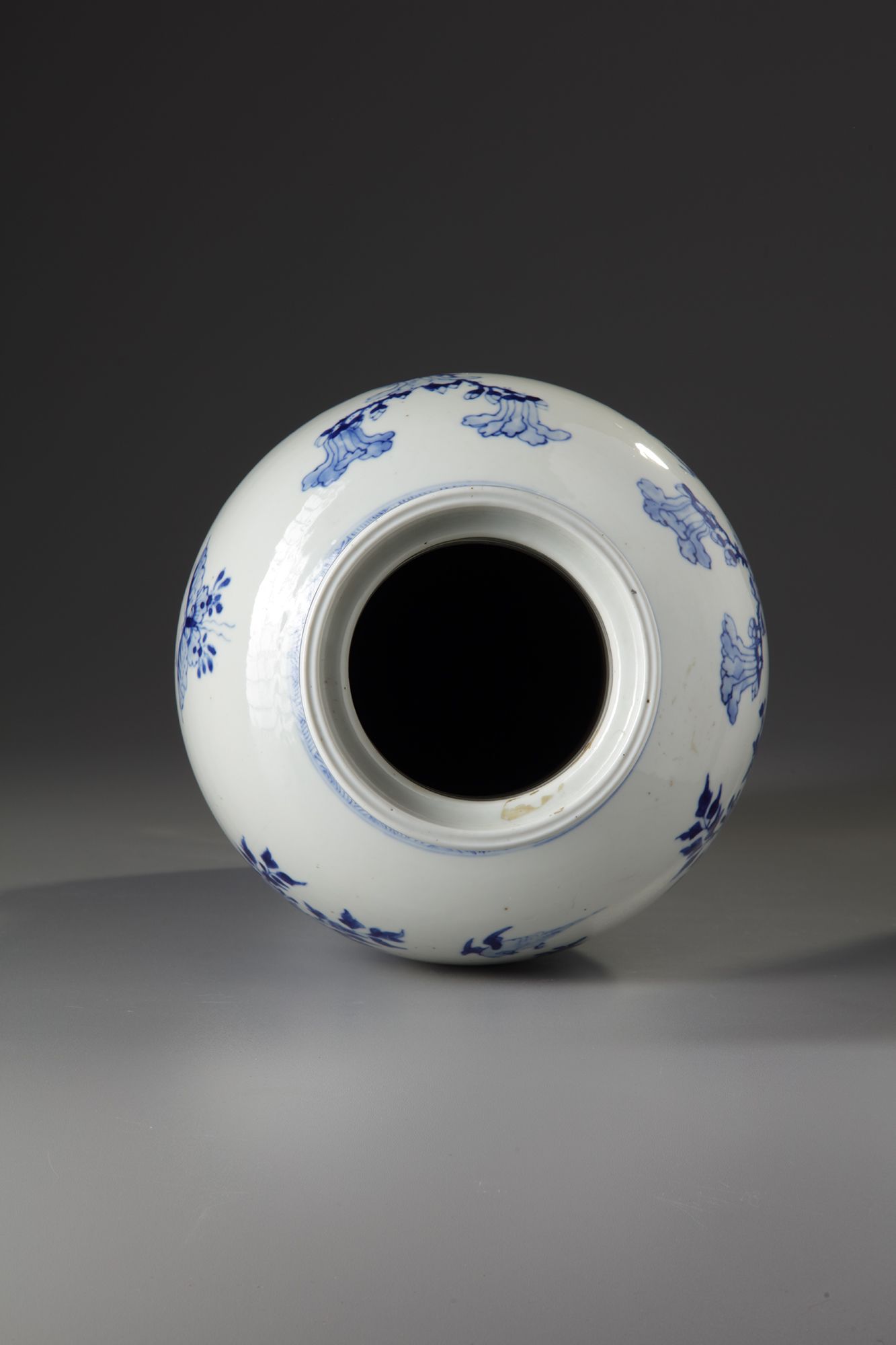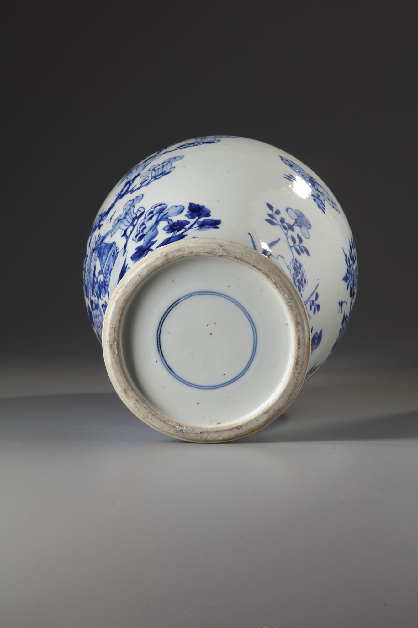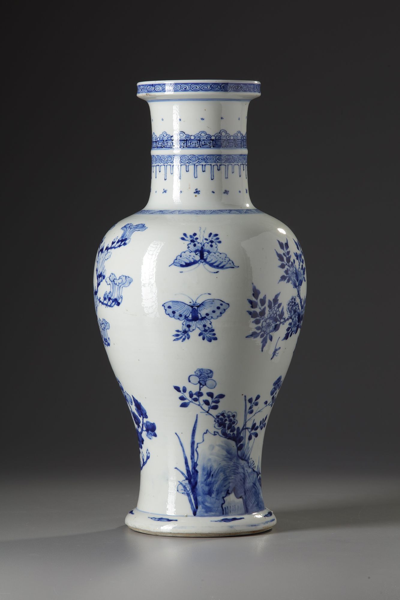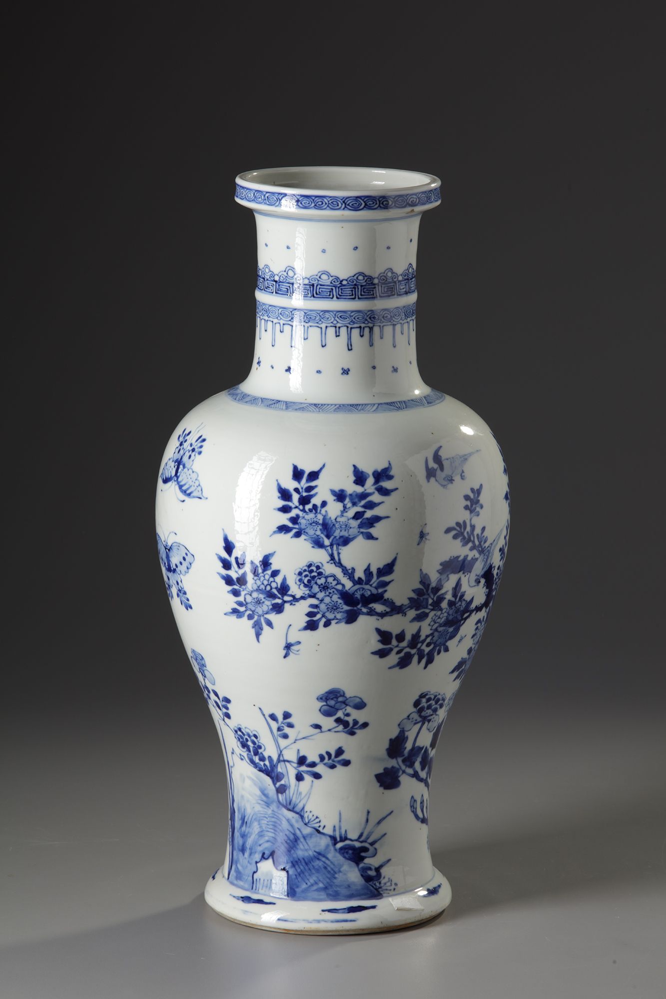 The slender baluster vase is decorated to the body with butterflies in flight amongst blossoming flowers. The base bears a double circle in underglaze blue.