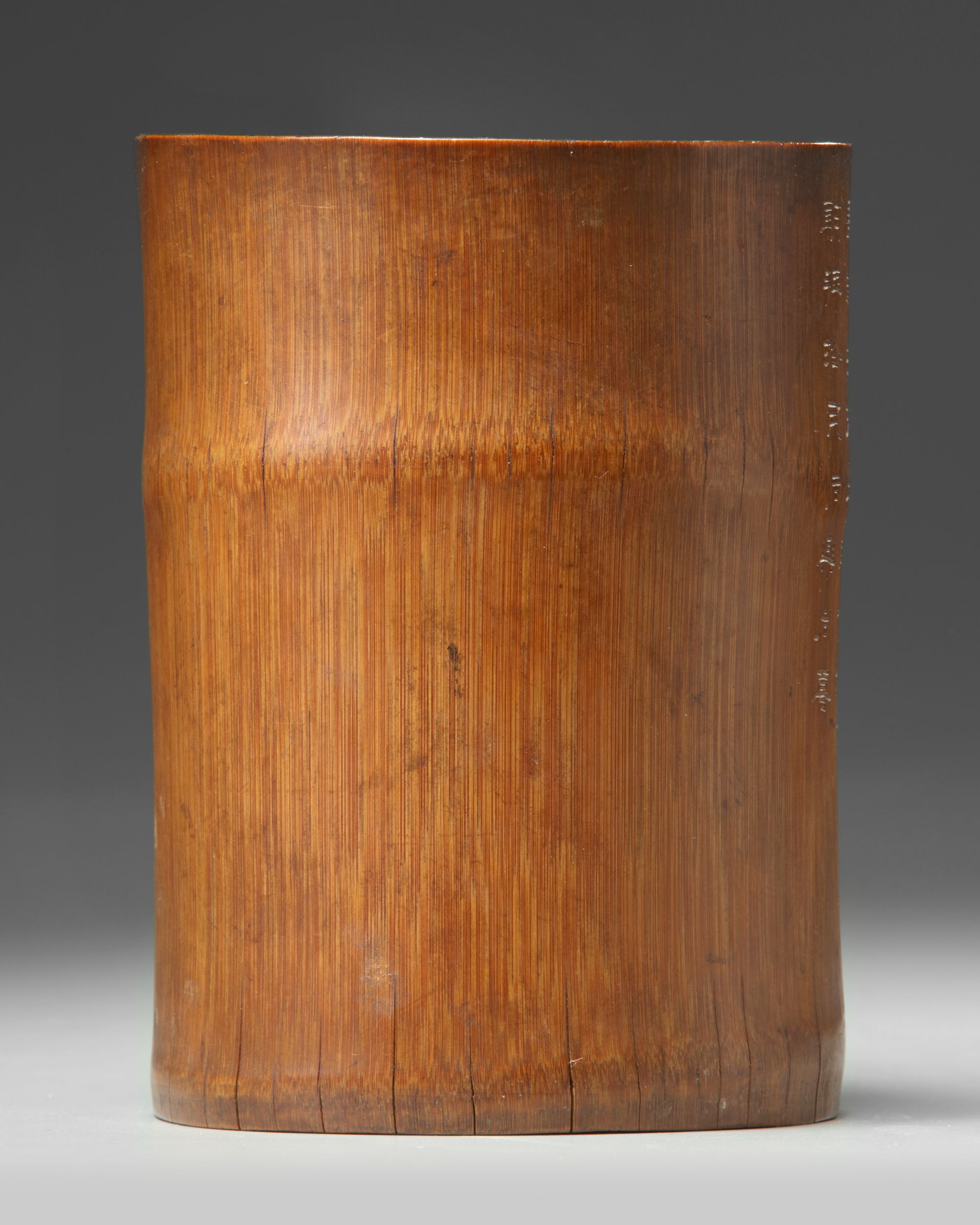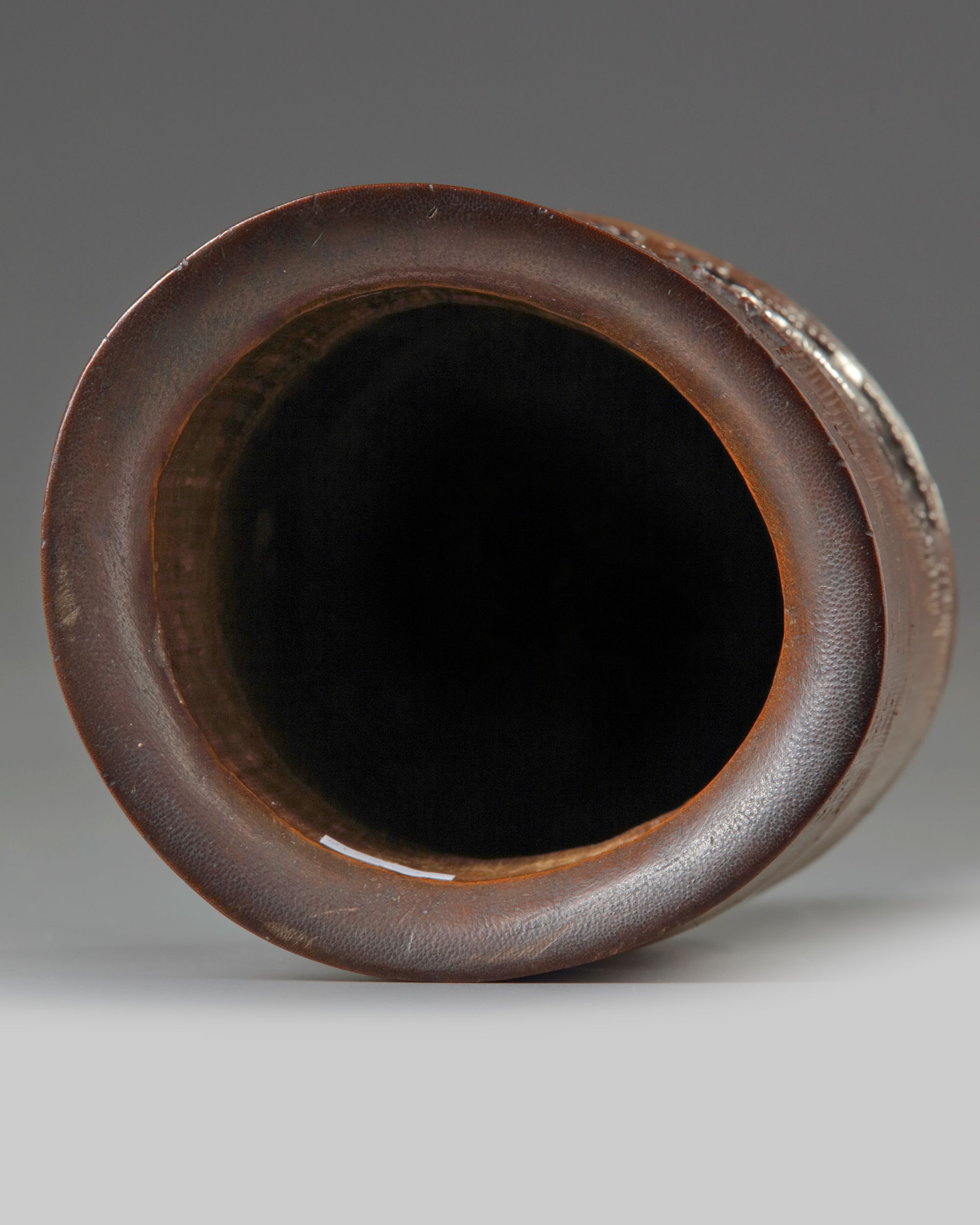The brush pot is carved to the exterior with a scene of Taming Tiger Luohan in a grotto, in one hands he holds a ring and is carved with a tiger facing him. The area surrounding the grotto is carved with inscriptions.