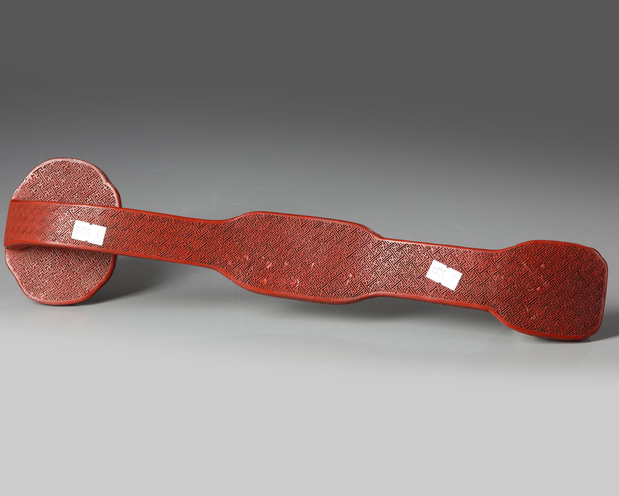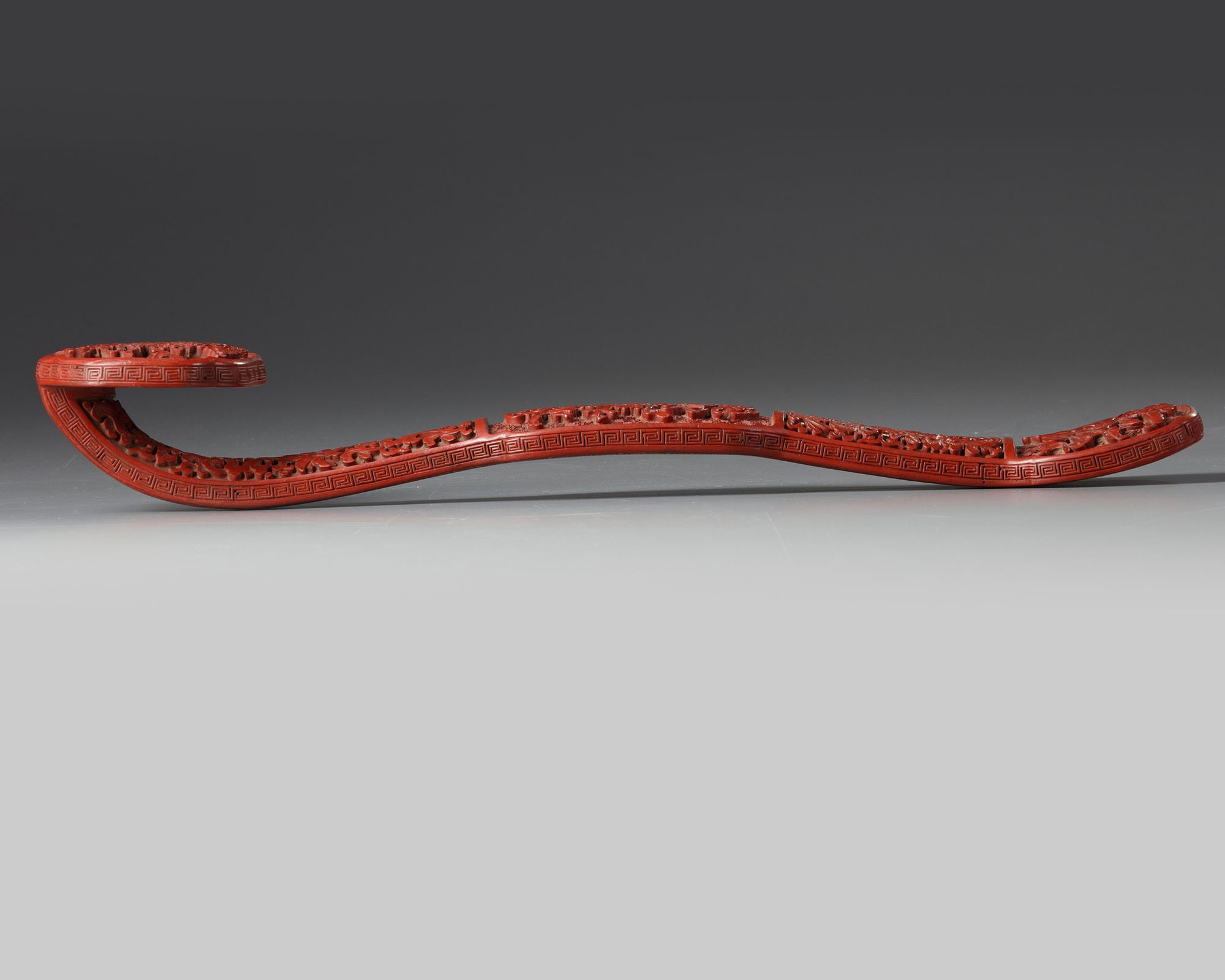 The ruyi-head terminal carved with a phoenix amongst clouds, the slightly arched shaft carved in relief with central panels enclosing Fu bats and precious objects.