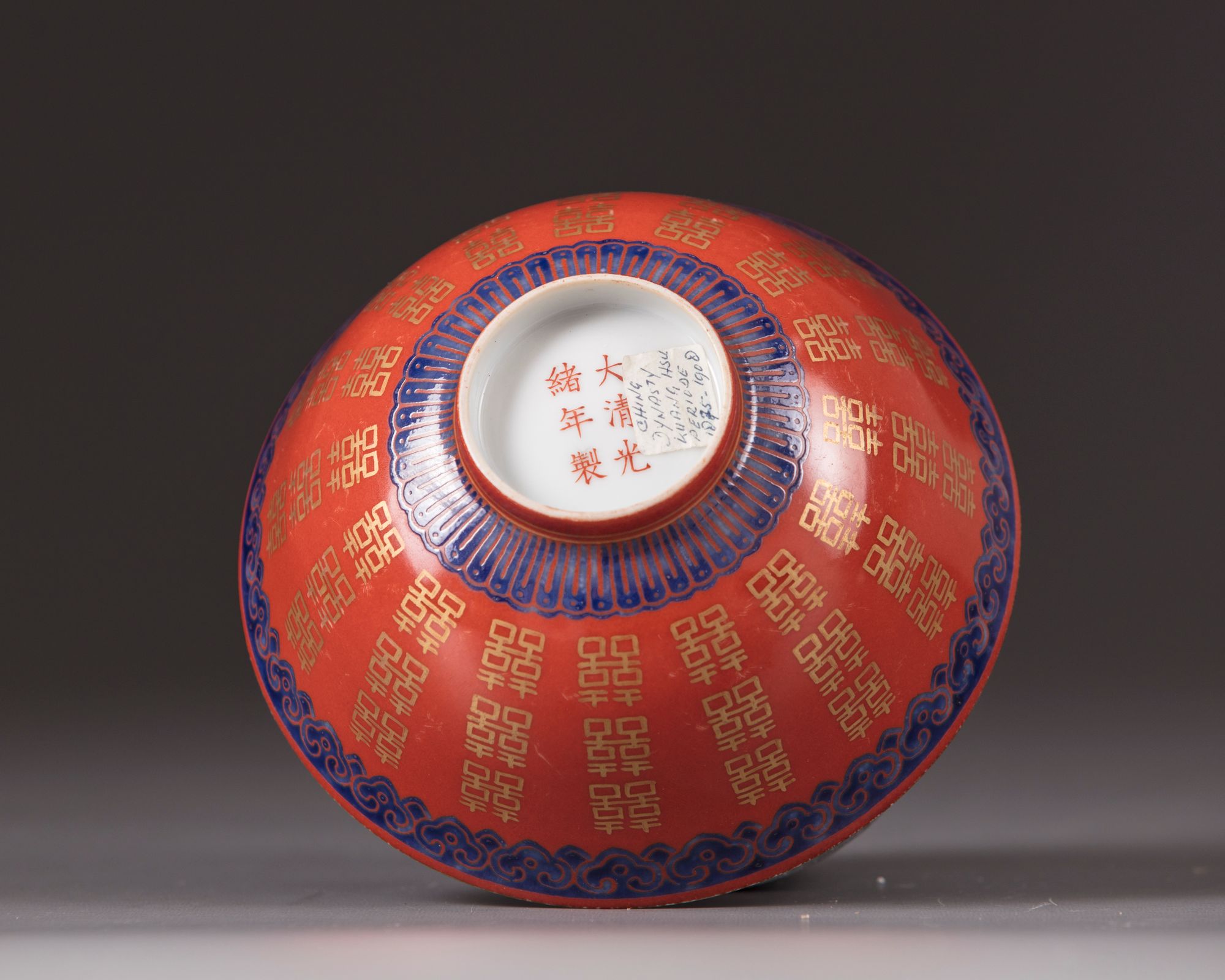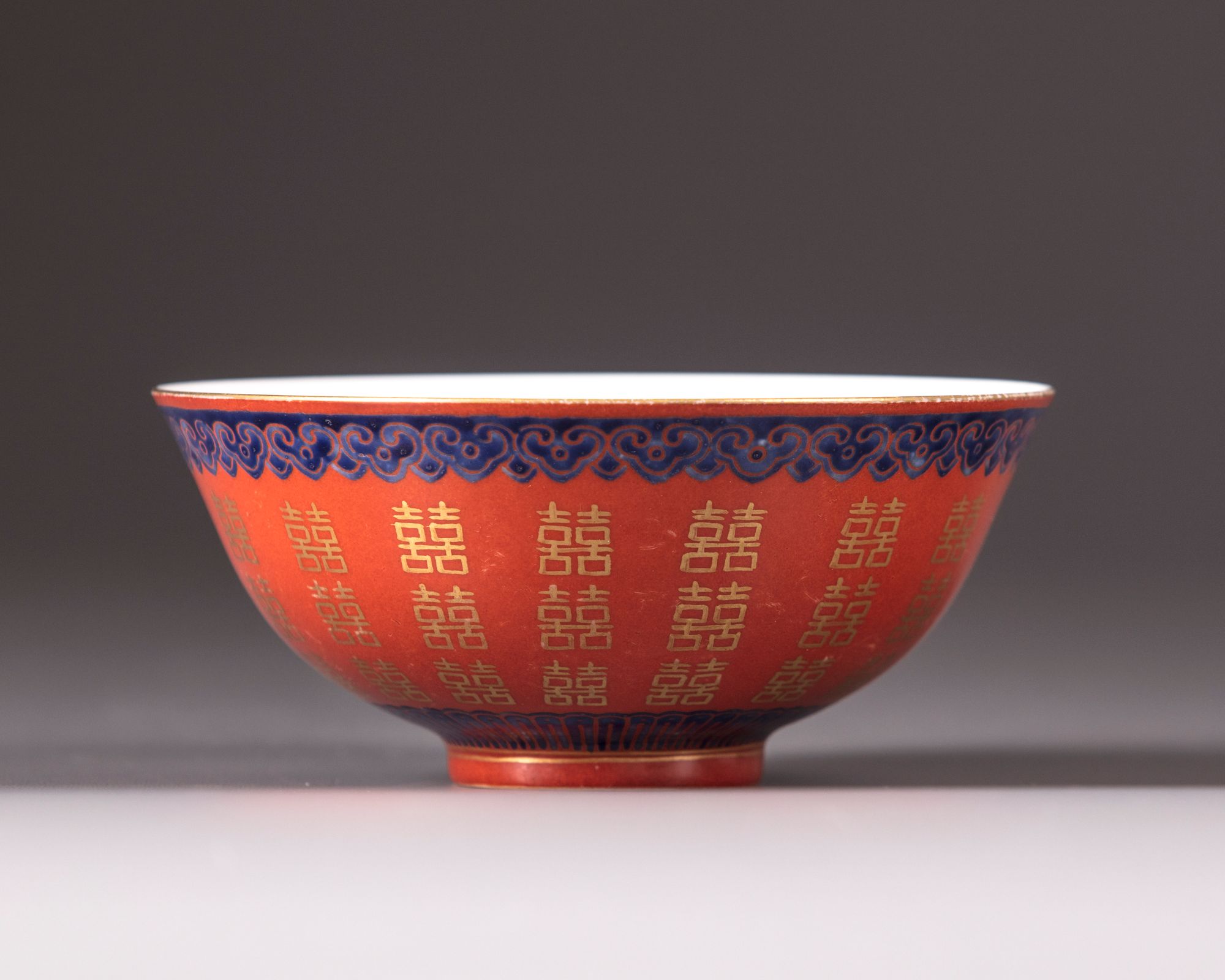 Decorated with double happiness characters, set between a band of 'Ruyi' heads to the rim and a upright plantain leaves to the base.