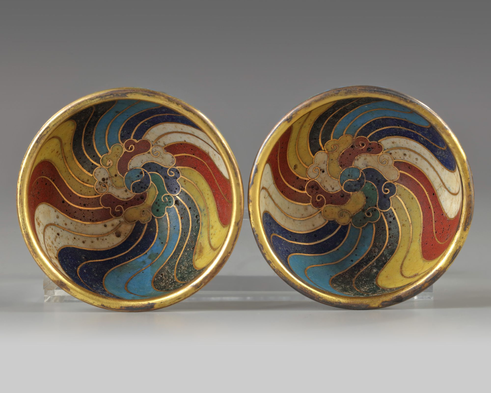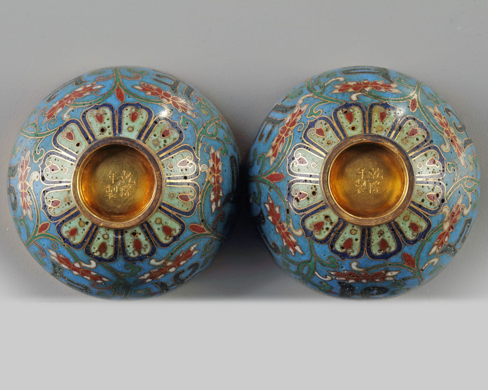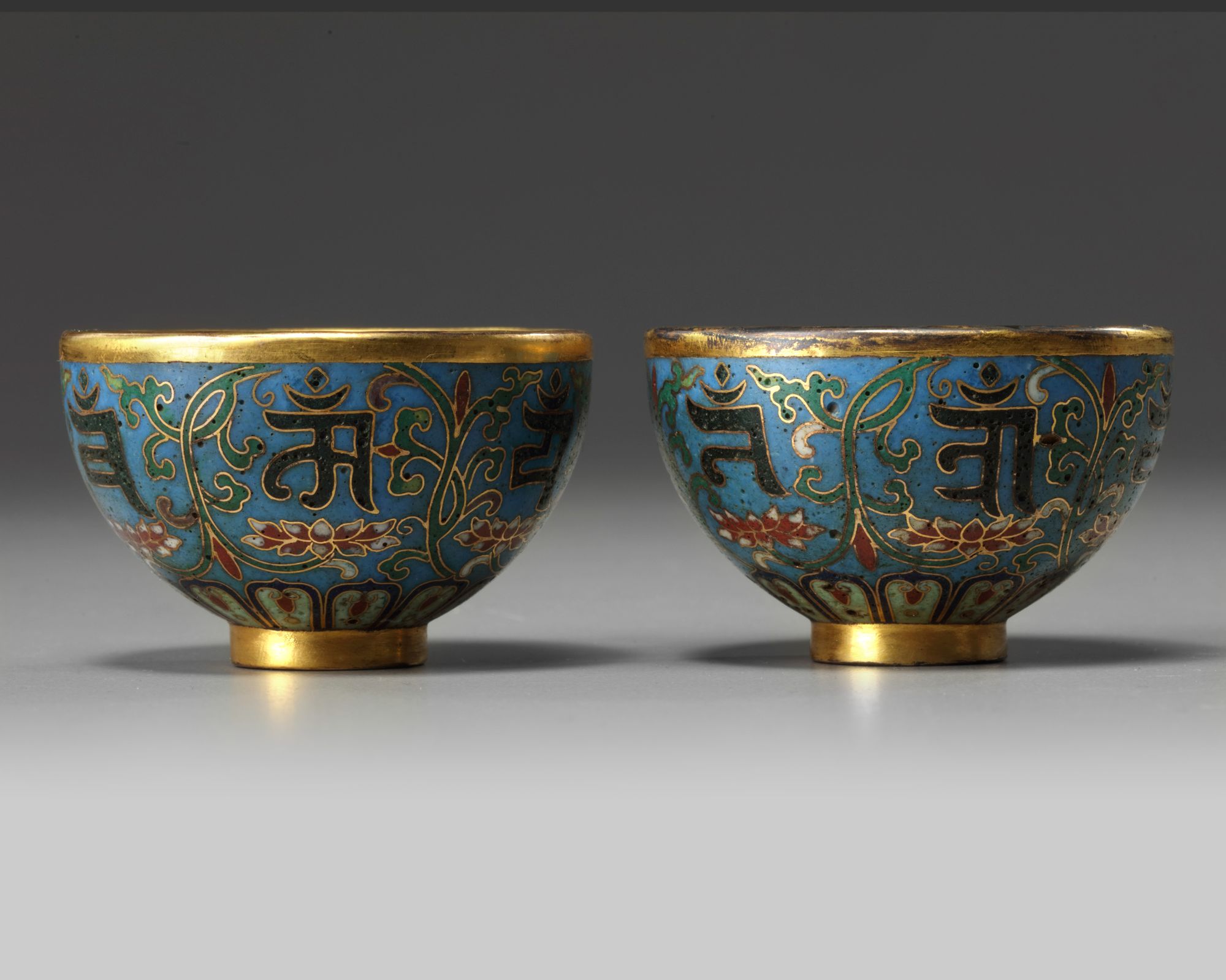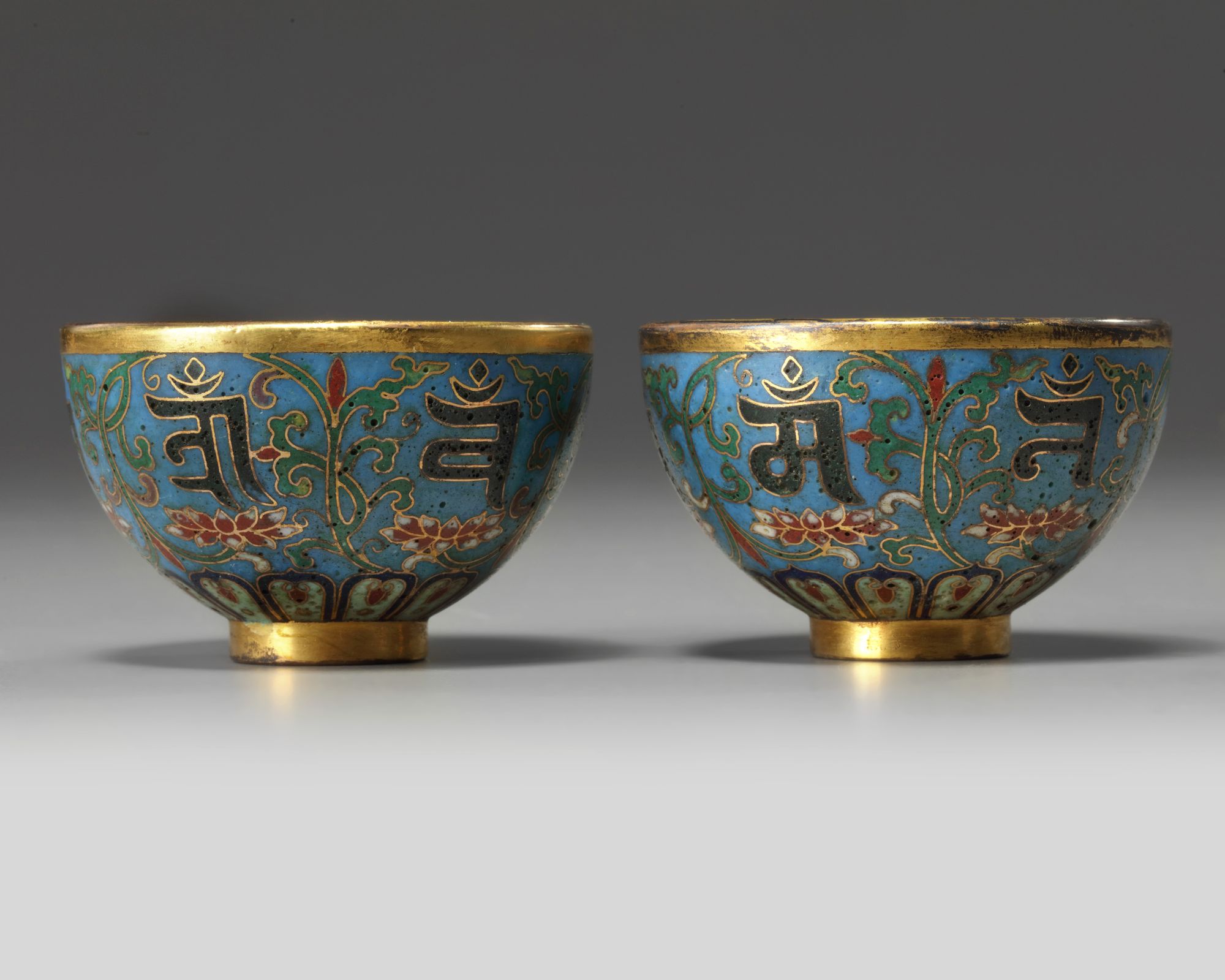 Each cup is decorated to the exterior with lanca characters supported on lotus blossoms growing from scrolling leafy stems, all above a lappet band at the foot. The interior is decorated in various enamels with a flower head radiating further wavy panels. Each base with an incised 'Qianlong nianzhi' mark.