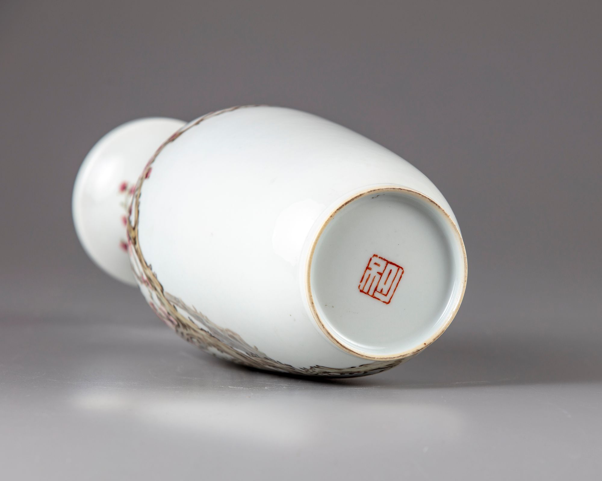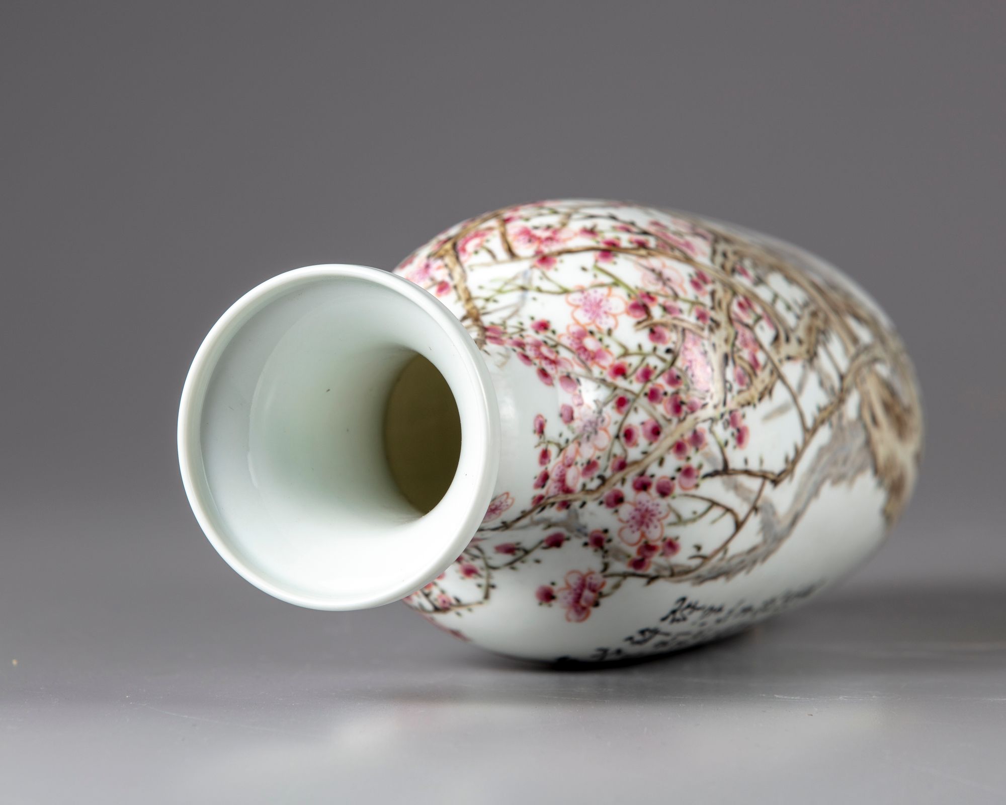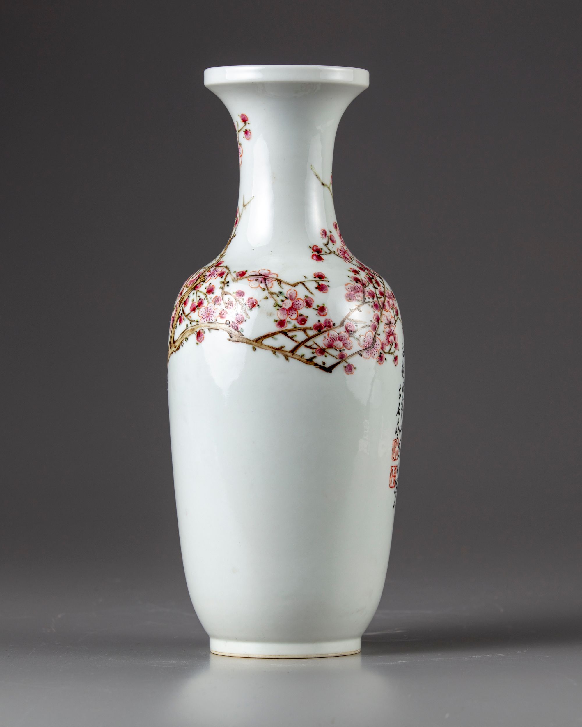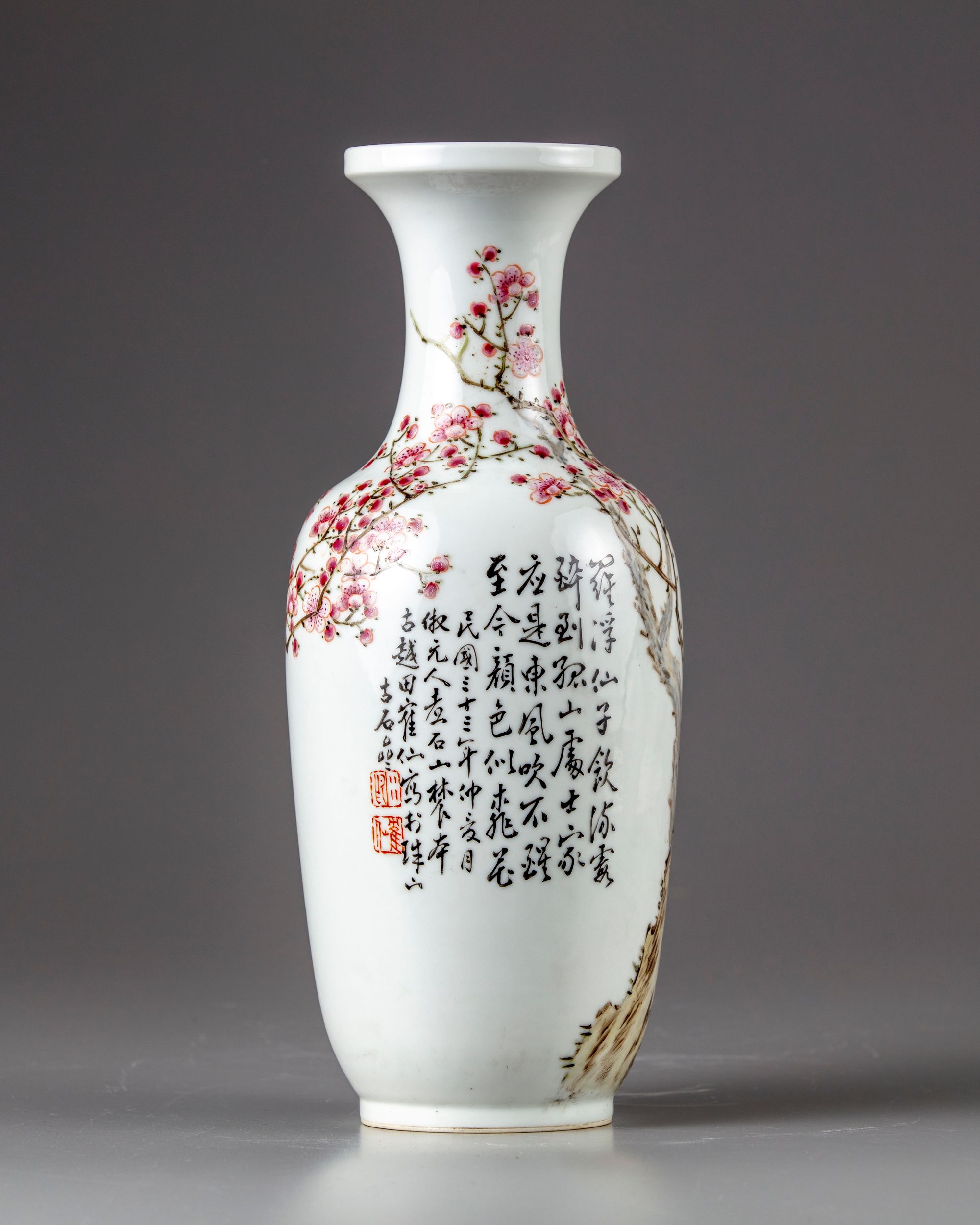 The vase with narrowed neck and flaring mouths decorated to the body with a large cherry blossoms, the reverse with a Chinese calligraphy "poems" about peach blossoms and dated 33rd year of the republic. With the signature of Tian Hexian and two seal.