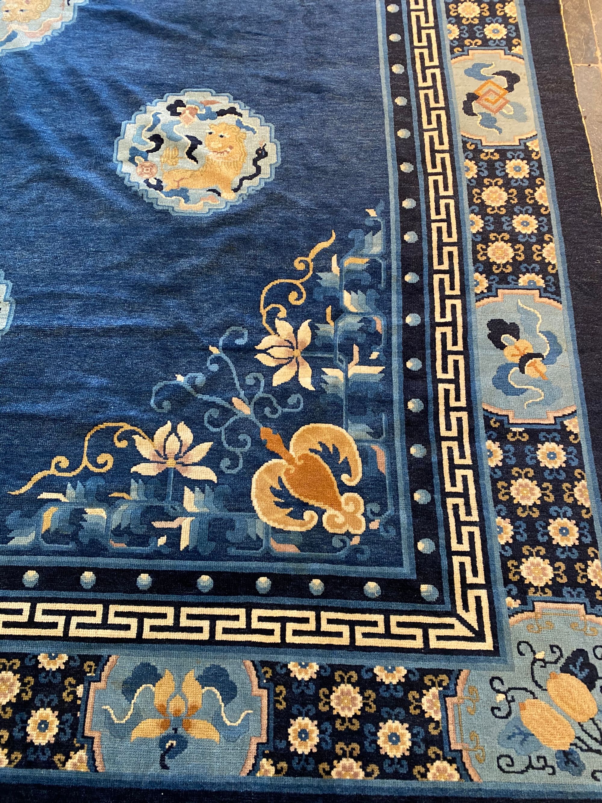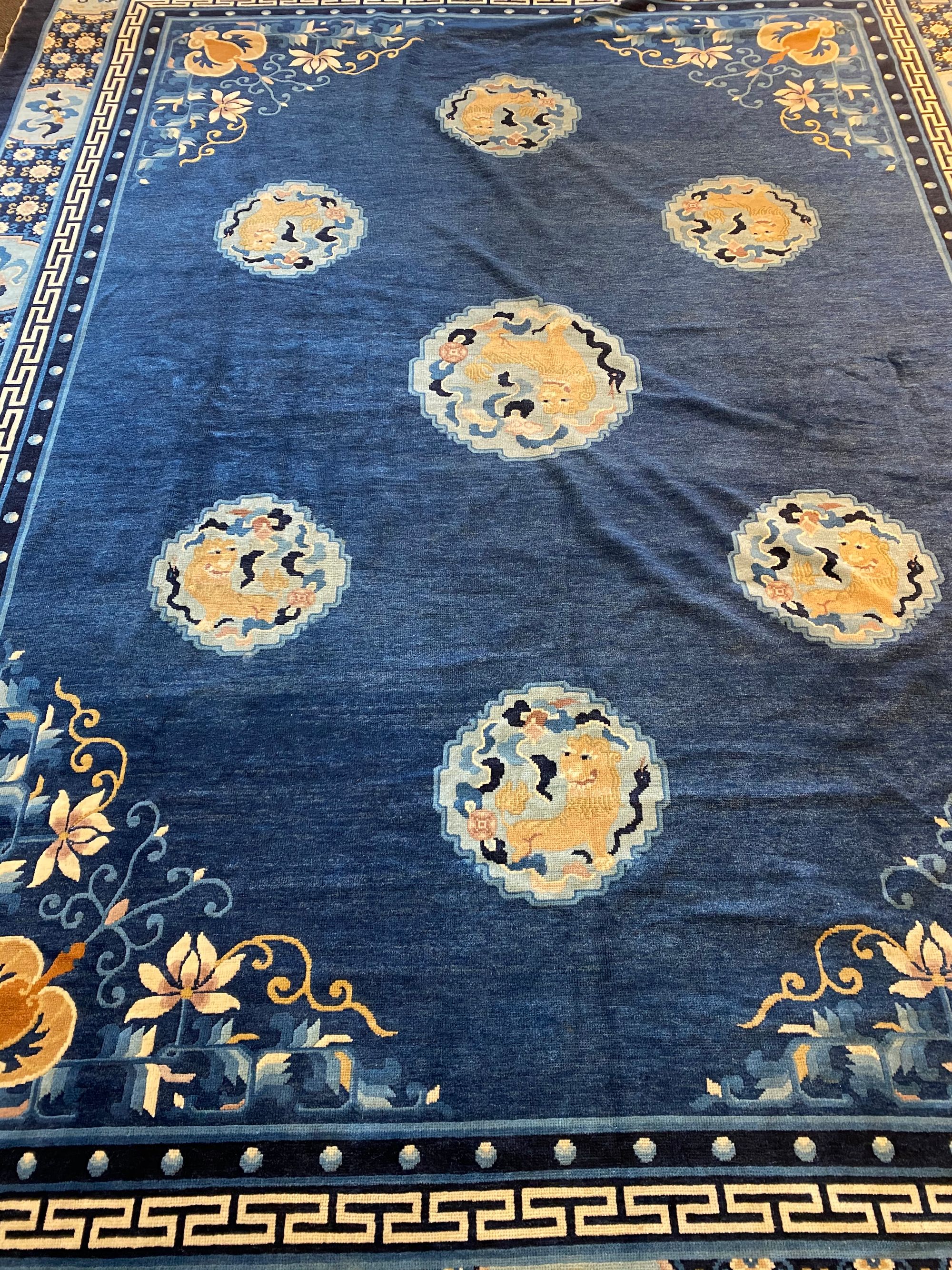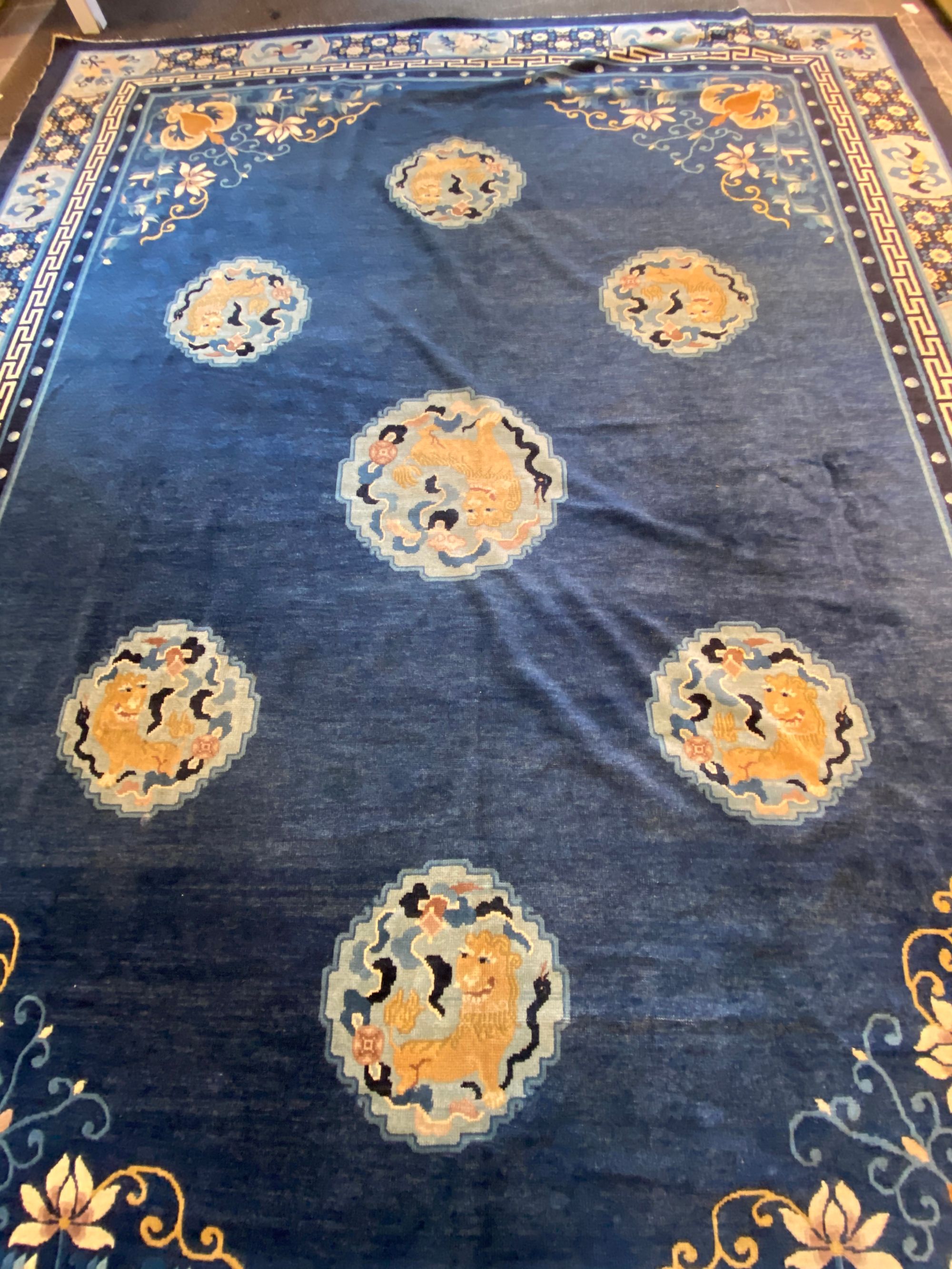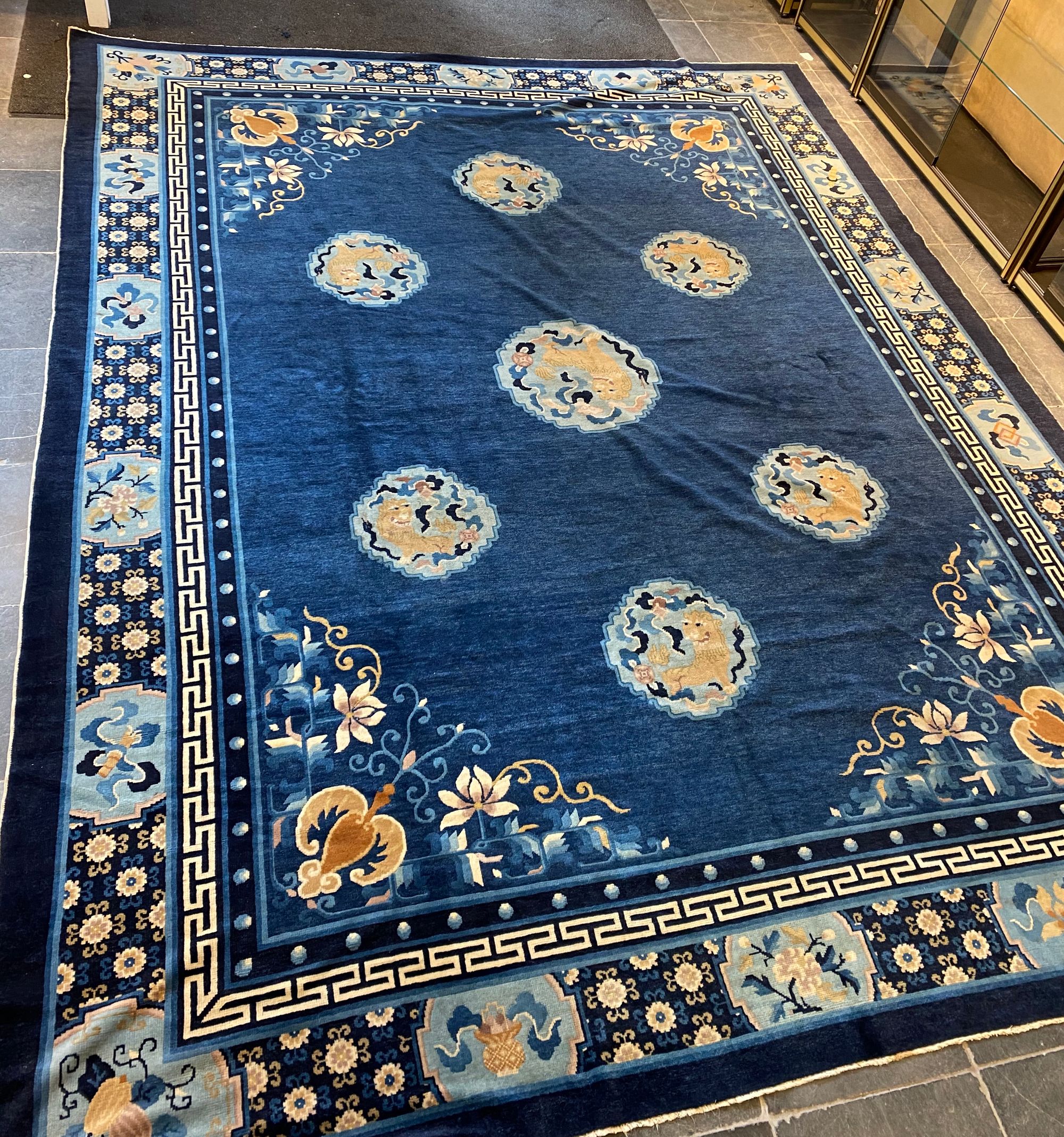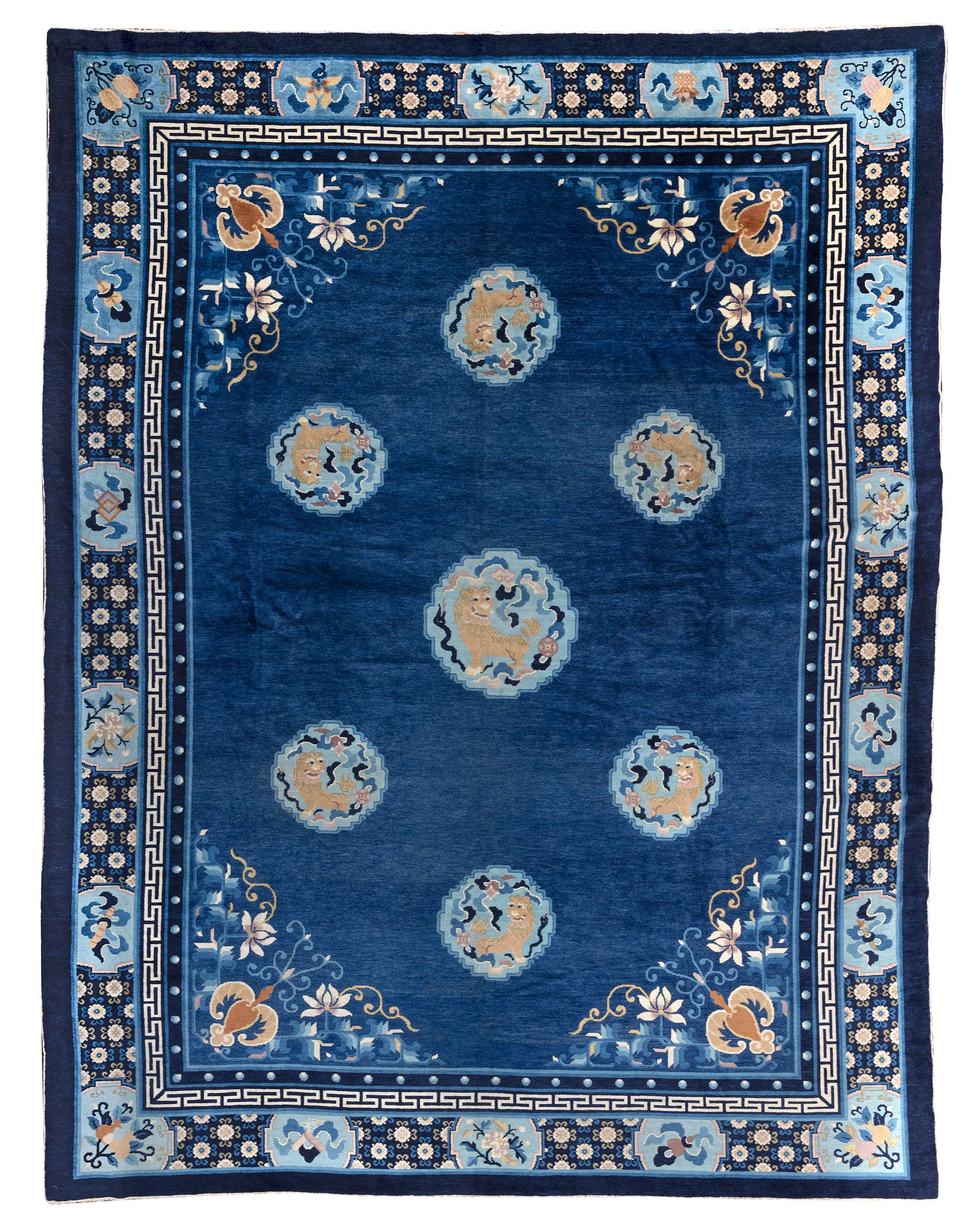 A Chinese peking carpet, designed with roundels of Buddhist lions of a deep blue ground, a border of cartouches enclosing flower sprigs and Buddhist emblems.