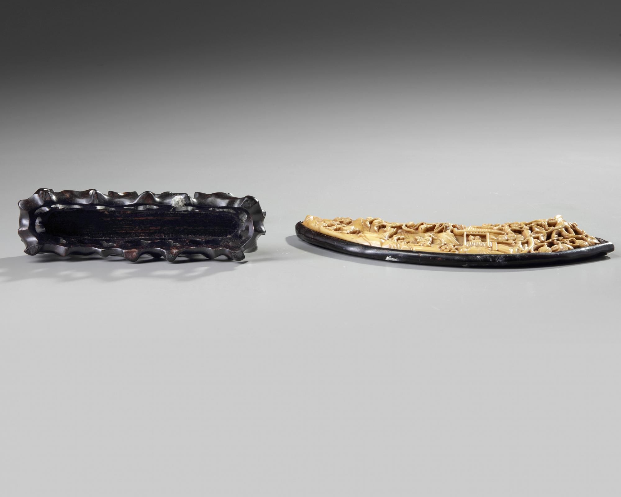 The curved tapered tusk is carved and pierced with Shoulao and his attendants carrying large peaches amongst pavilions and peach trees, and the base is carved with an openwork melon on branch design. The tusk is set within a wood frame which sits on a carved and pierced wood stand.