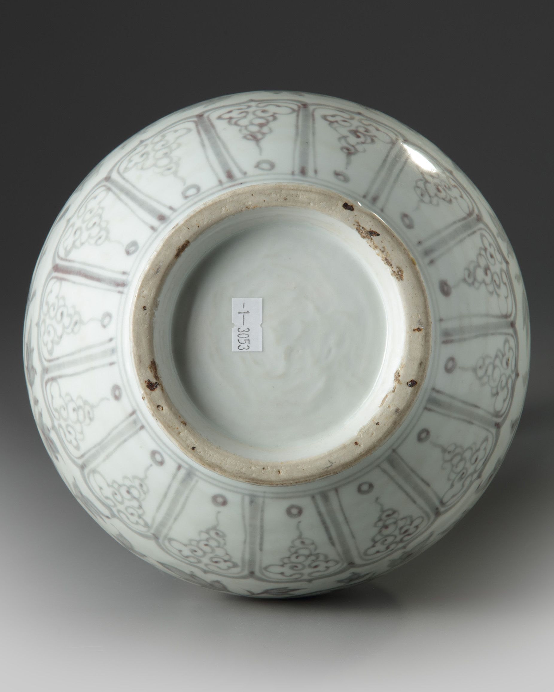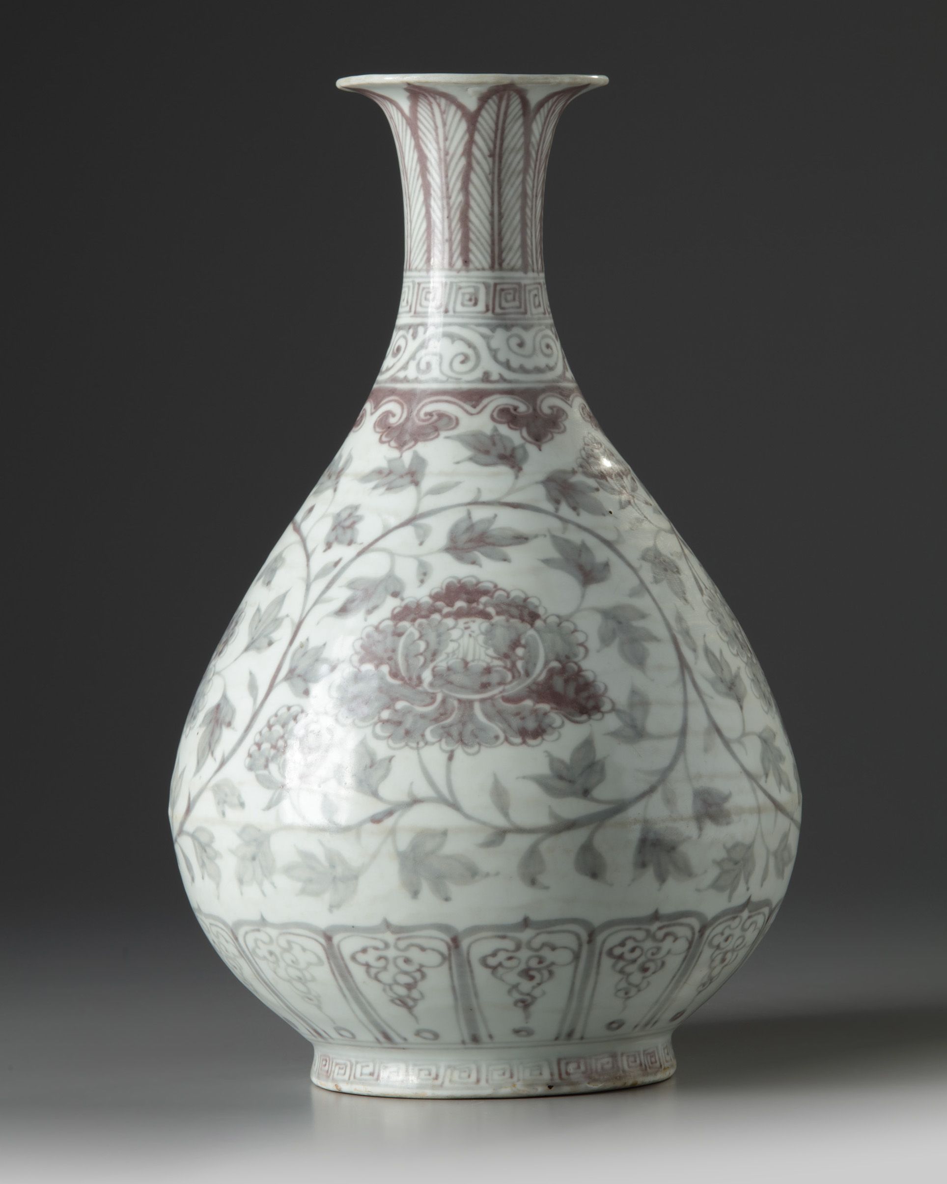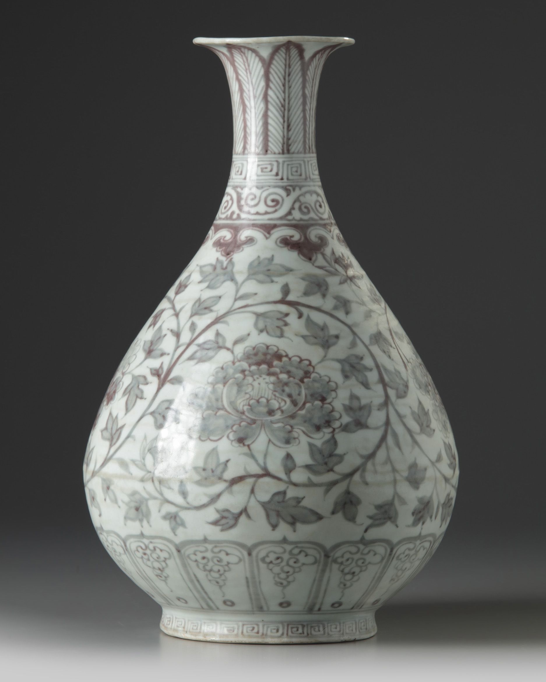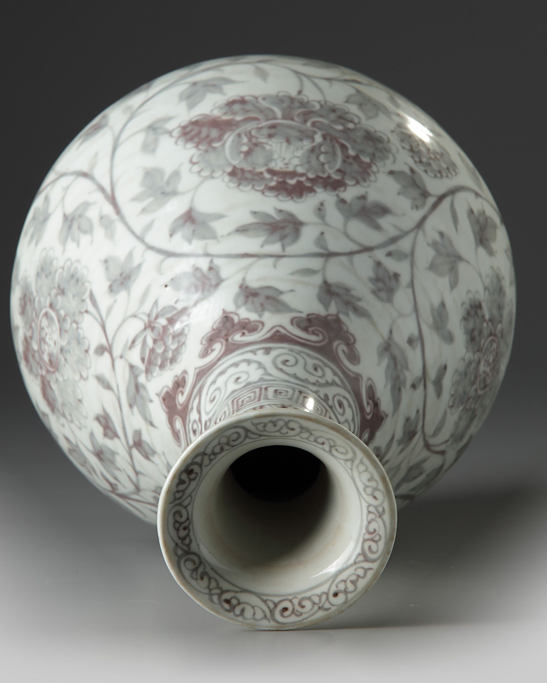 The pear-shaped body is decorated with copper tones which have fired greyish-red, depicting an undulating peony meander bearing four full-faced and in profile blooms. The flowers grow from scrolling stems bearing pointed foliage and further smaller blossoms, all above a border of lotus petal lappets containing ruyi-head pendants, and a keyfret band at the foot. The waisted neck is decorated with a border of trefoils beneath a classic scroll and key fret bands, all below overlapping plantain leaves at the neck, and a further scroll atop the rim.