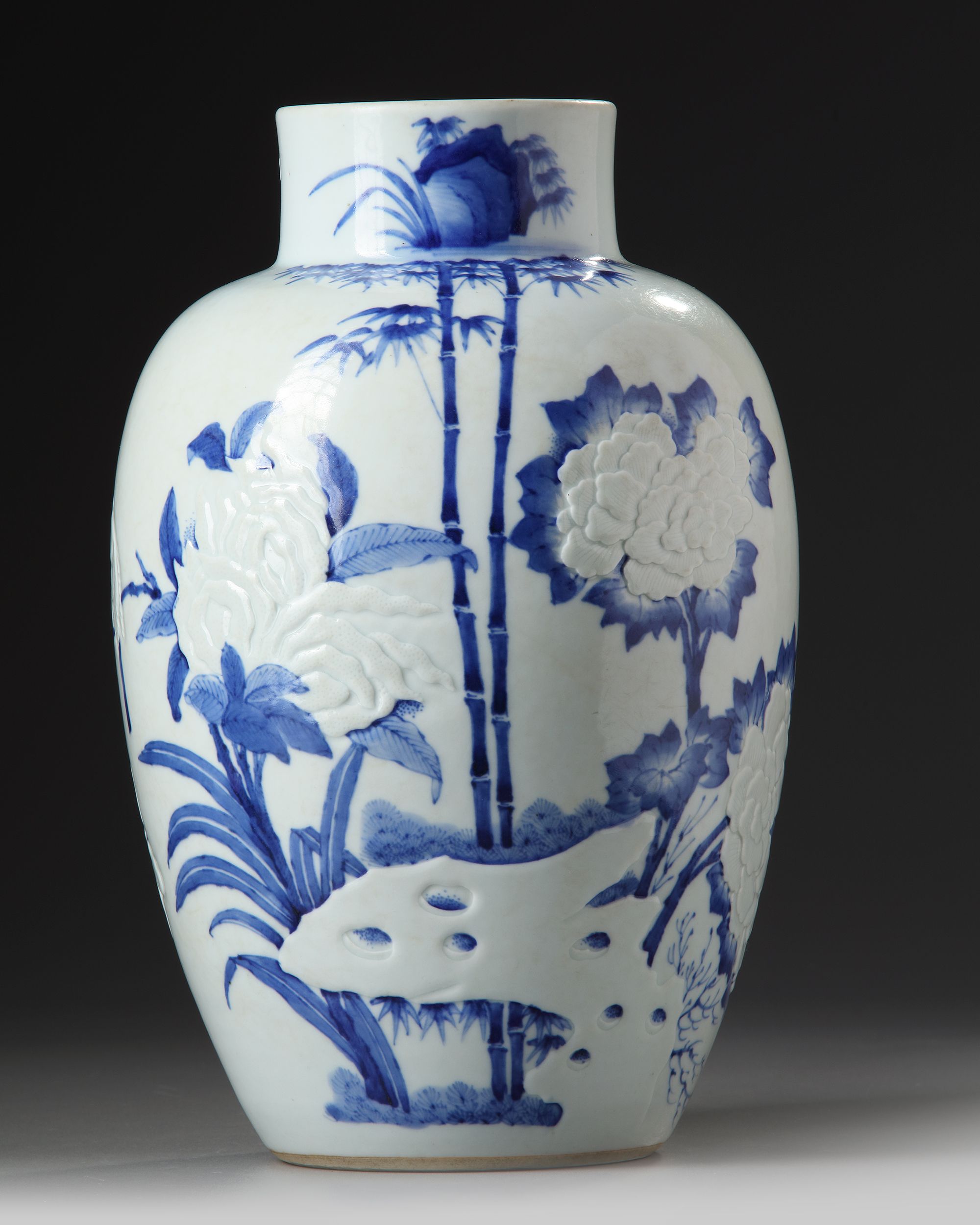 A Chinese porcelain jar, decorated in blue and white with a bird perched on peony and chrysanthemum flowering branches with bamboo trees growing from ornamental rocks in low relief.