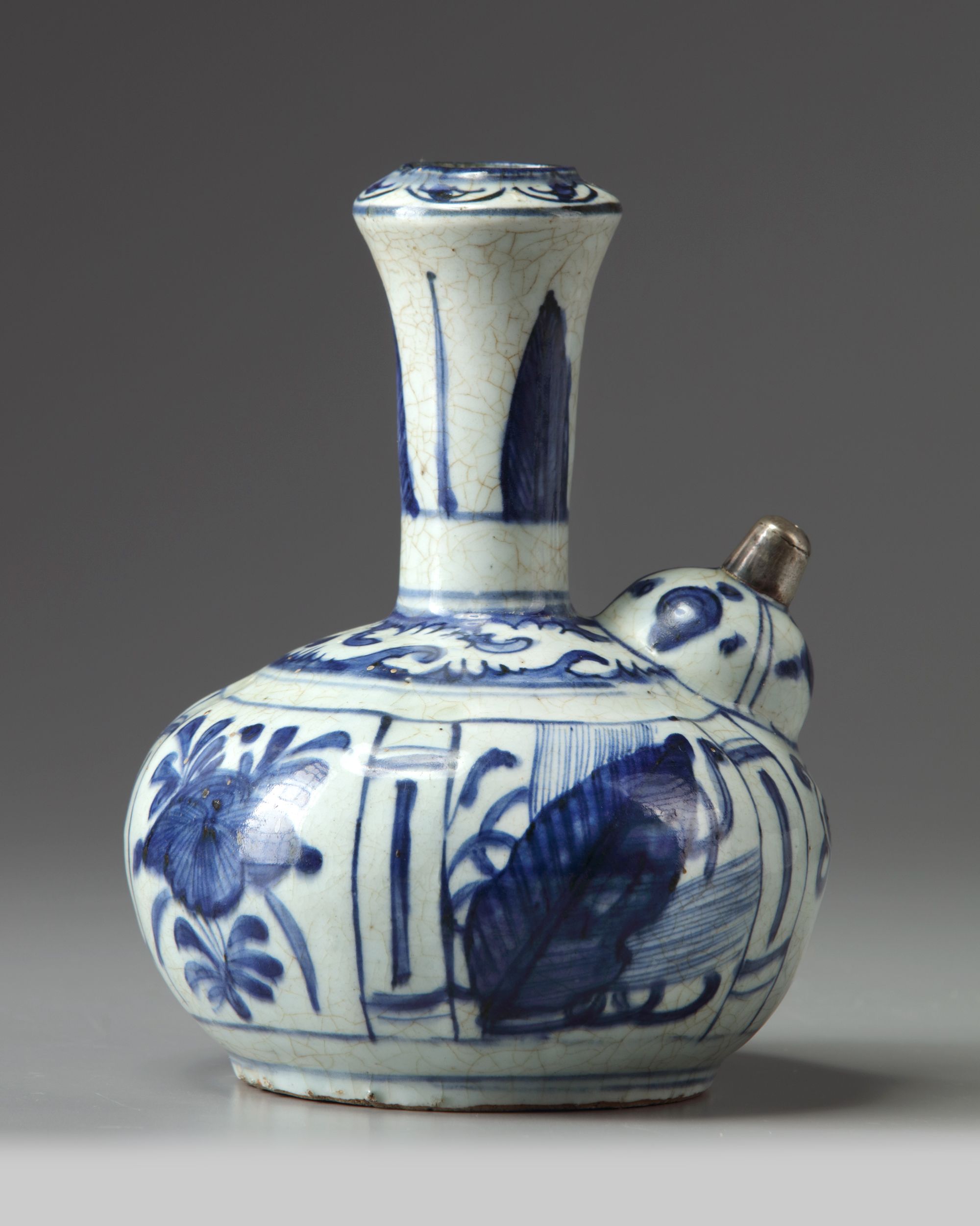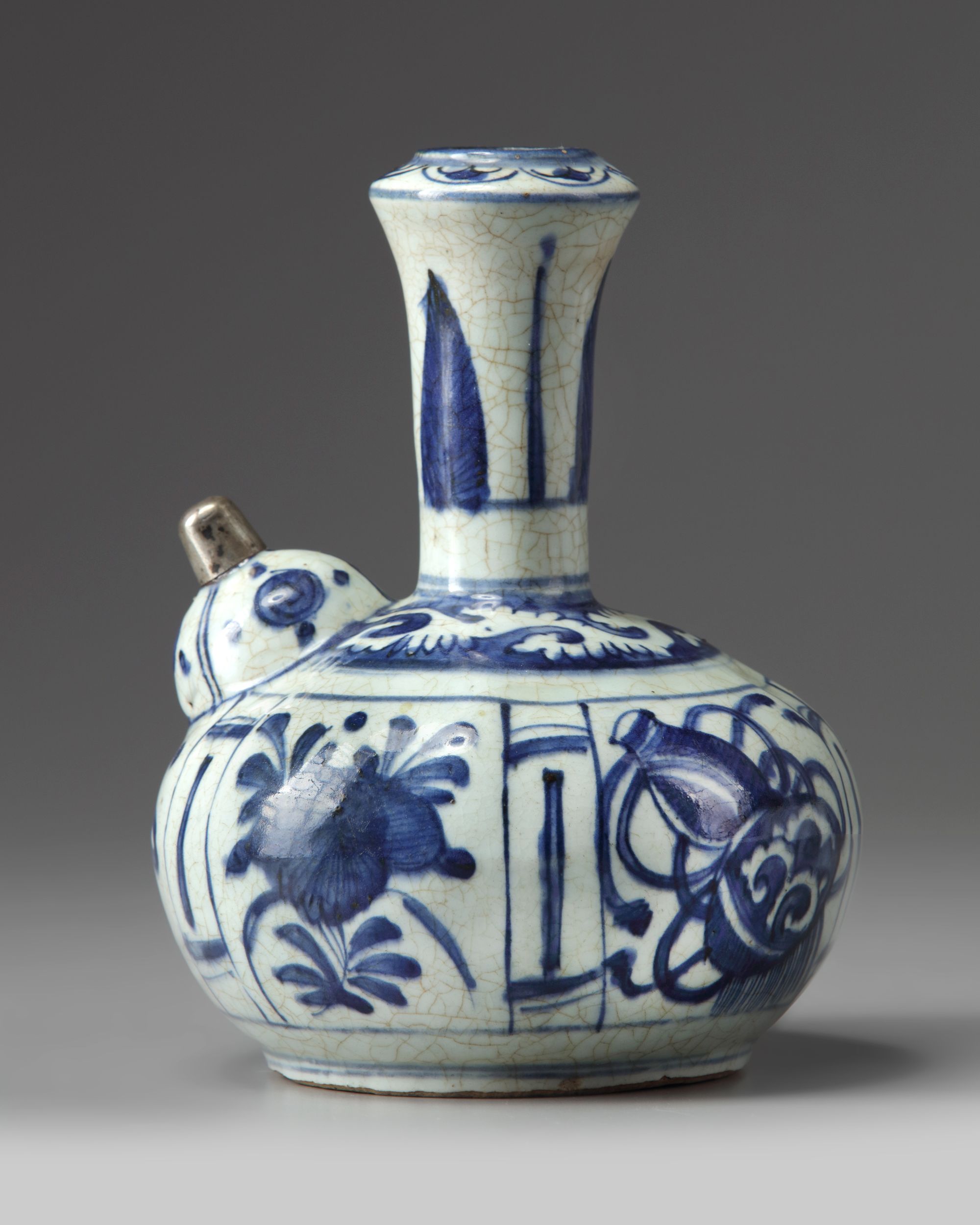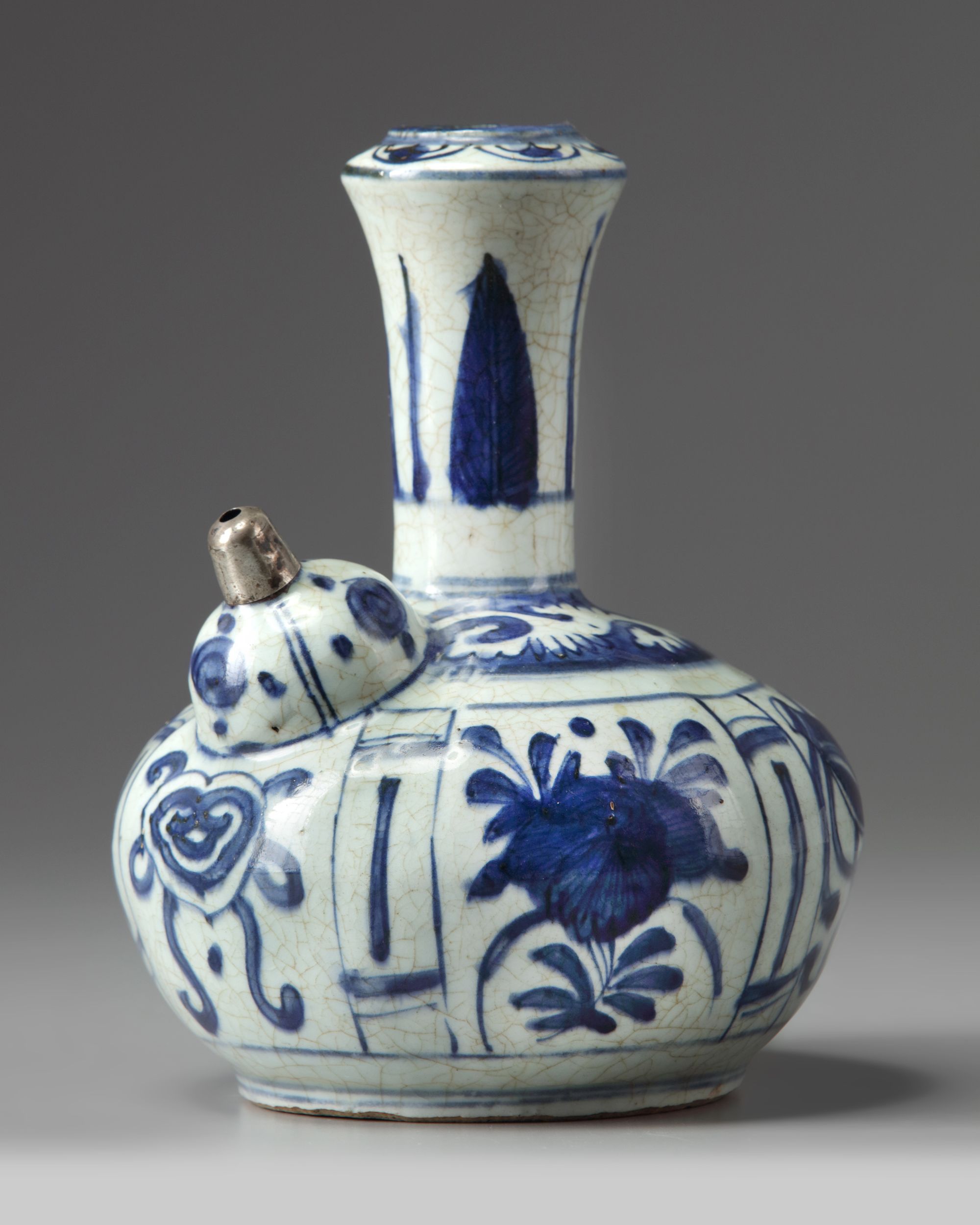 The piece is decorated to the body with moulded panels enclosing precious objects and flower sprays, all below a classic leaf scroll in reserve. The tapered neck is decorated with stiff leaves. The tip of the spout is mounted in silver.