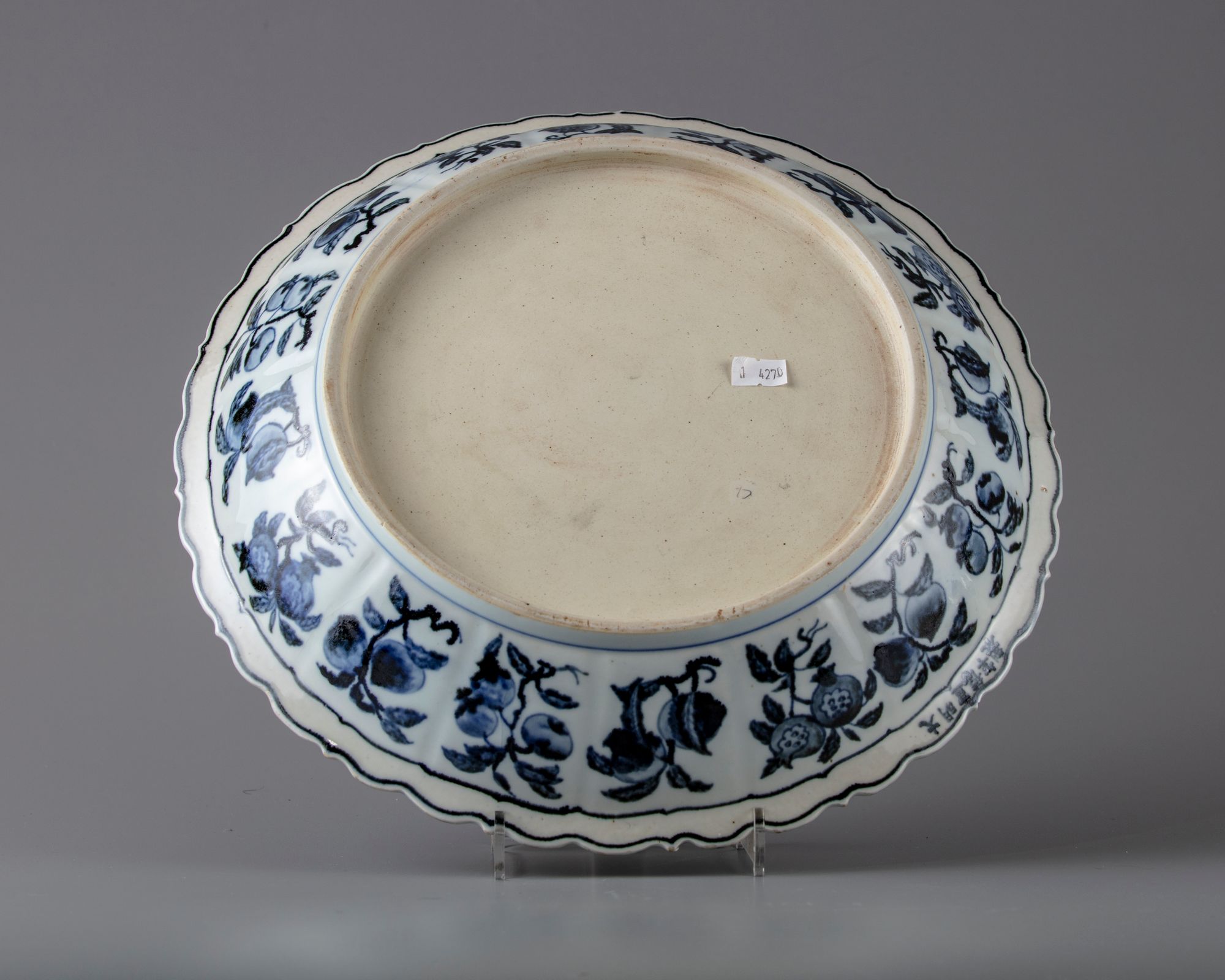 The dish is deocrated with ab irds perched on a fruiting branch with a roundel, the cavetto to the exterior and the interior with alternating branches of the " Three abundances" fruiting peach, finger citron and pomegranate.The barbed rim with a flower scroll. All reserved on a crackled ground.
